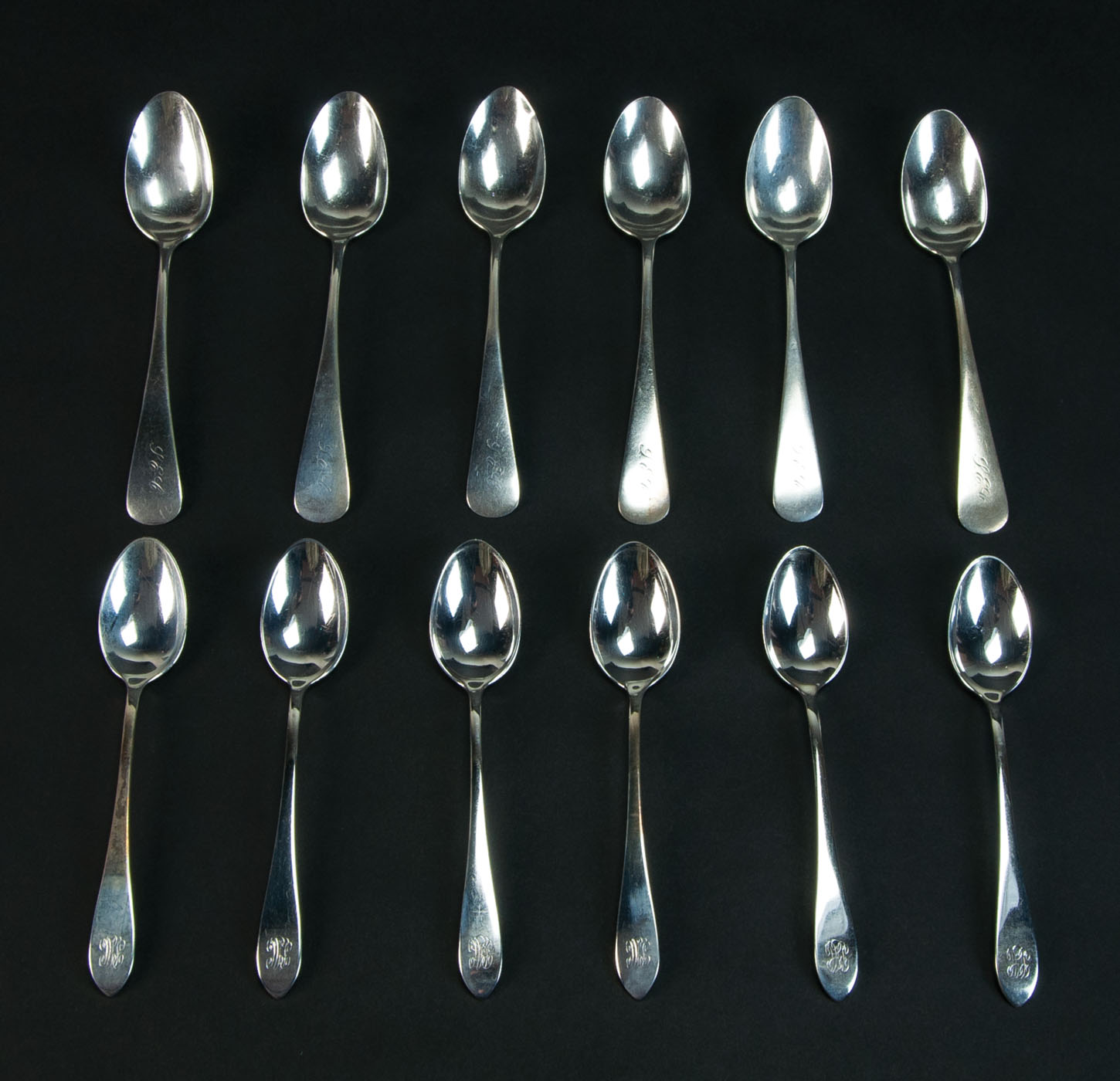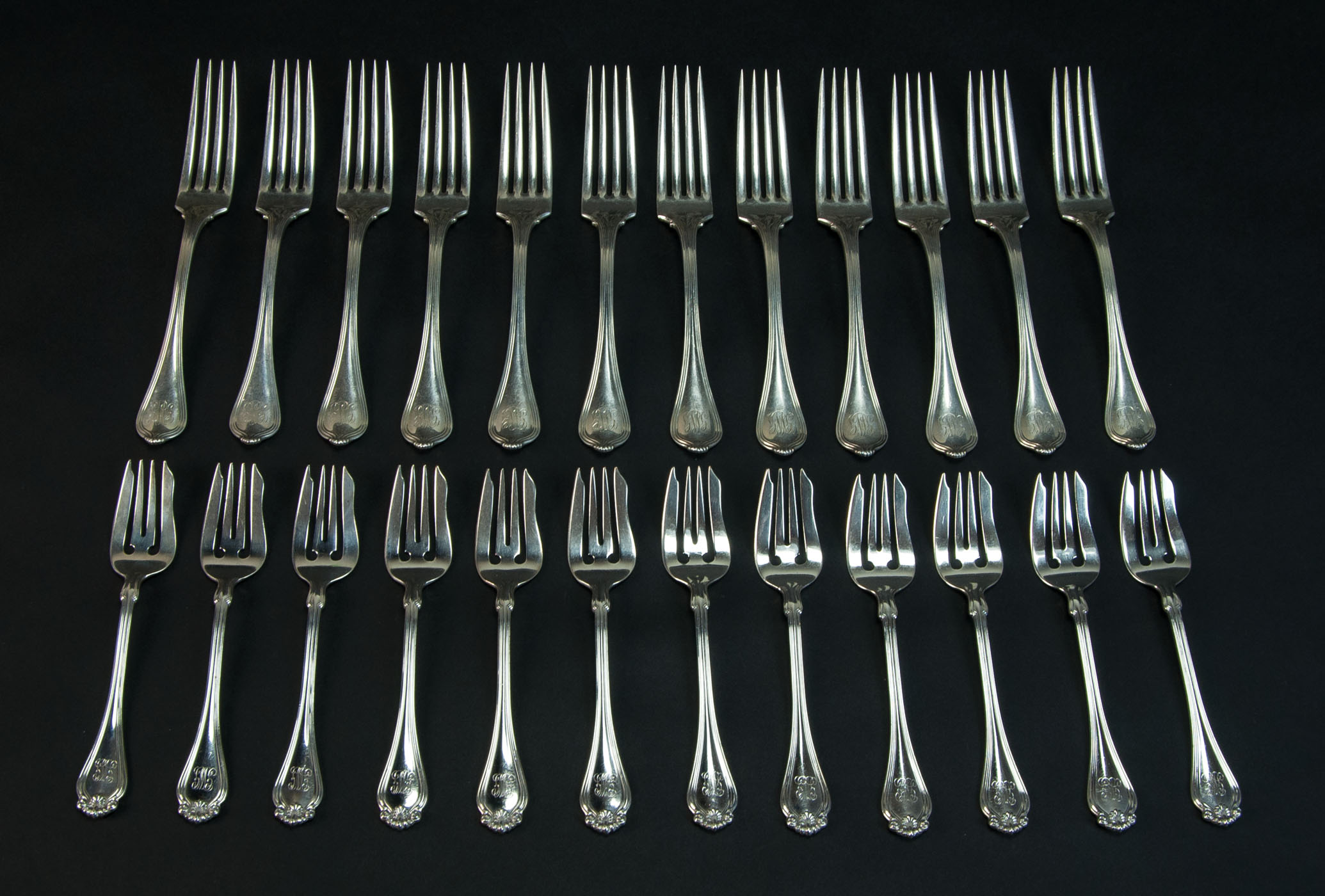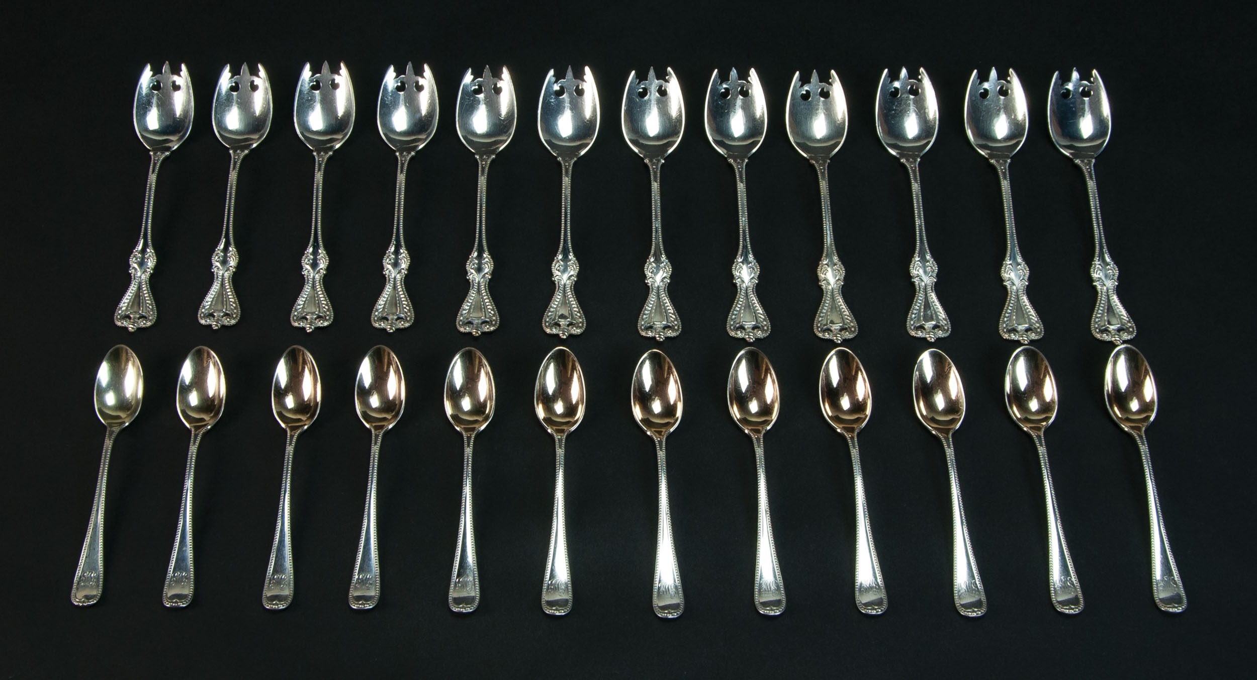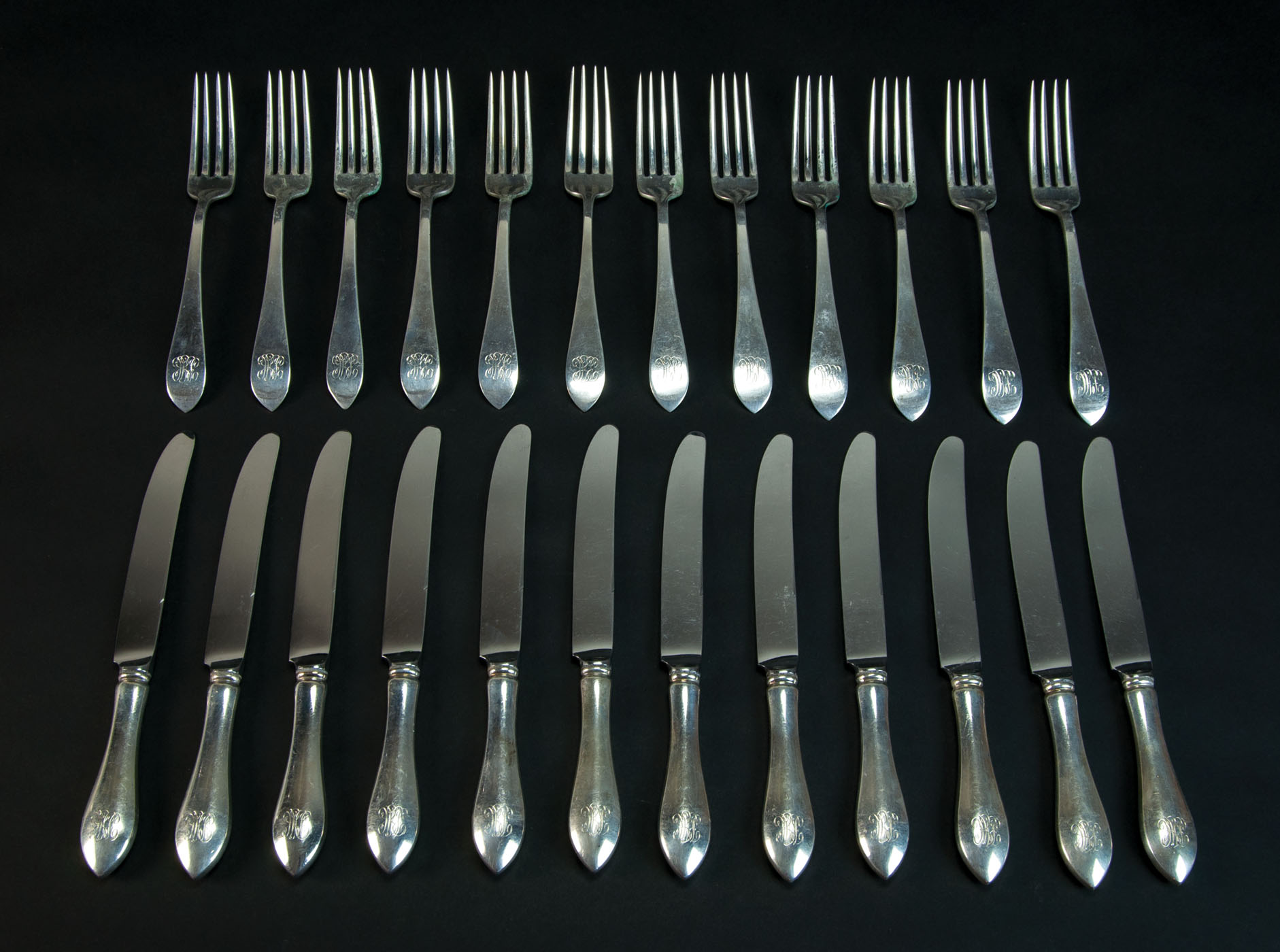 Mixed lot of sterling silver flatware: matched set of 12 dinner forks; set of 12 dinner knives (sterling handles); 12 matching dinner forks; 12 matching salad forks; four sets of 12 four o’clock teaspoons; set of ice cream spoons; and many more sets of spoons; 120 weighable ozt plus knives, (ex. Archibald estate, Powder Point, Duxbury, MA).