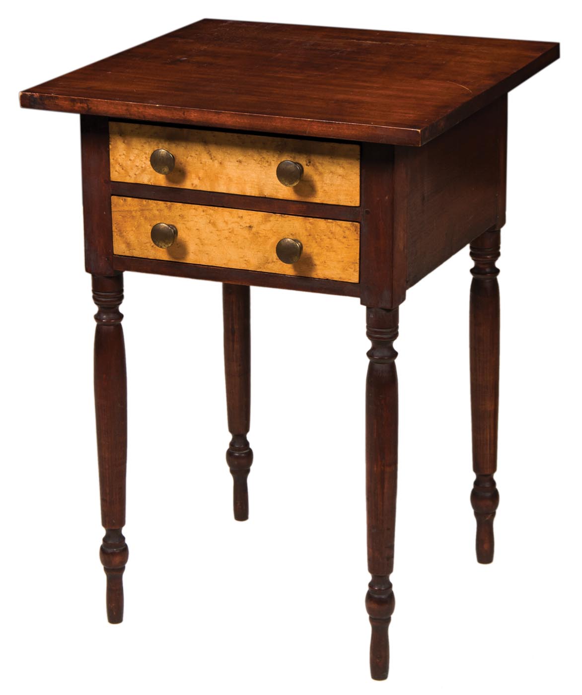 Birch, original red stained finish, bird’s-eye maple drawer fronts, brass pulls, turned legs, tall foot, (ex. Archibald estate, Powder Point, Duxbury, MA).