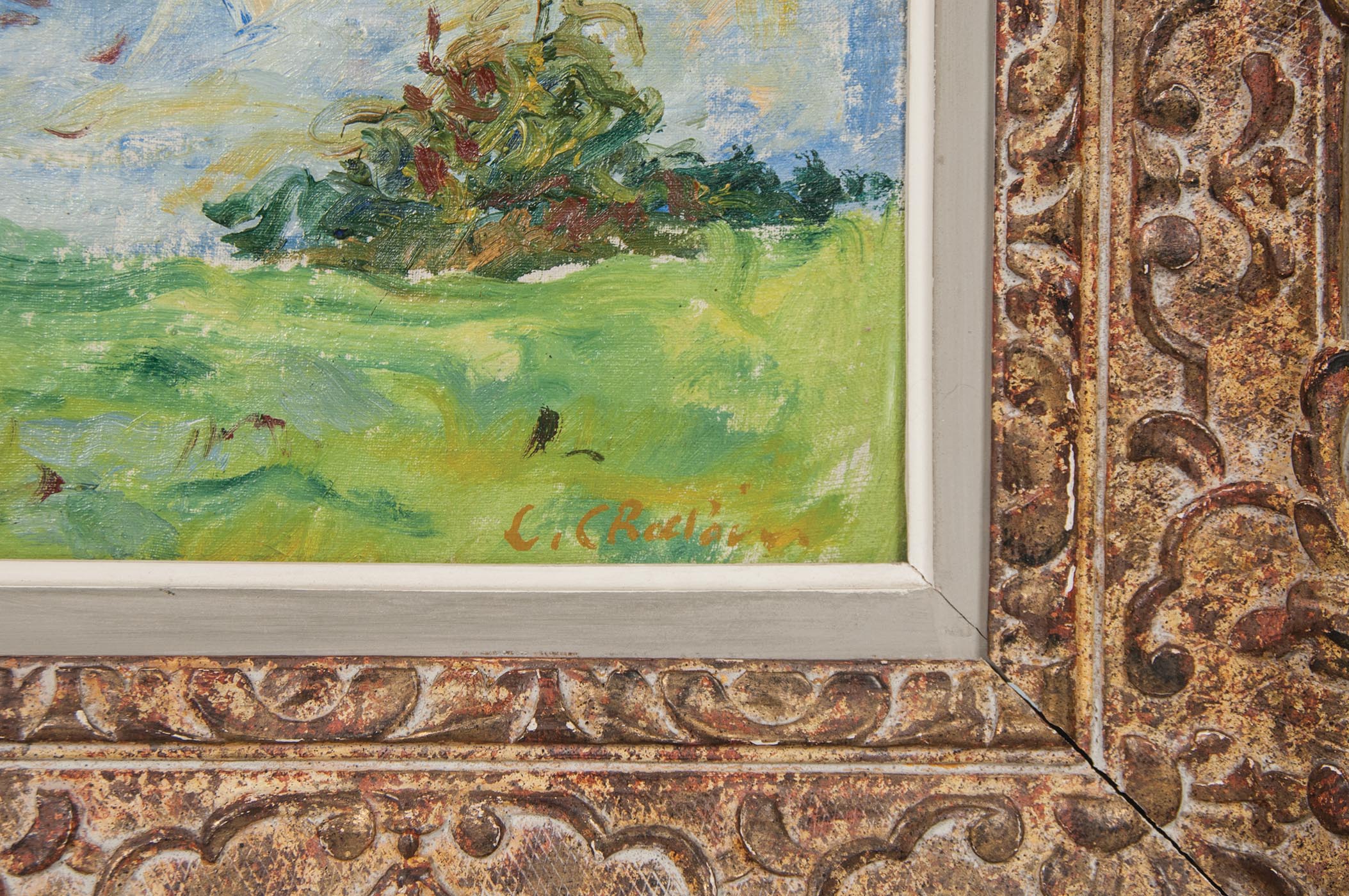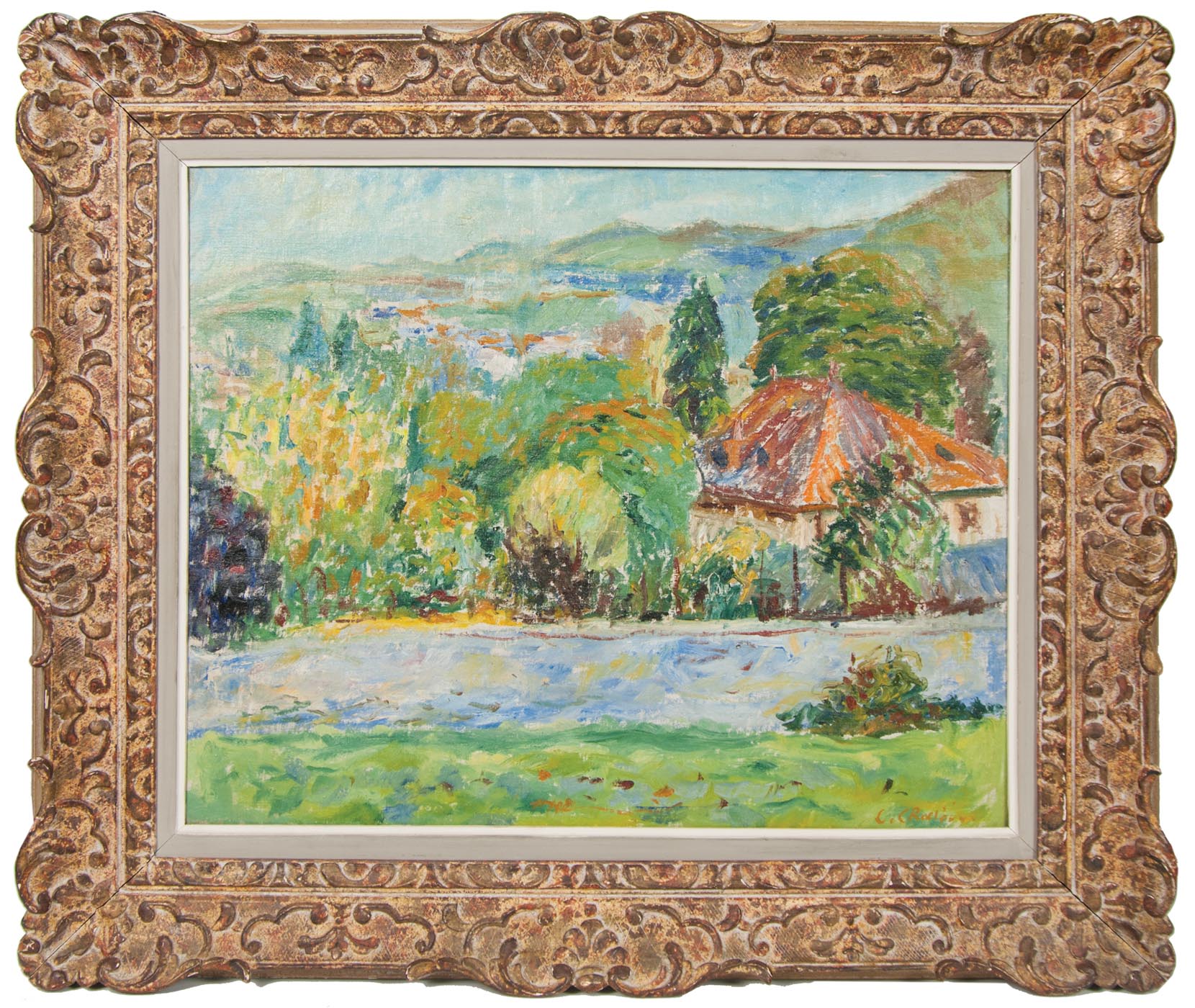 20th c. oil on canvas, impressionist landscape of a red roofed house on water, village in background, signed l.r. “C. Craciun” (Constantin Craciun, 1928-1997), (Note: Still life with fruit on table on canvas back), finely carved wood frame, 21 1/4″ x 25 1/2″.