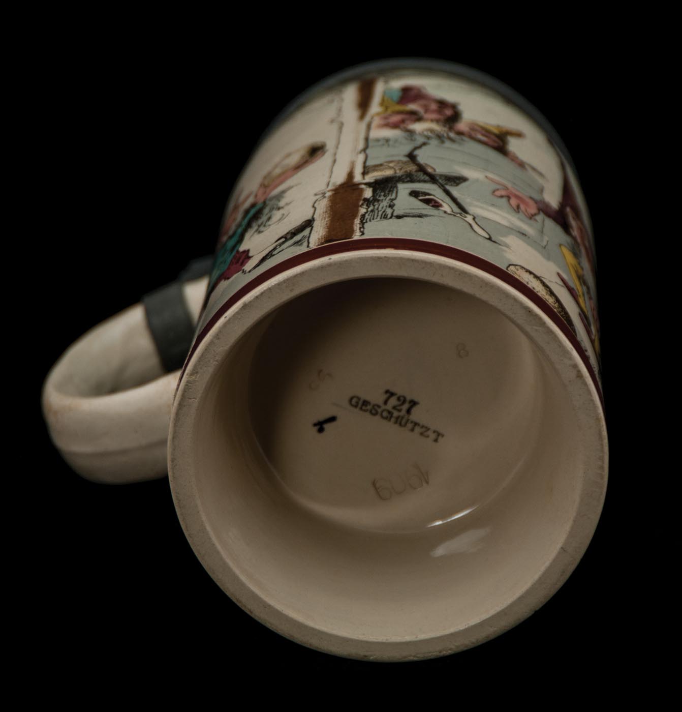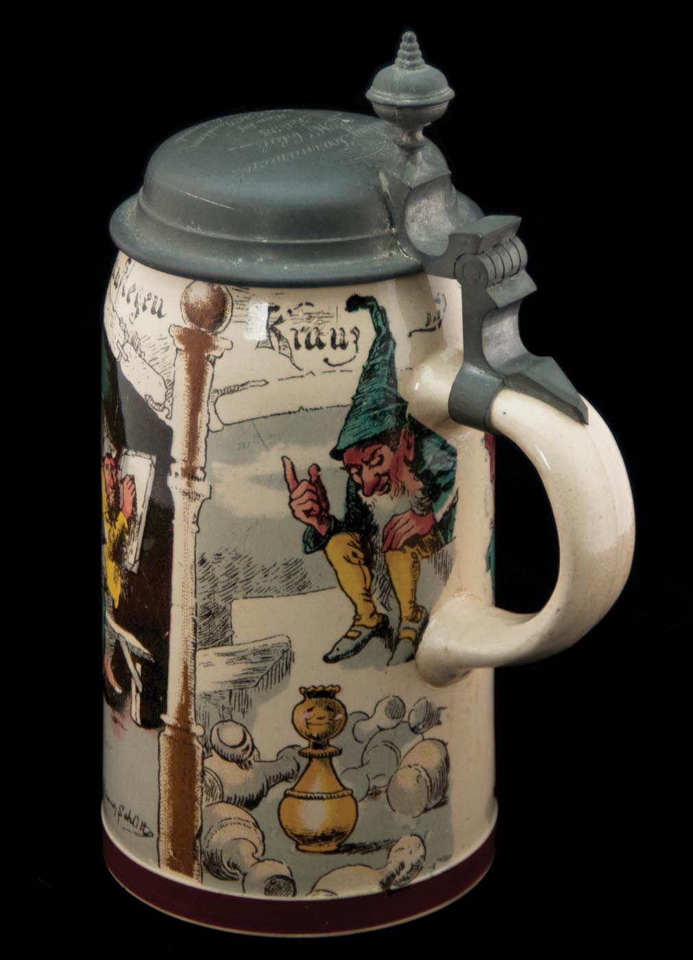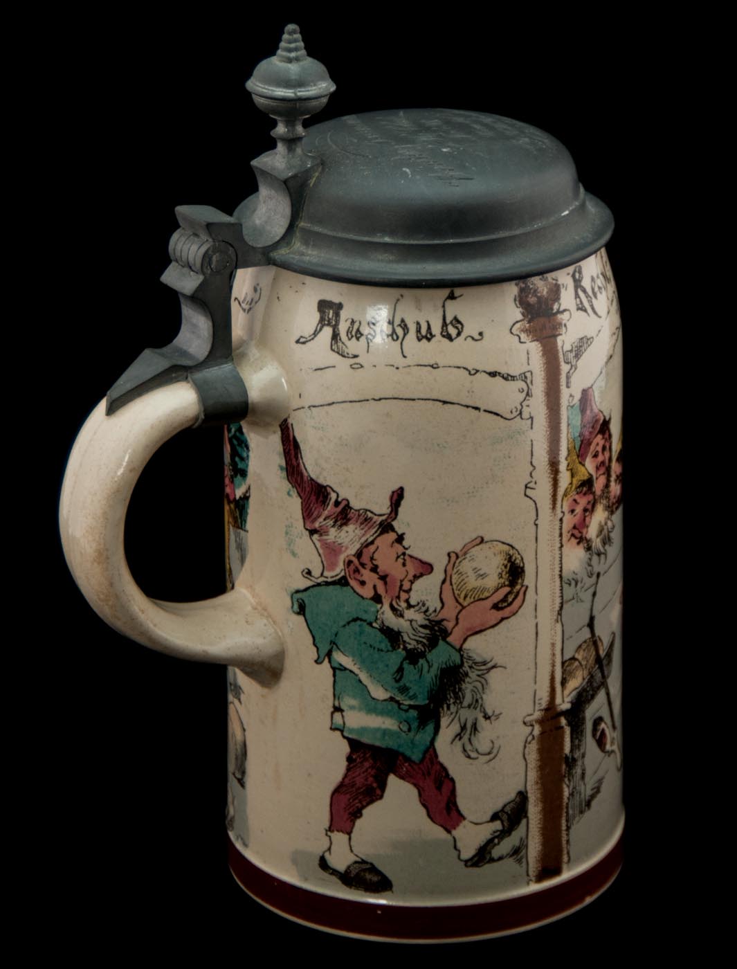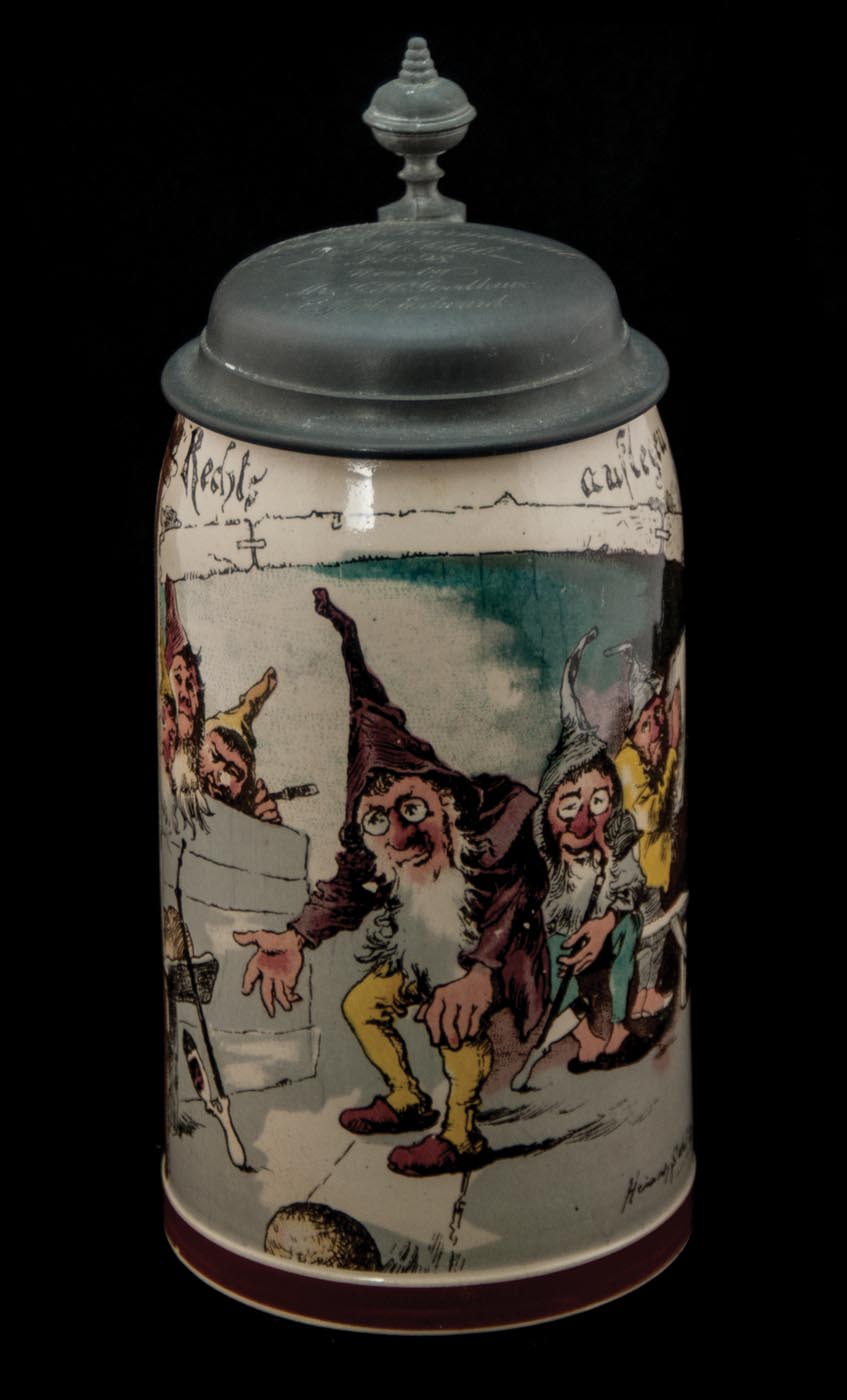 Half litre German stein, depicting gnomes bowling and smoking long pipes, pewter lid inscribed “Bowling Tournament, C.H. Club Feb ’98, won by Mrs. G.H. Goodhue and F.H. Edwards”, stamped on bottom “727, Geschutzt” and impressed “1909”, artist signed “Heinrich Schlitts”, (ex. Archibald estate, Powder Point, Duxbury, MA).