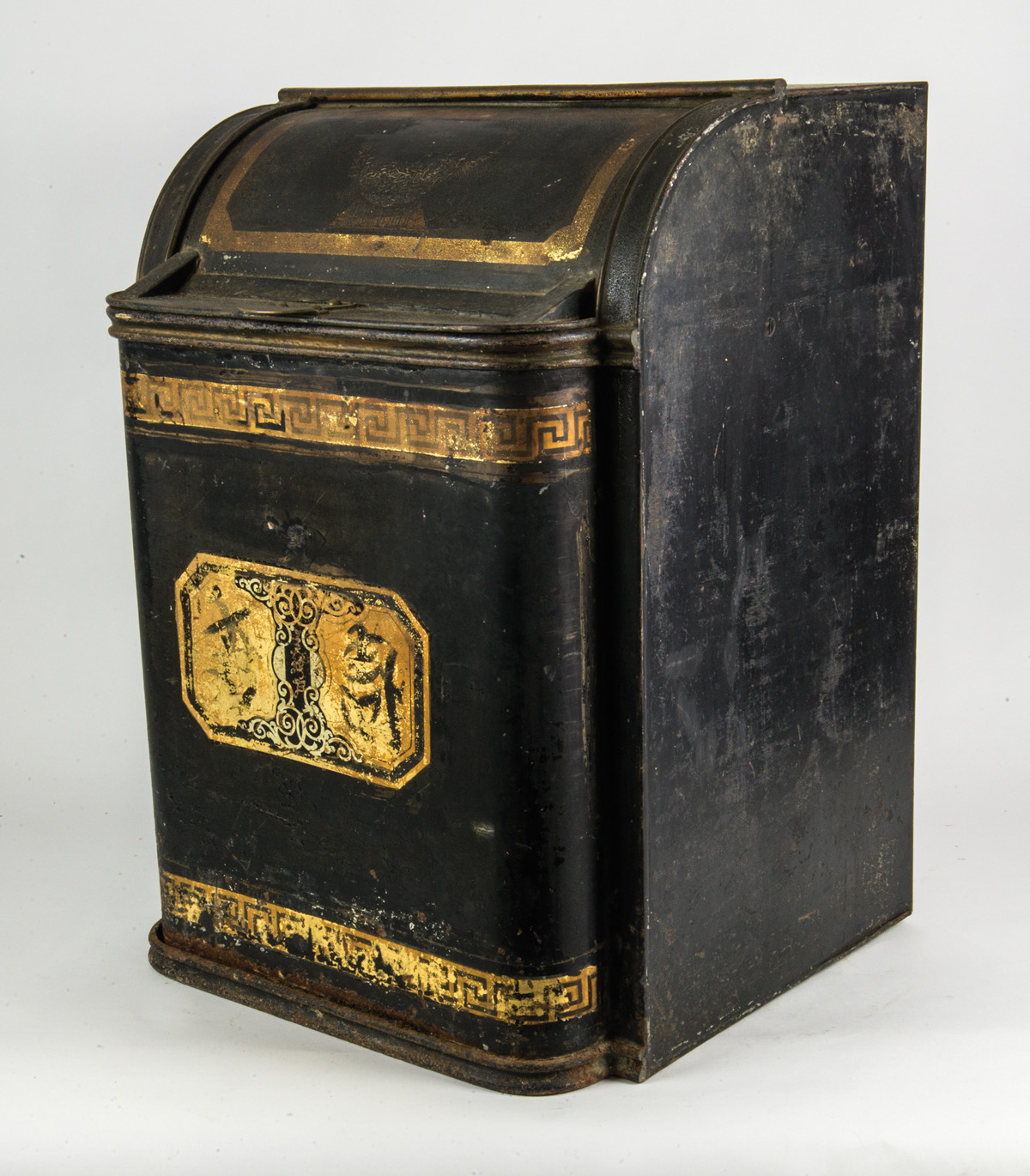 Pair of 19th c. Country Store tea bins, brass handled, black backgrounds with gilded decoration, some rust at bottom, 27 1/2″ h, 20″ d, (ex. estate of Ed Clerk).