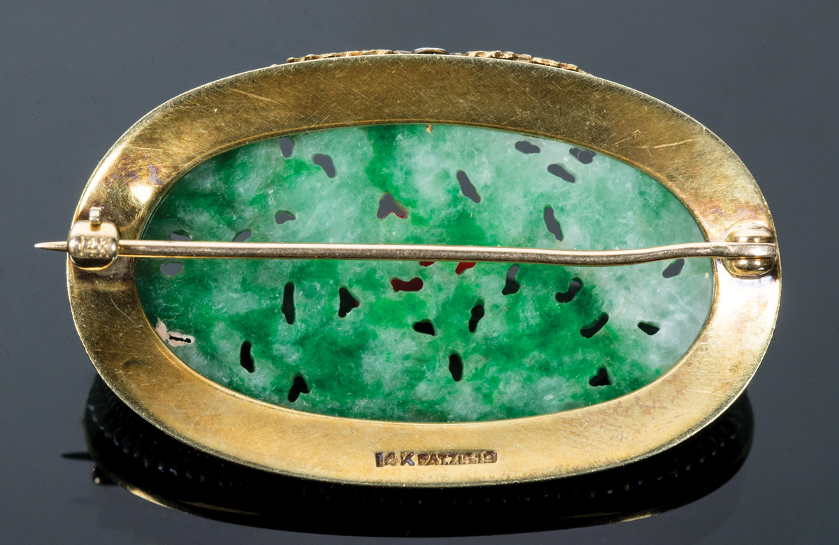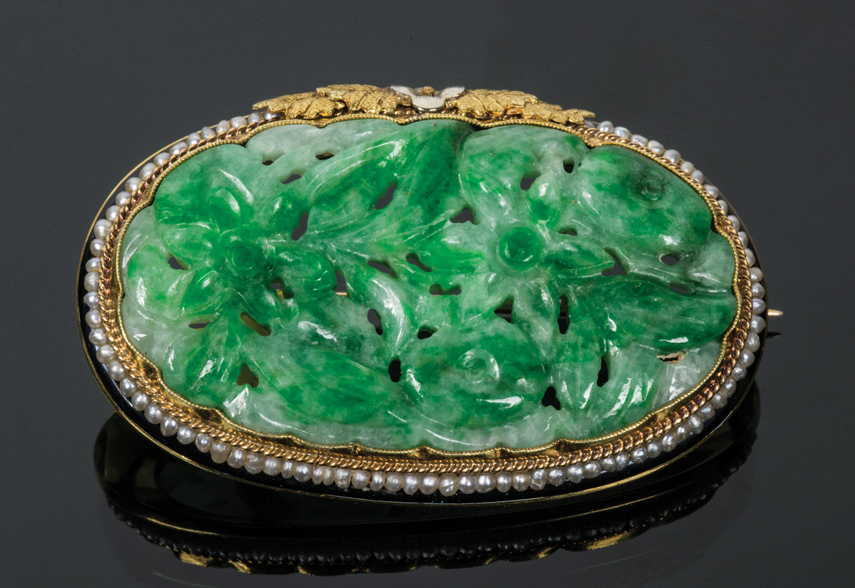 14K gold pin, with Chinese carved oval jadite with floral motif, set in yellow gold surrounded with seed pearls, finely worked gold leaves, on black step set on a marked gold rim, overall good condition, (pat. 7/5/1919).