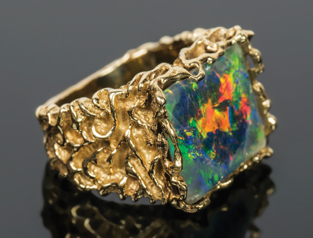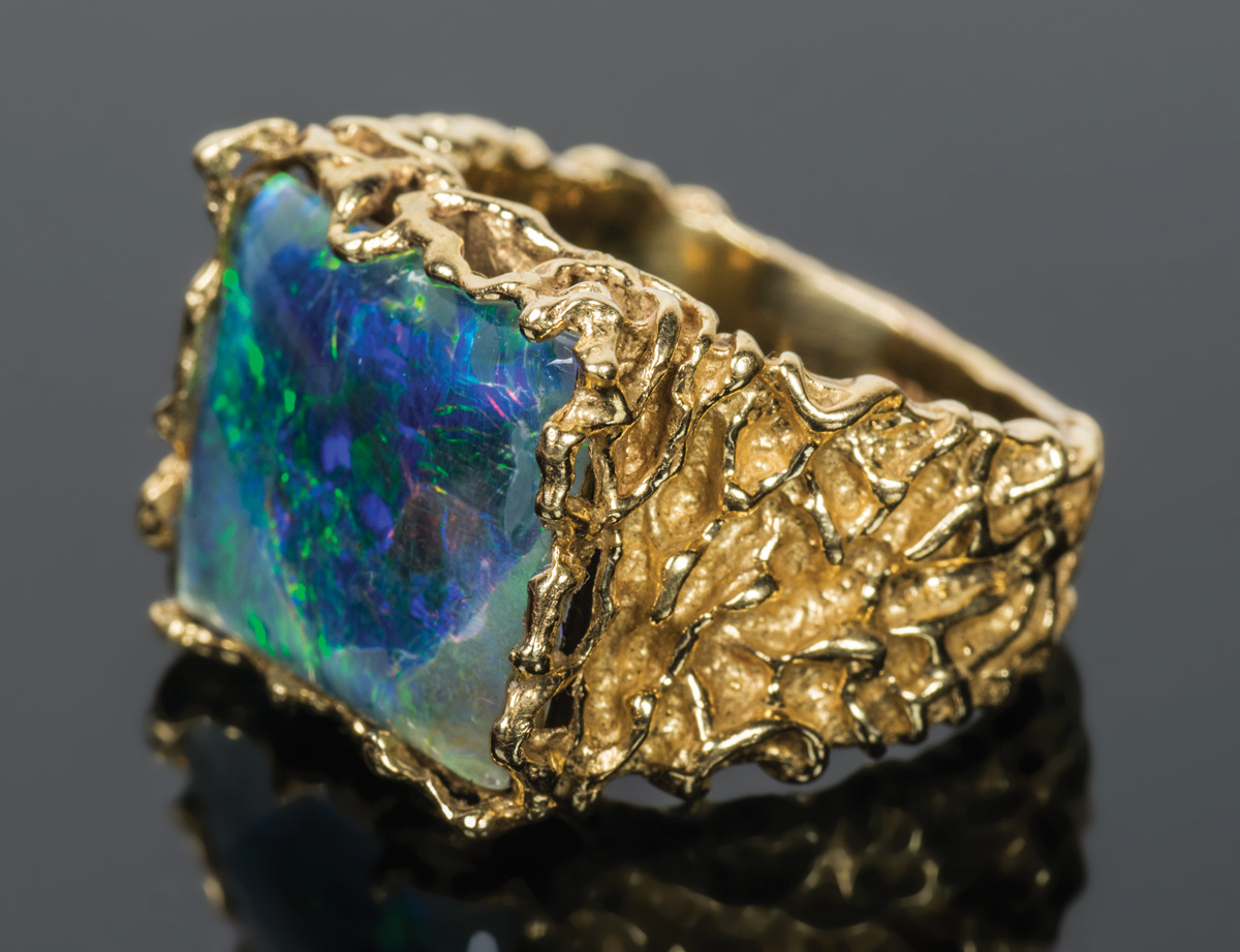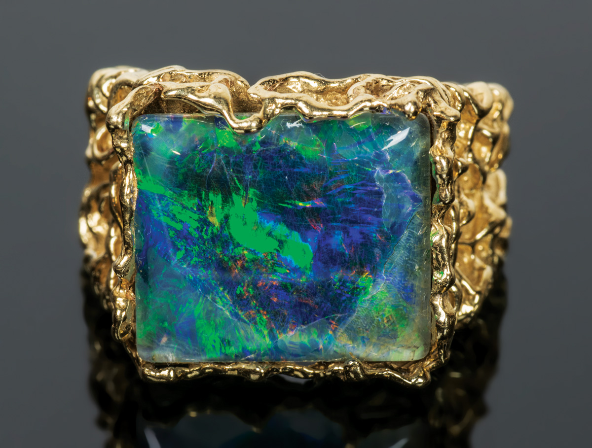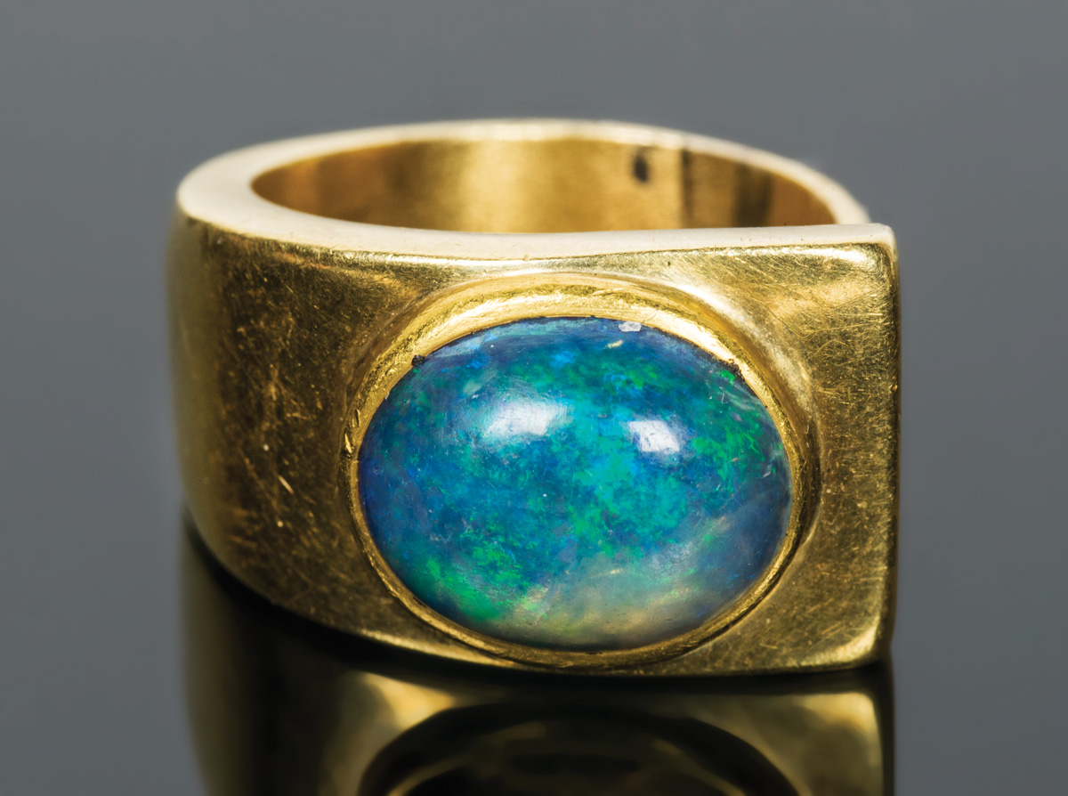 14K white gold, with a brilliant cut diamond (2.5-3mm), size 6 1/2, 6.3 gms overall wt; 14K yellow gold, with square cut black opal doublet, intricate filigree designed band, 10.16 gms overall wt, size 6; 18K yellow gold crossover band, with polished black opal doublet, size 6.