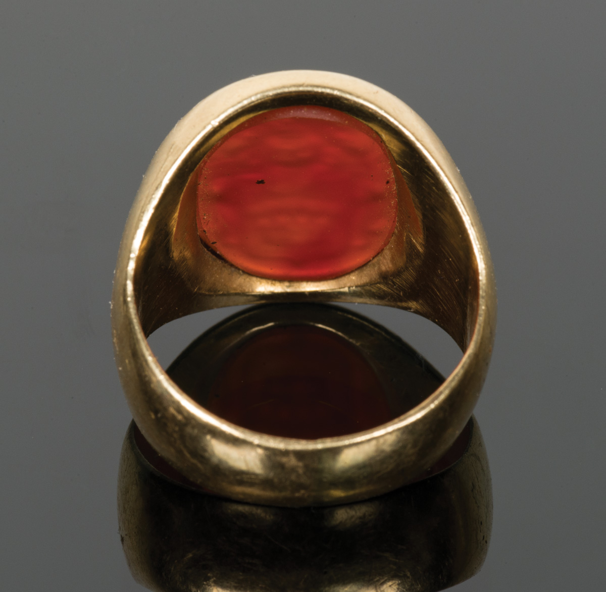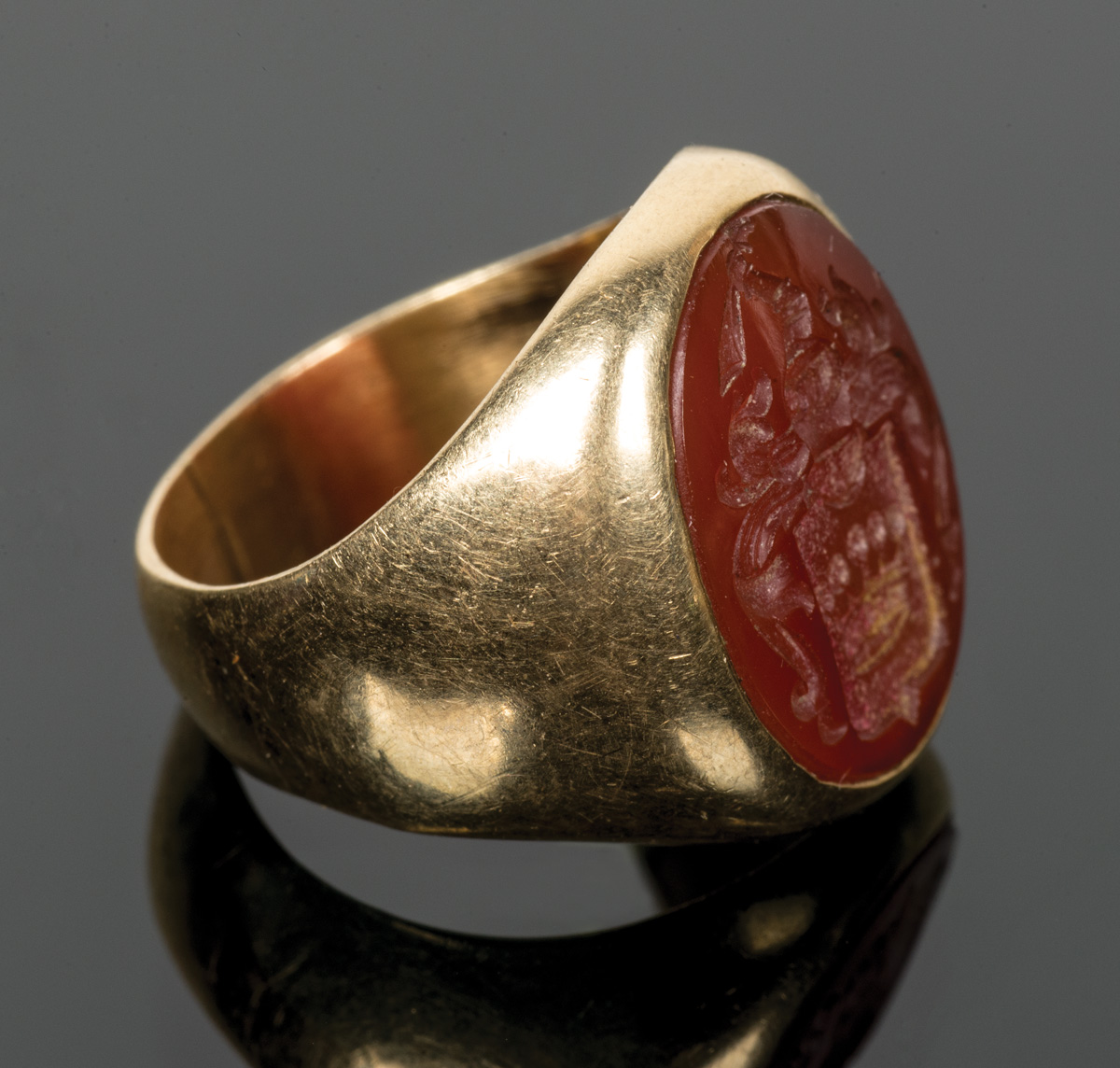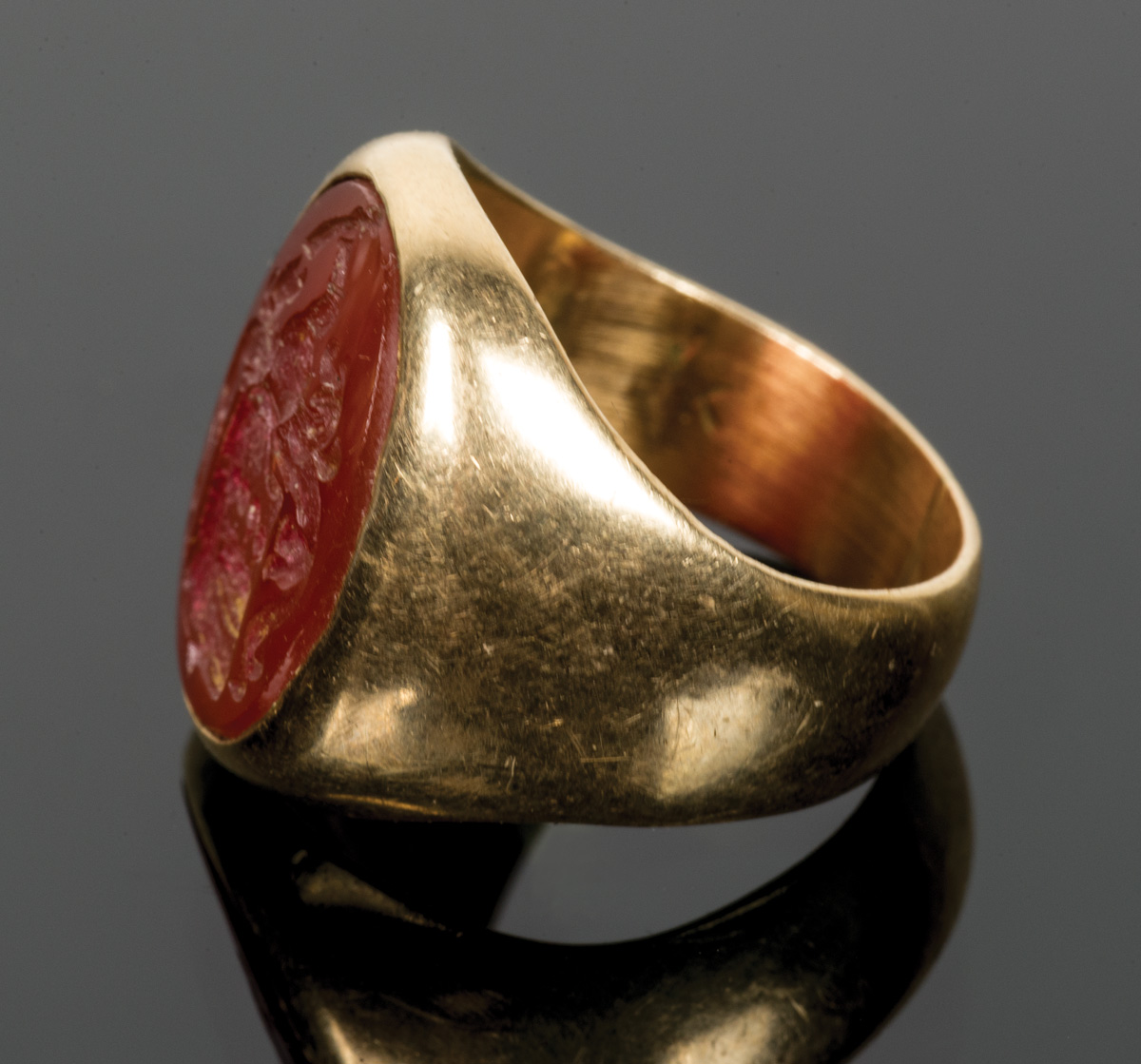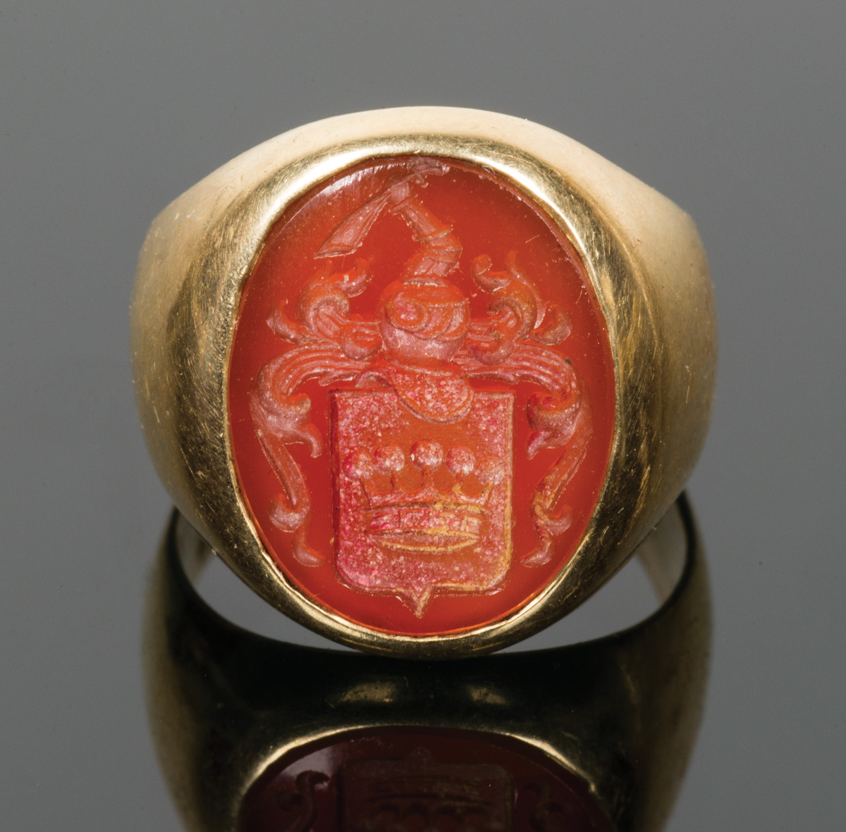 14K gold ring, with intaglio carved oval carnelian, with knight’s helmet and sword over a shield, size 6 3/4, (9.58 gms total wt).