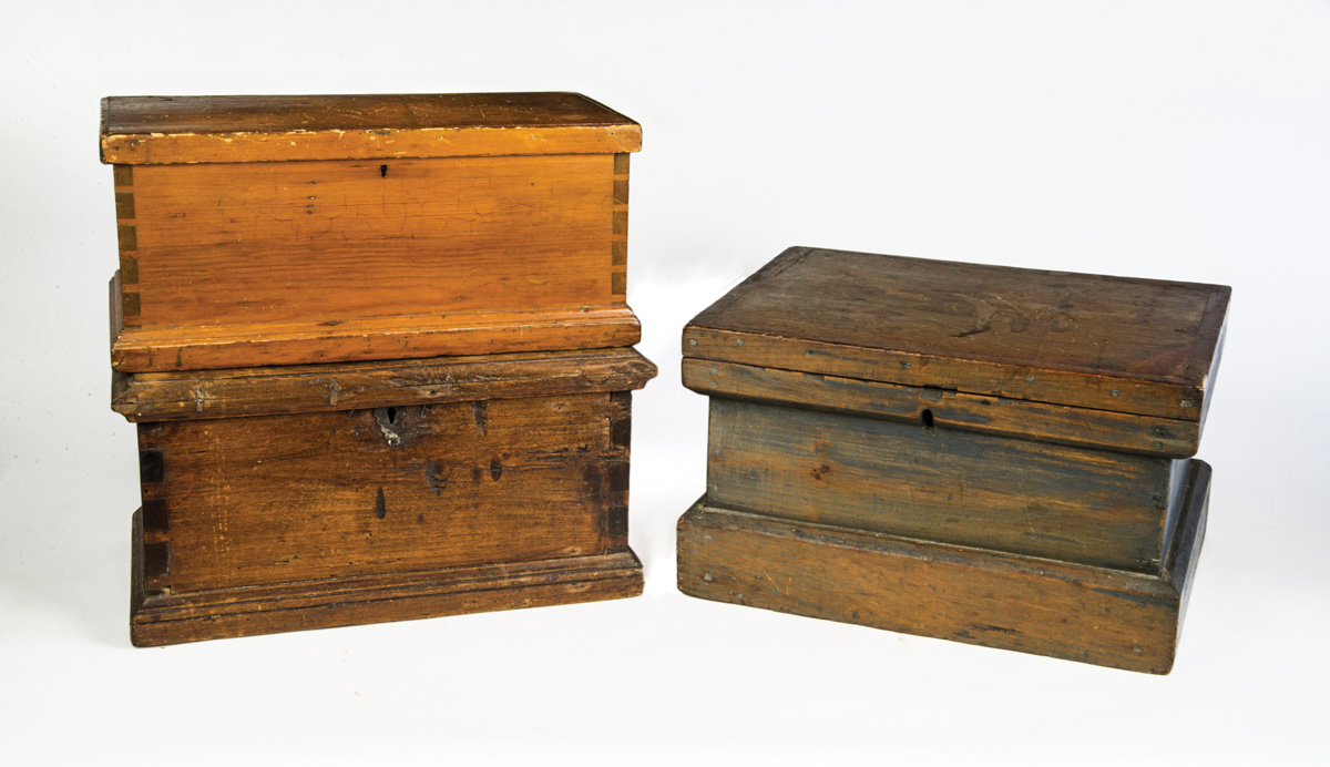 Toy chest, pine, heavy moldings, strap hinges, 10″ h, 17″ w; Small dovetailed box, iron escutcheon, 9″ h, 18″ w; Dovetailed box, pine, finely constructed, 7 1/2″ h, 17″ w.