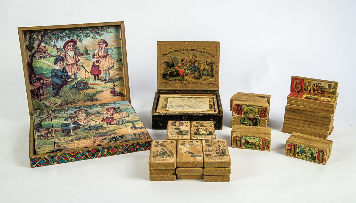 19th c. slide lid box with six scenes, “The Children and their Favourites”, original painted and paper, (French and German titles as well), with history, 2 1/2″ h, 7″ l; Shoe box of lithos printed on pine; Box of 30 blocks with children scene.