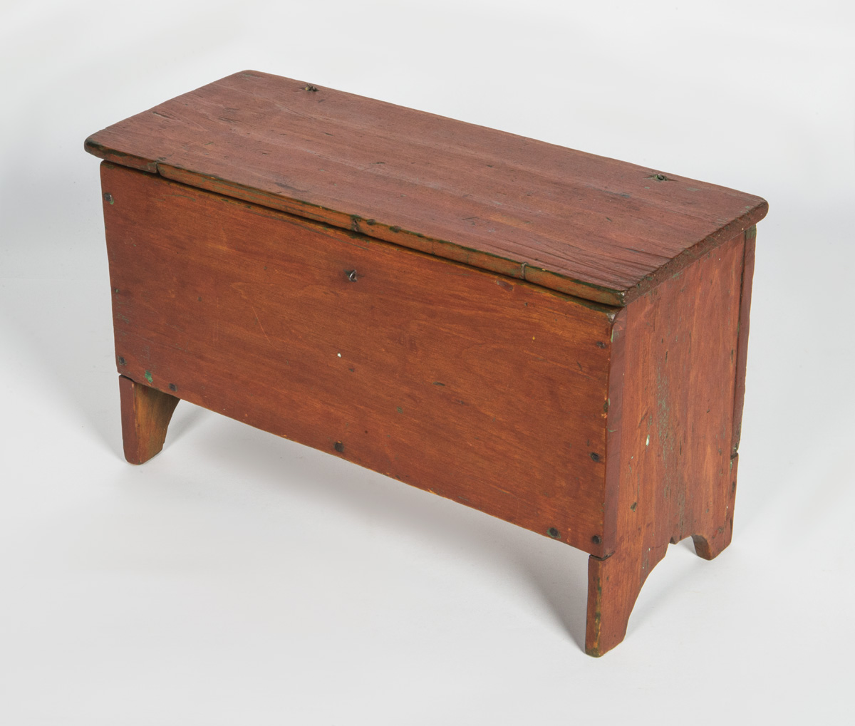 New England, pine, cutout bootjack ends, traces of green paint removed to original red painted surface, snipe hinges, original till box, front hook missing, 9″ h, 14 1/2″ w, 6 1/2″ d.