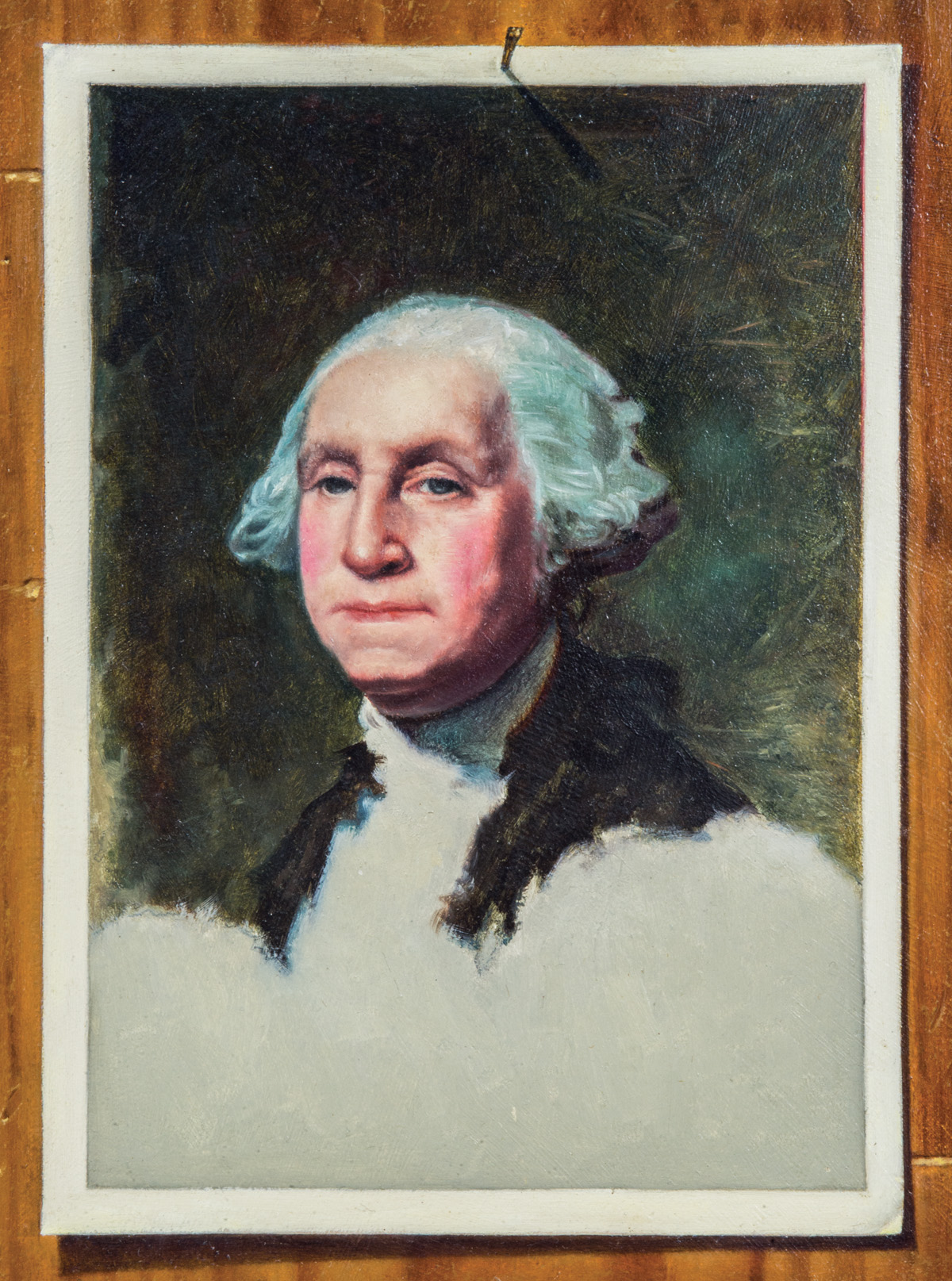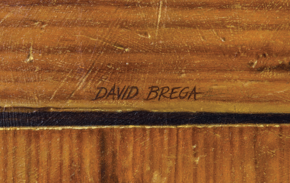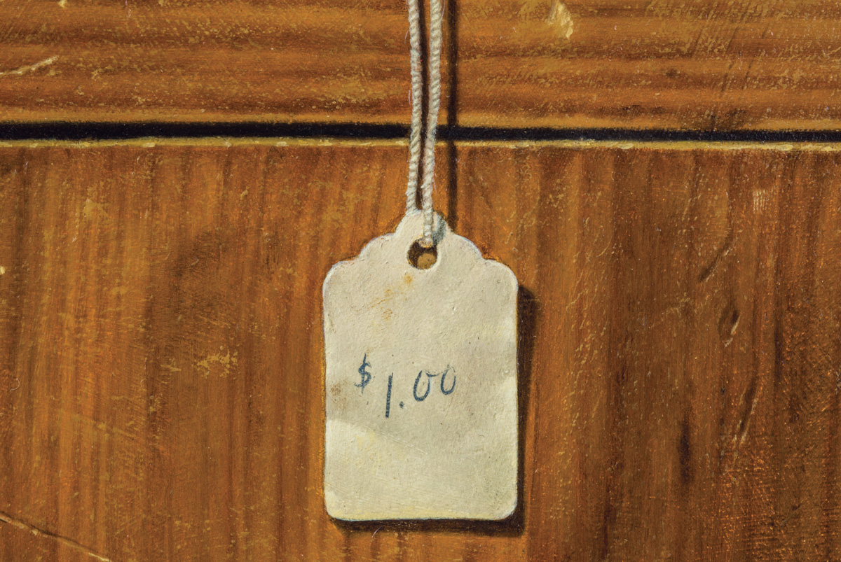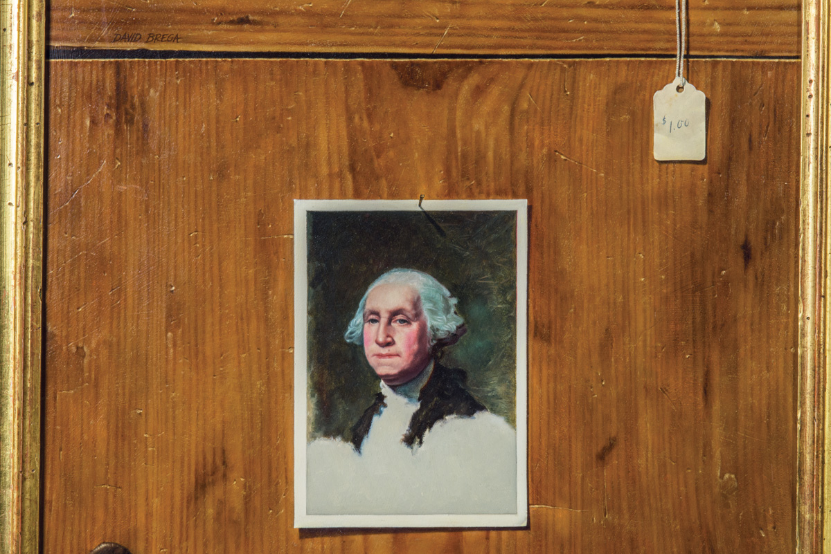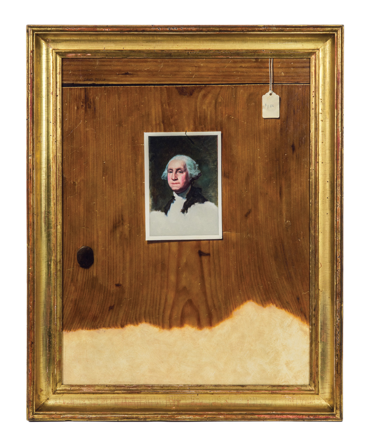 David Brega, (American 1948-), titled “Unfinished, Unfinished”, 1981 trompe l’oeil, showing the unfinished portrait of George Washington by Gilbert Stuart on a postcard tacked to a pine breadboard, with a price tag of $1.00 hanging down on the upper right, carved wood gilt frame, 17 11/16″ x 13 3/8″. [In a whimsical play on Stuart’s unfinished portrait of the first president, Brega left his painting similarly unfinished at the bottom of the panel. David Brega is one of the foremost contemporary American painters of the trompe l’oeil style.]