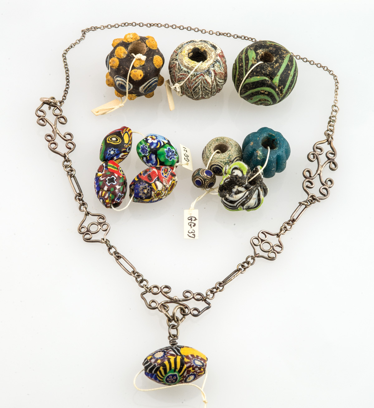 Collection of 12 millefiori glass and pottery beads, Ptolemaic or Roman in Egypt (330 B.C.), Syro-Roman (1st-4th c. AD ?), one necklace on hand-wrought silver chain by Paula Wyman, (L.C. & P. Wyman collection).