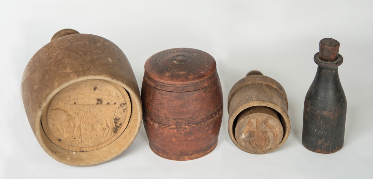 Two butter molds, a 2 3/4″ dia cow and a small flower; Turned and carved wooden bottle with protruding cork, 3 1/2″ h; Turned miniature keg with lid, with small “wishbone” inside.