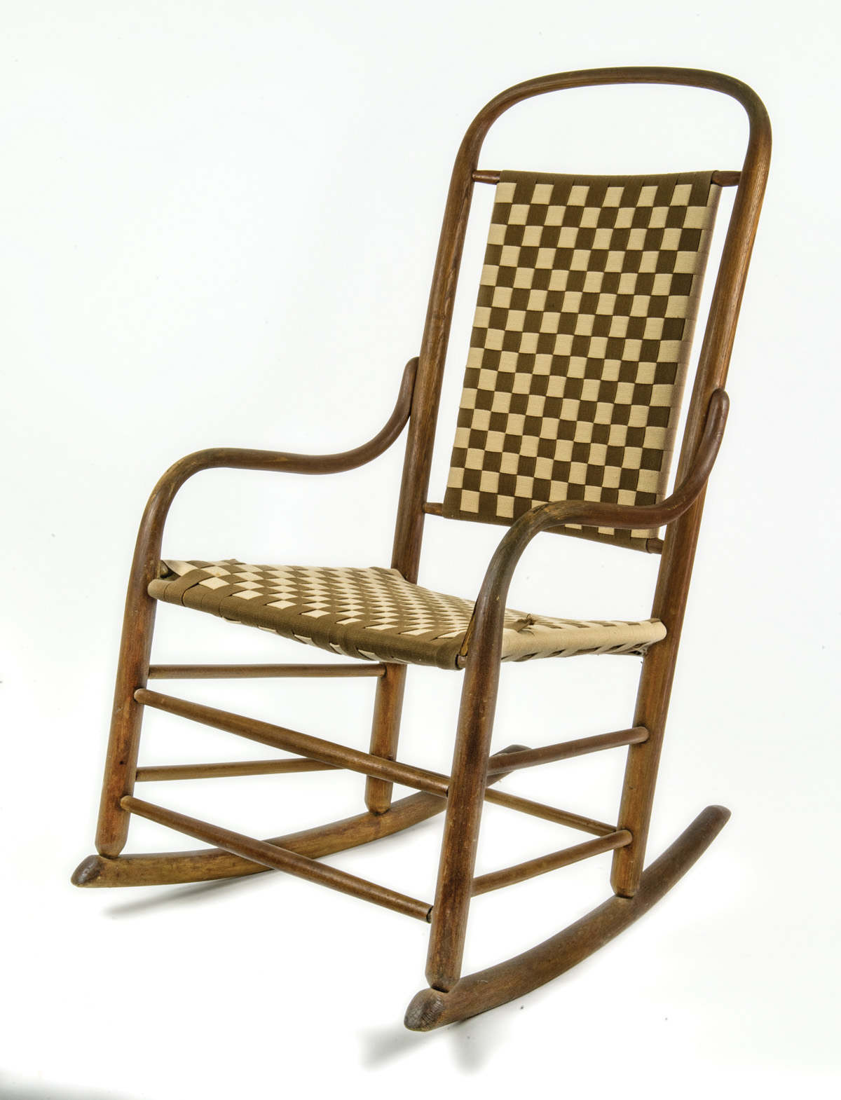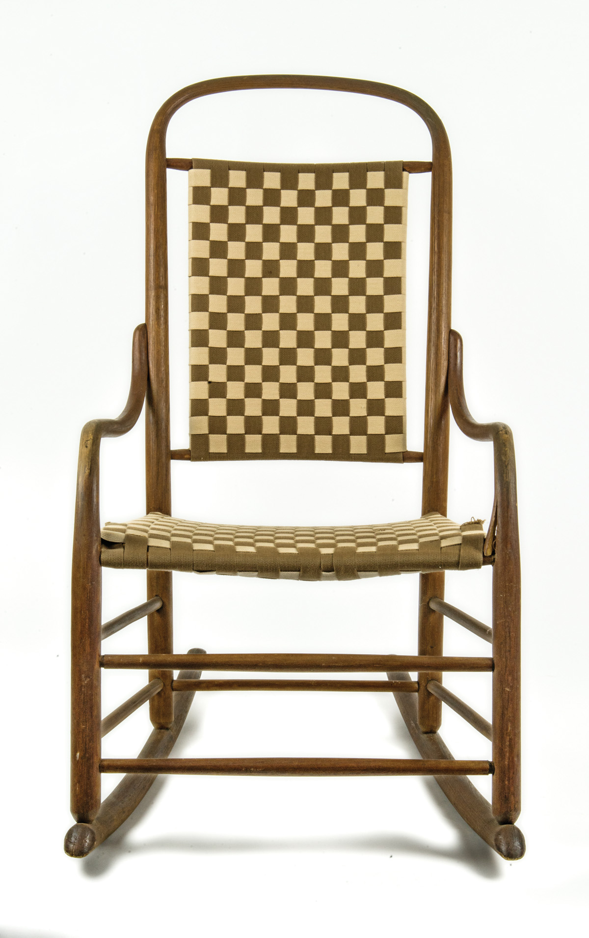 Taped seat and back in brown and beige, with arms, small split at left arm at seat, 15″ seat h, 37″ overall h.