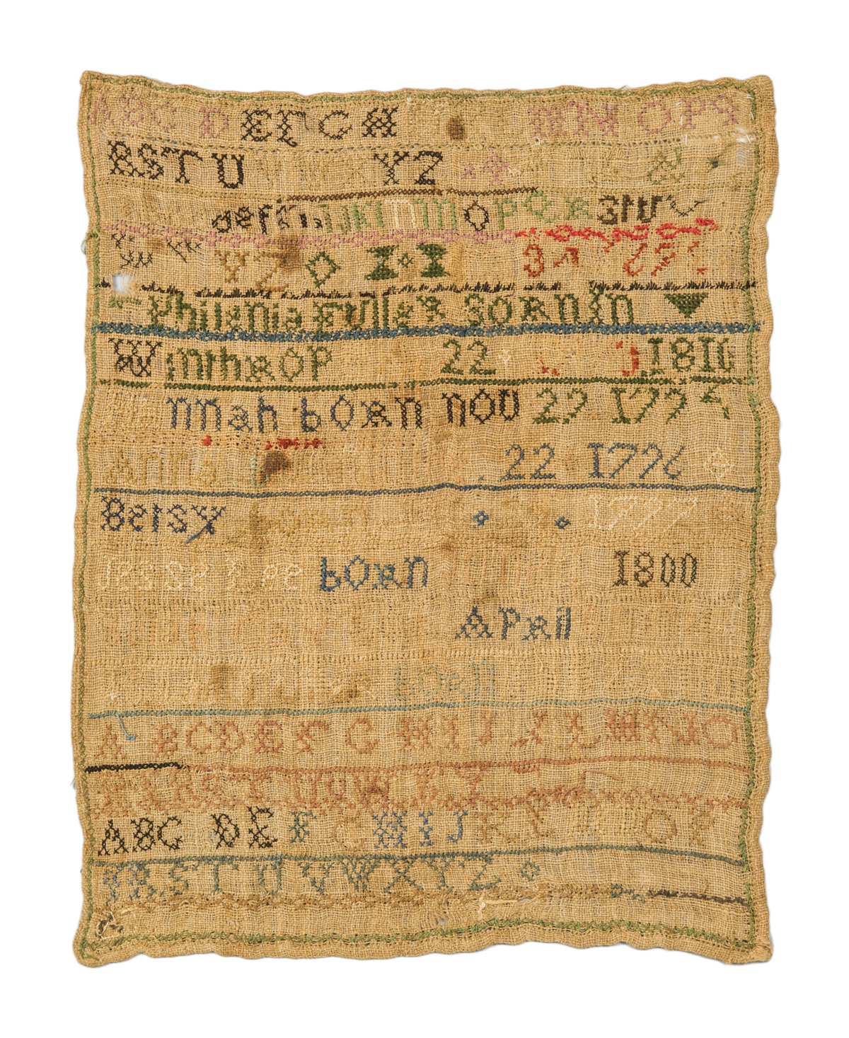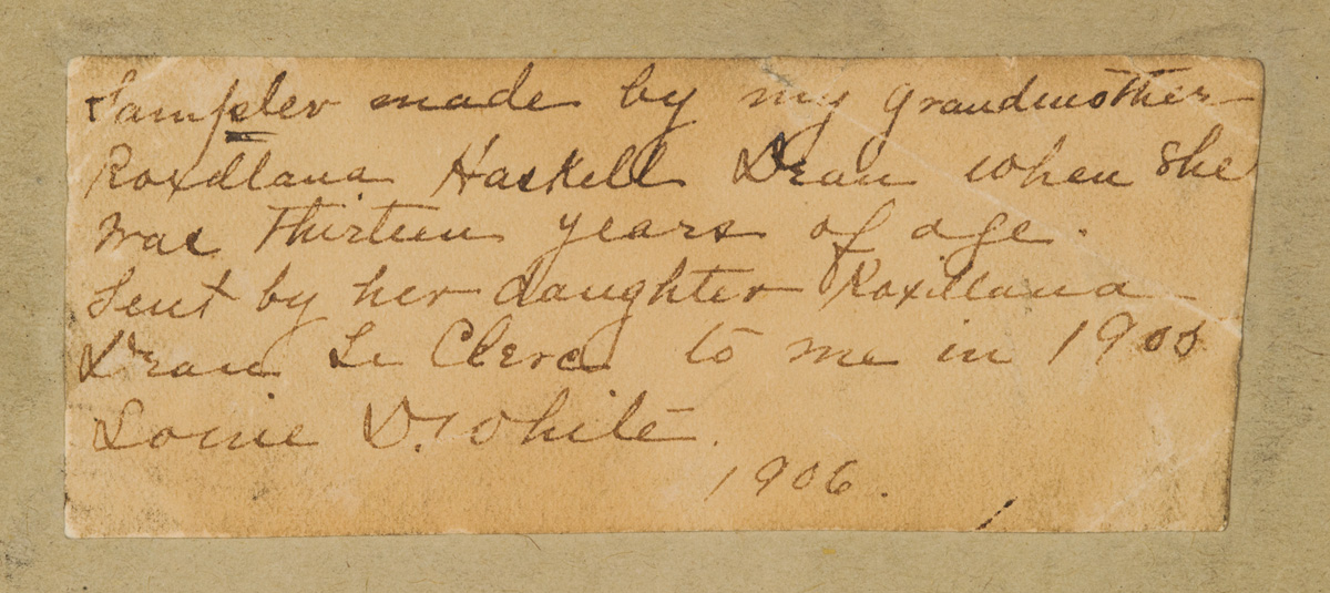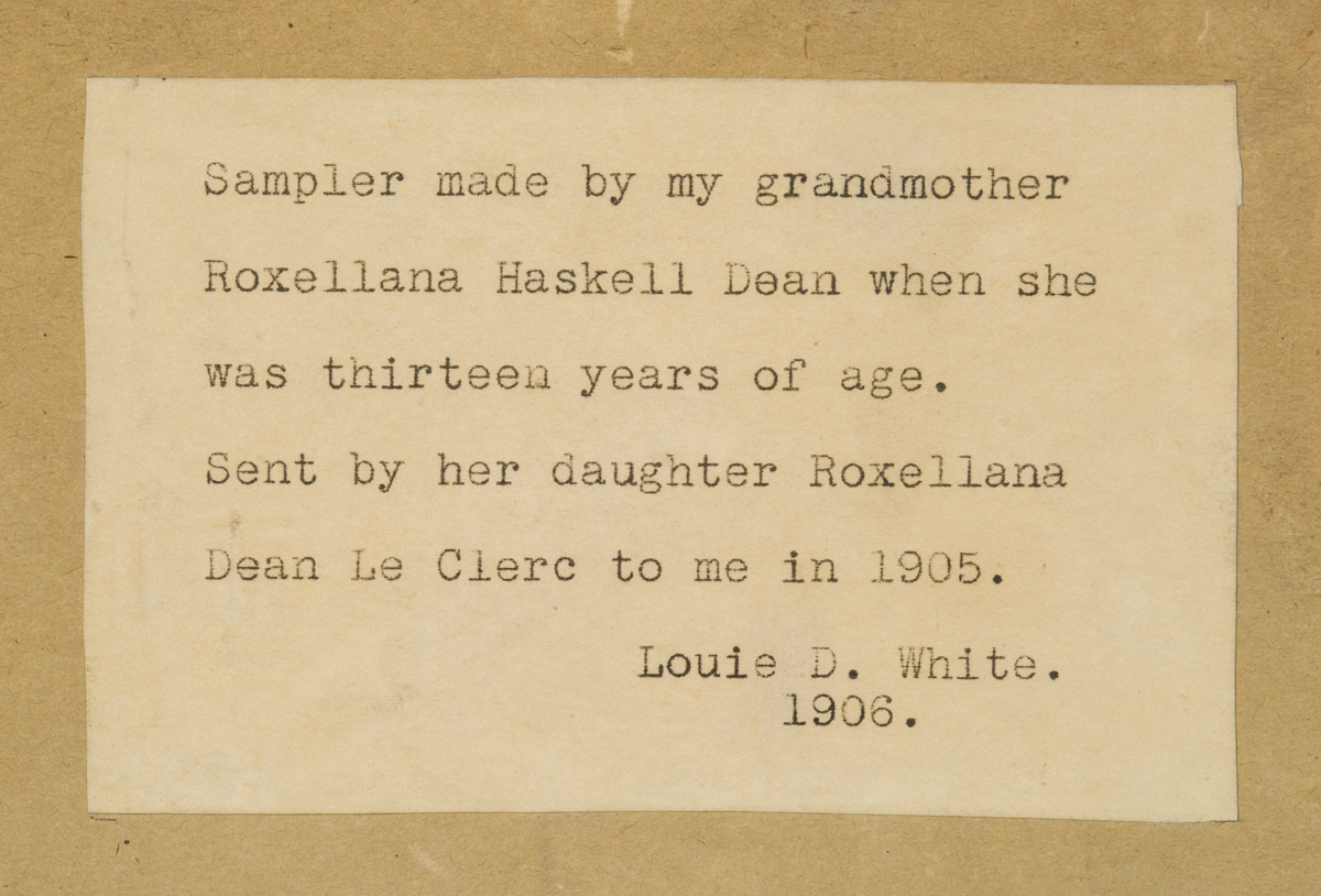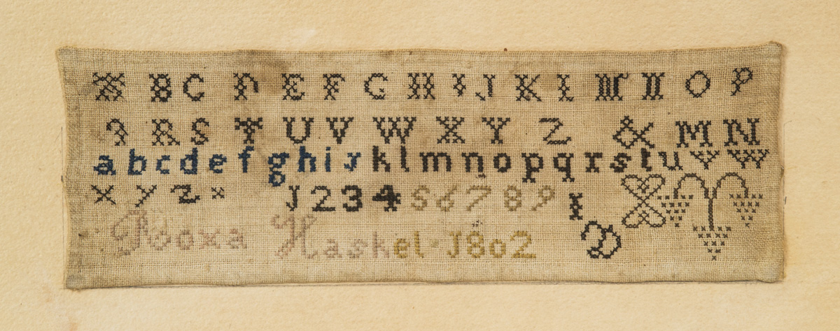 Family tree, alphabets and numbers, “Philenia Fuller born in Winthrop, 1810, fading and some missing yarns, 15″ x 11 1/2”; Small needlework sampler, with numbers and two alphabets, “Roxa Haskel 1802″, framed with print, 3″ x 8 3/4”, typed history on back “Sampler made by my grandmother Roxallana Haskell Dean when she was thirteen years of age…, 1906”; (deaccessioned from Mass. Society of Mayflower Descendants).