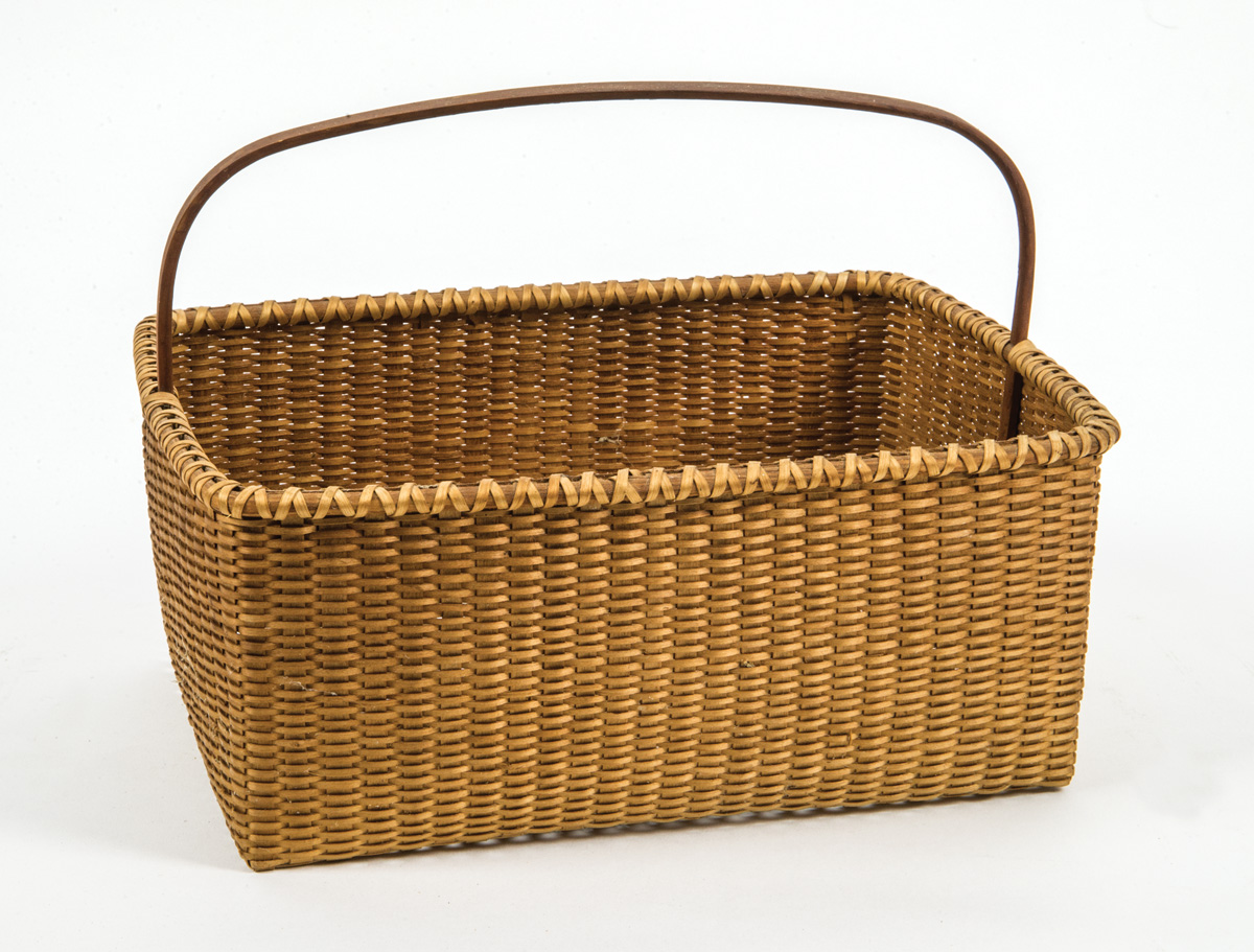 Made by Martha Wetherbee, rectangular, with cherry wood hoop handle, open weave bottom, cross wrapped rim, very finely woven, signed on bottom “MW-83.”, 8 1/2″ h (to top of handle), 10 1/2″ l, (ex. estate of Ed Clerk).
