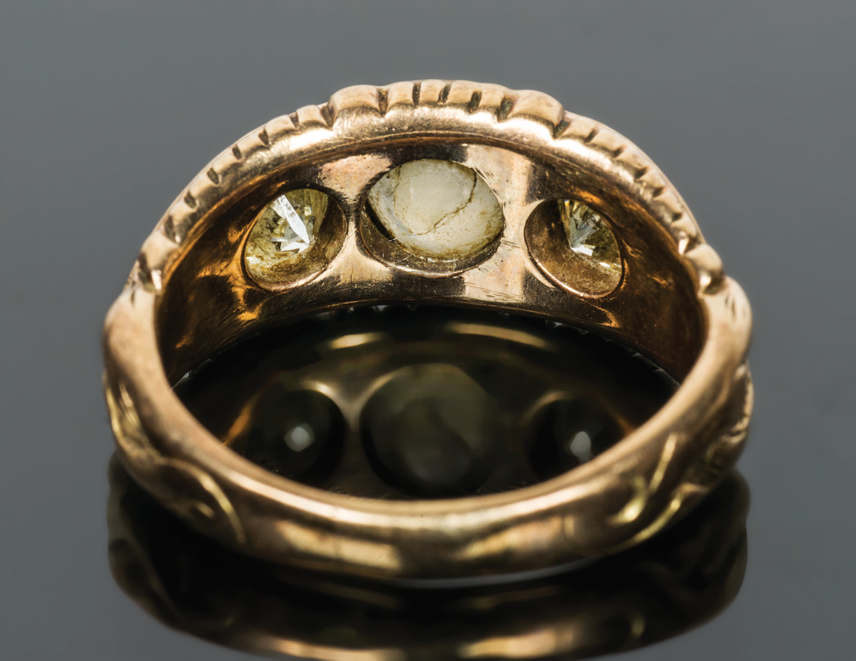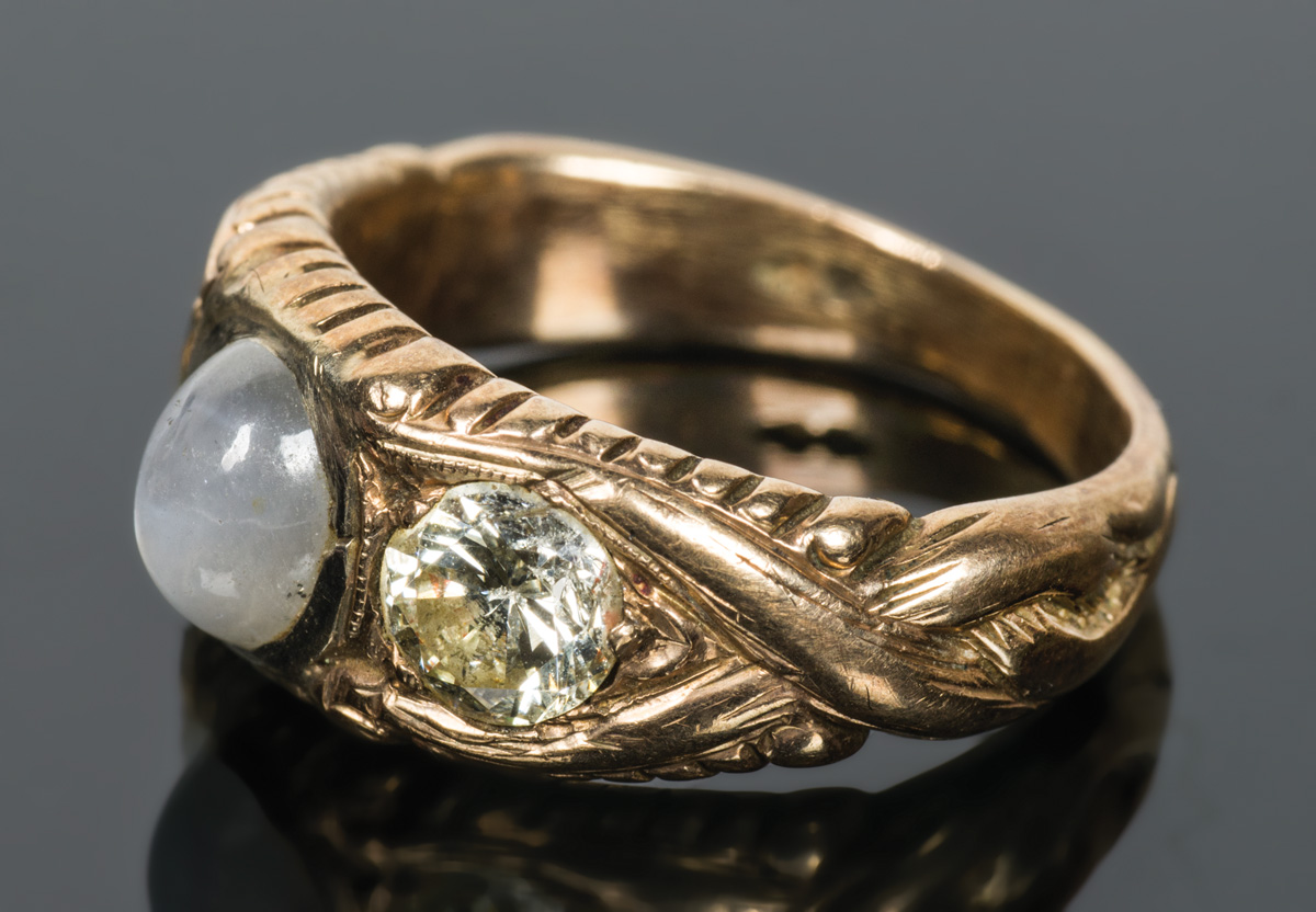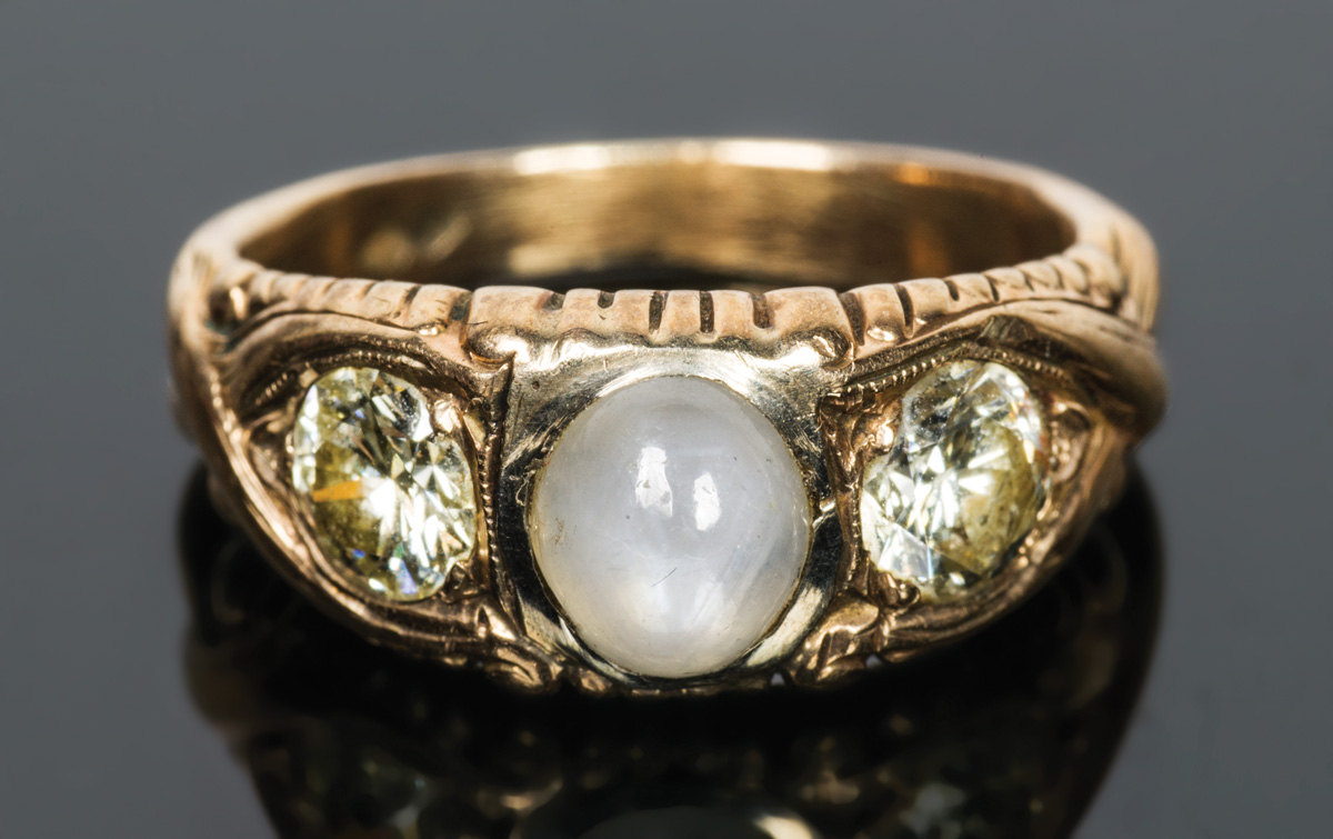 14K gold ring, with central moonstone cabochon, flanked by two brilliant diamonds (each approximately 4mm), size 6, 5.86 gms overall wt, .45 ct diamond wt.