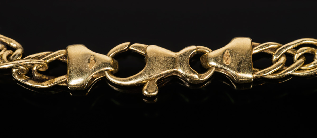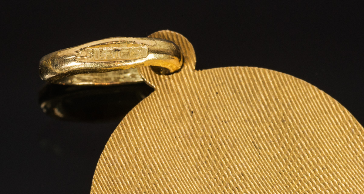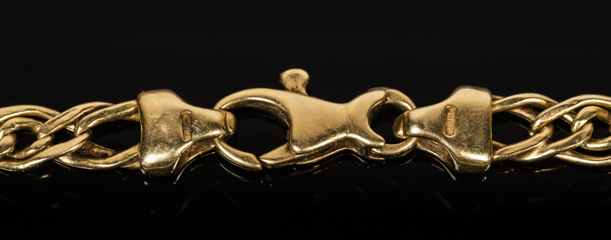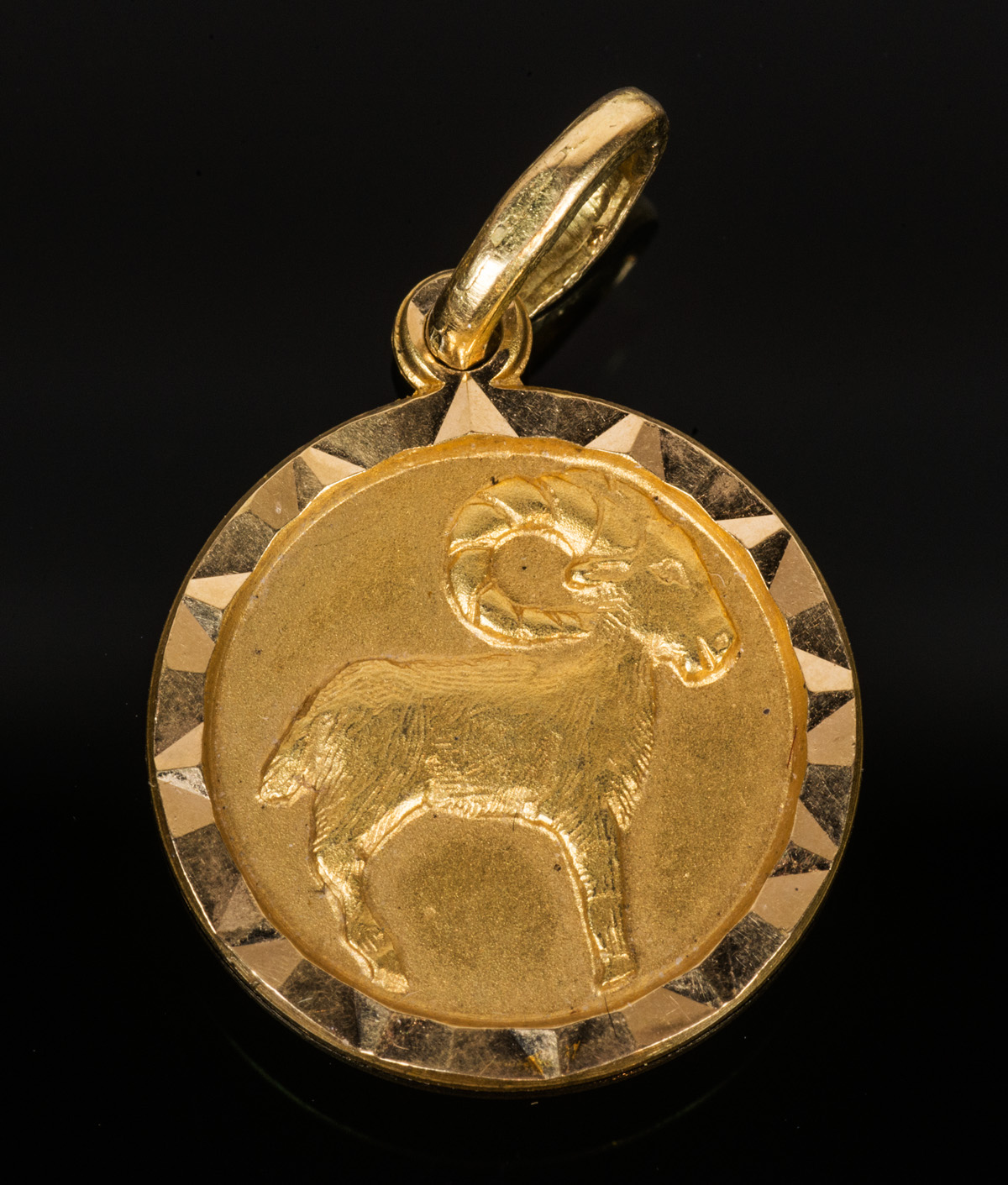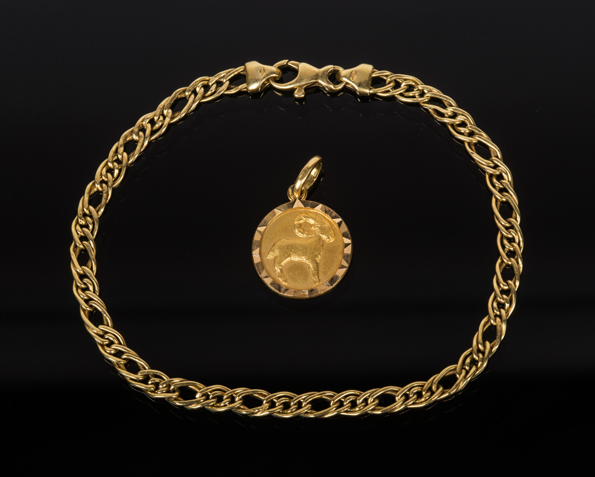 22K yellow gold bracelet, 8″ l, 4.88 gms; and a 22K gold pendant, with a long horn ram, 2.68 gms.