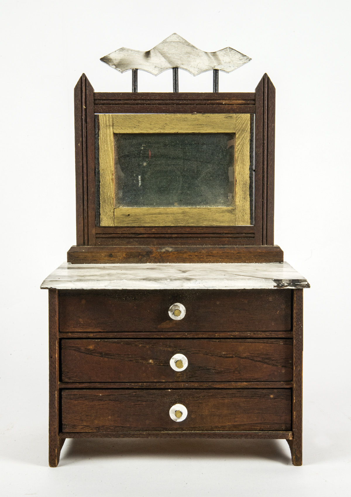 White and gray grained paint, three drawers with painted pulls, oak and pine, 17″ h, 10″ w.