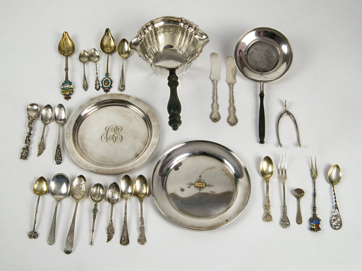 Gorham sauce pan with wood handle, Shreve, Crump & Low; Tea strainer with wood handle; Two small plates; Wishbone tongs; Spoons, forks and knife (20+); 8 oz t.