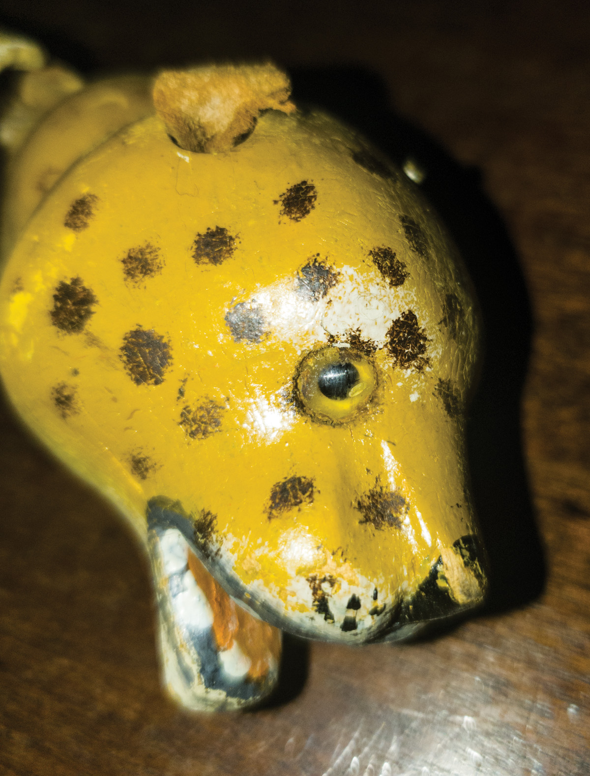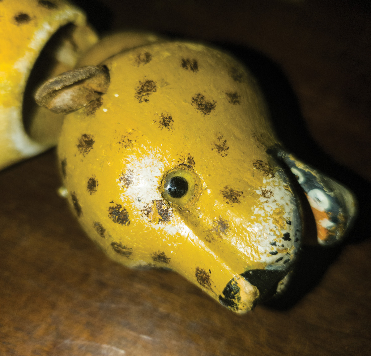Leopard, dog, horse, elephant, and donkey, (horse missing two legs and head detached, elephant missing one leg), fair condition, some paint loss.