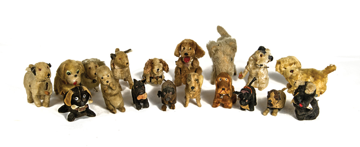 Faux fur covered dogs, mixed sizes, fair condition, many without key, (18 pieces).