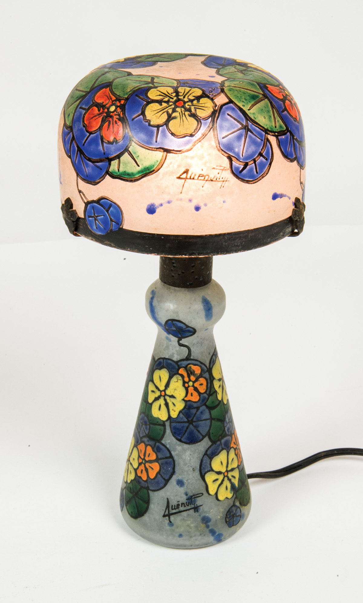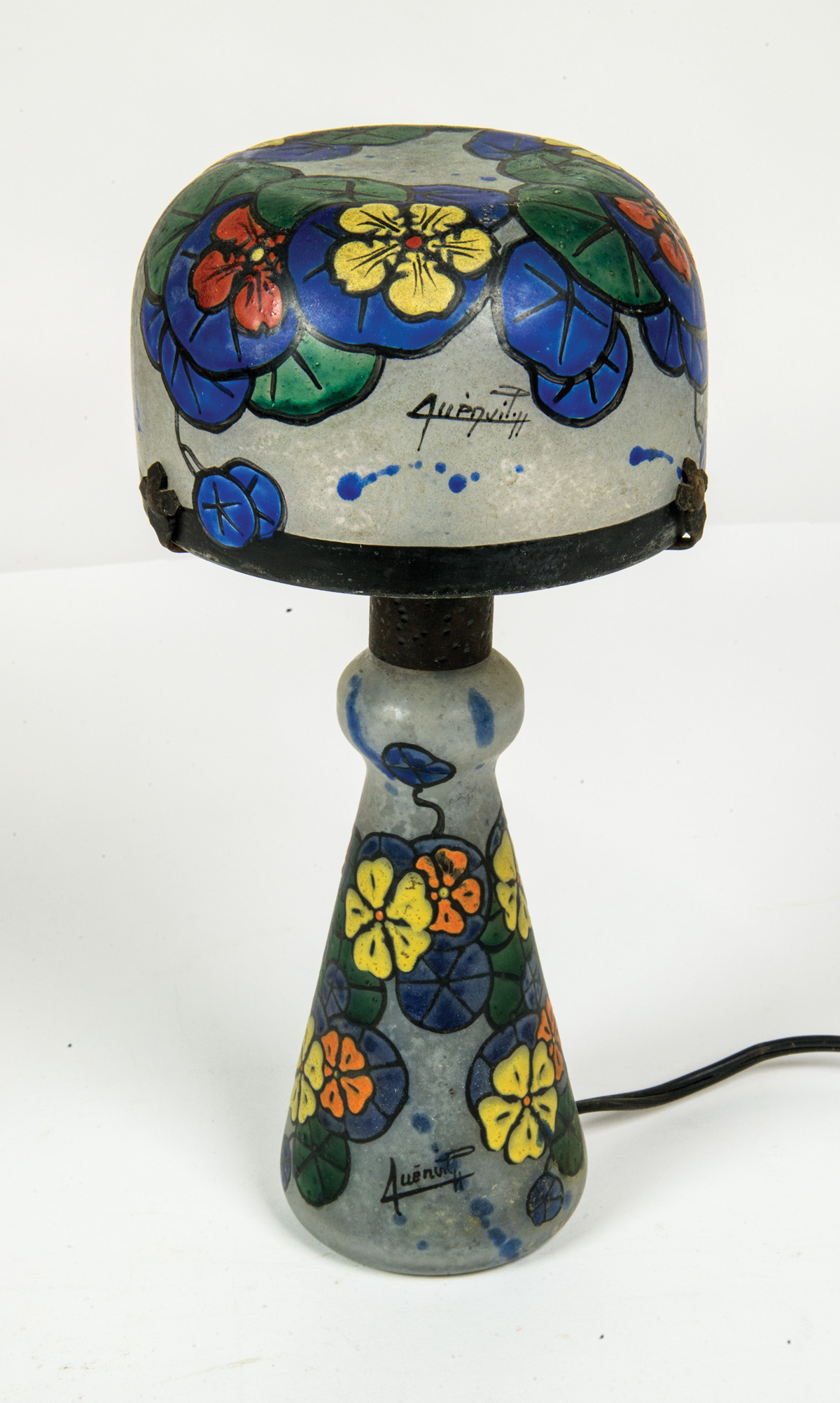 Electrified and weighted glass lamp, with mushroom shaped shade, signed.