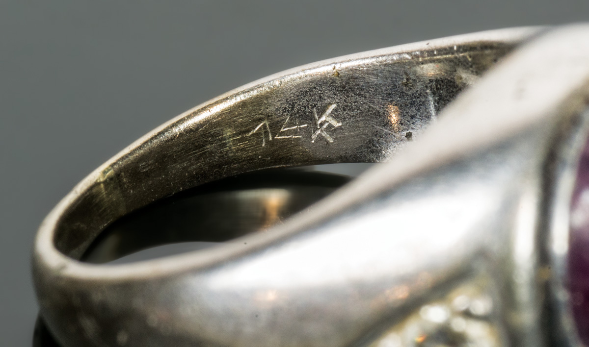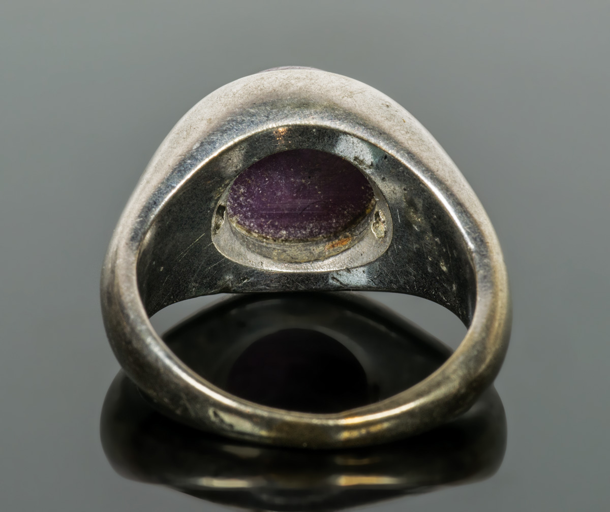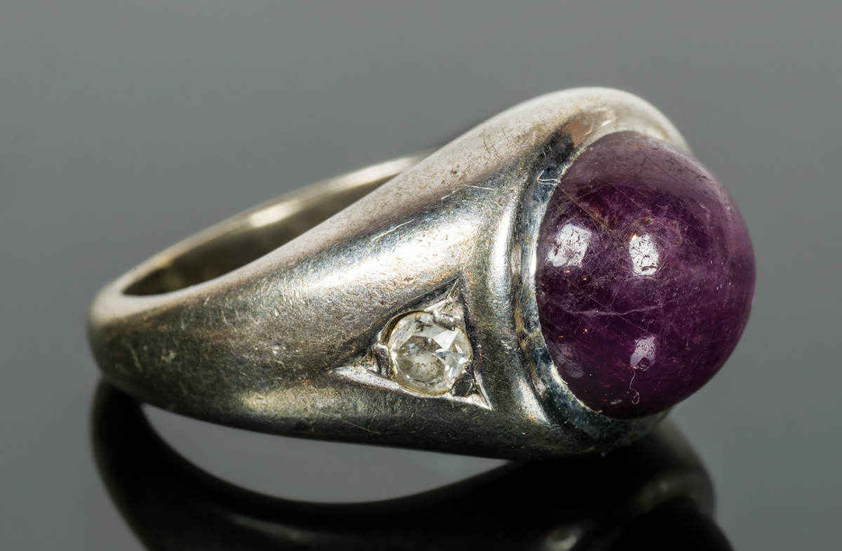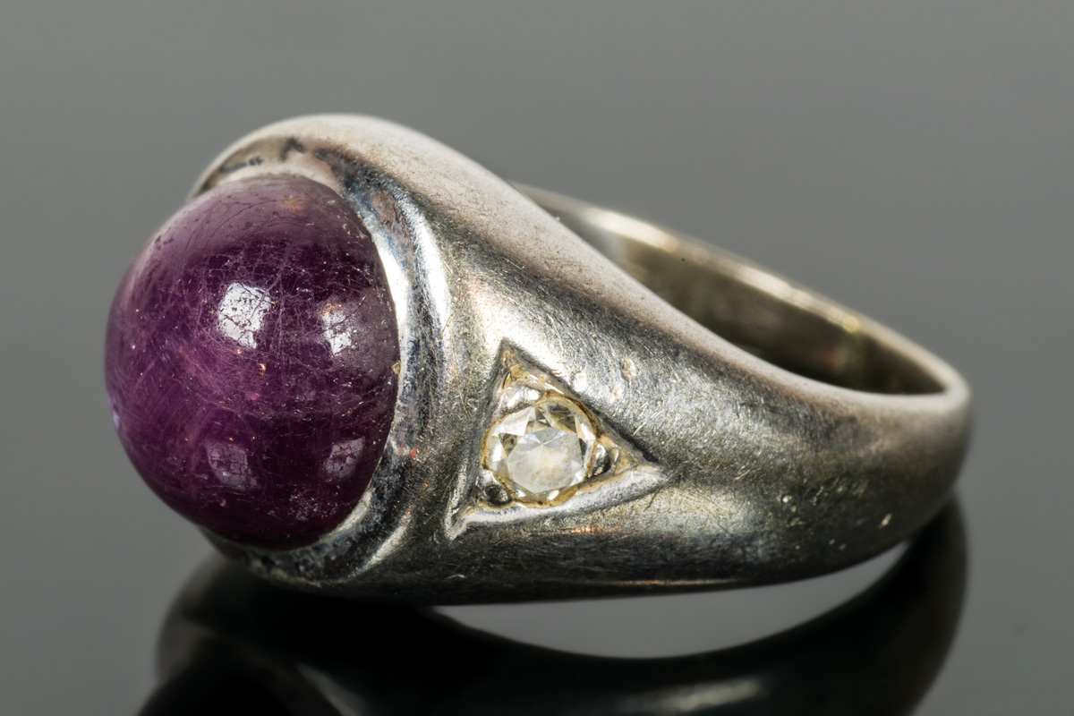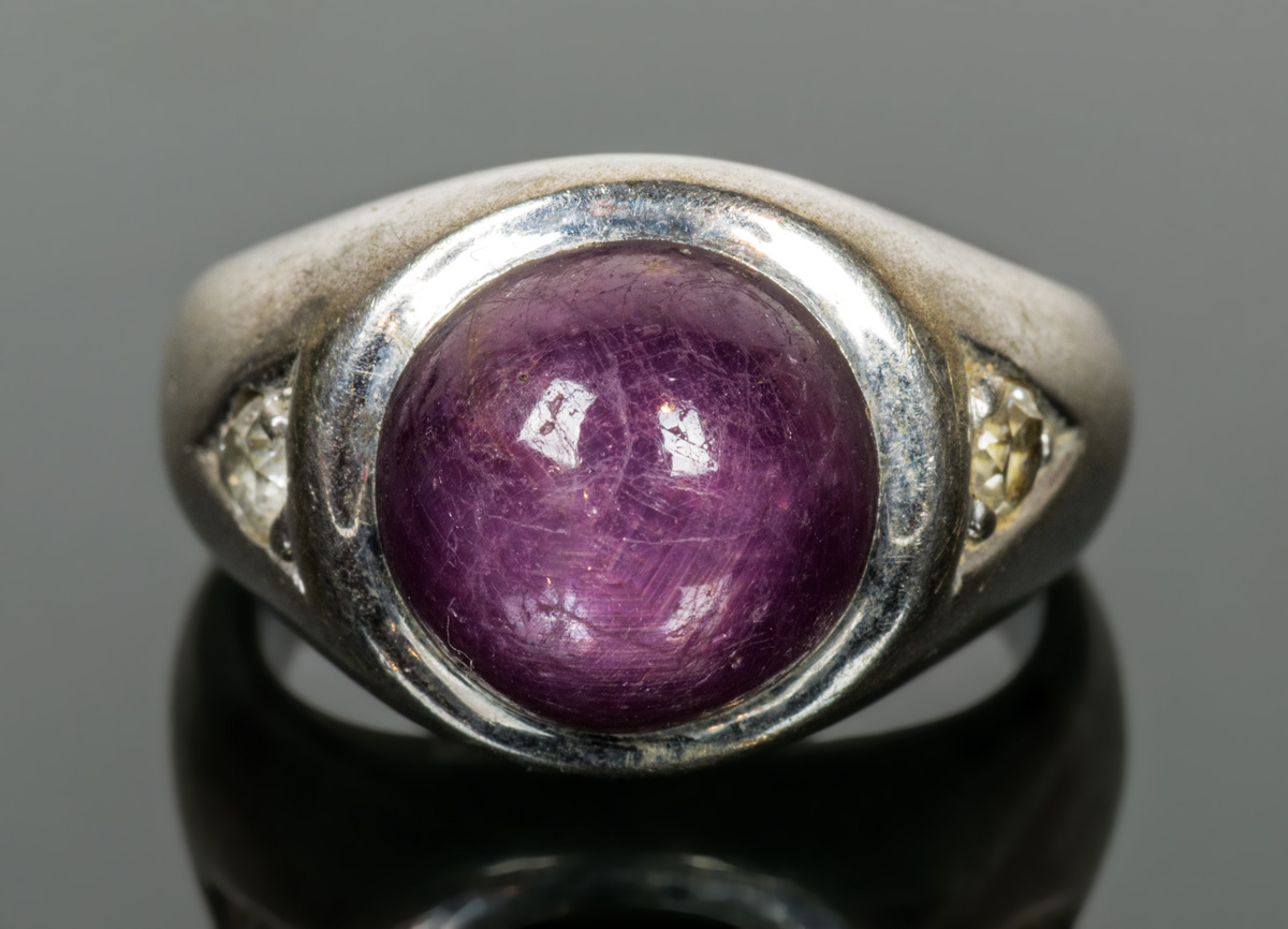 12K white gold ring, with mauve star sapphire with six radiants, flanked by two brilliant cut diamonds (3mm apiece), size 6, 10.15 gms overall wt, .091 ct diamond wt.