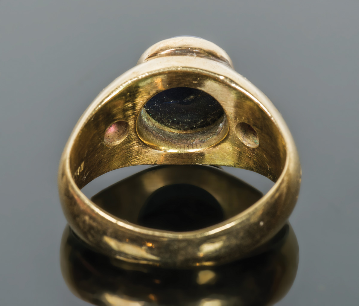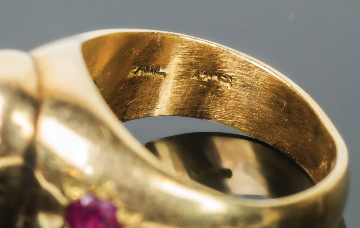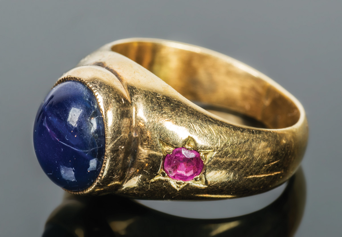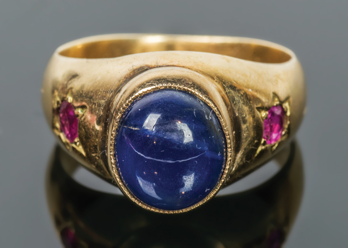 14K yellow gold ring, oval blue sapphire flanked by two rubies, size 5 3/4, 9.03 gms overall wt.