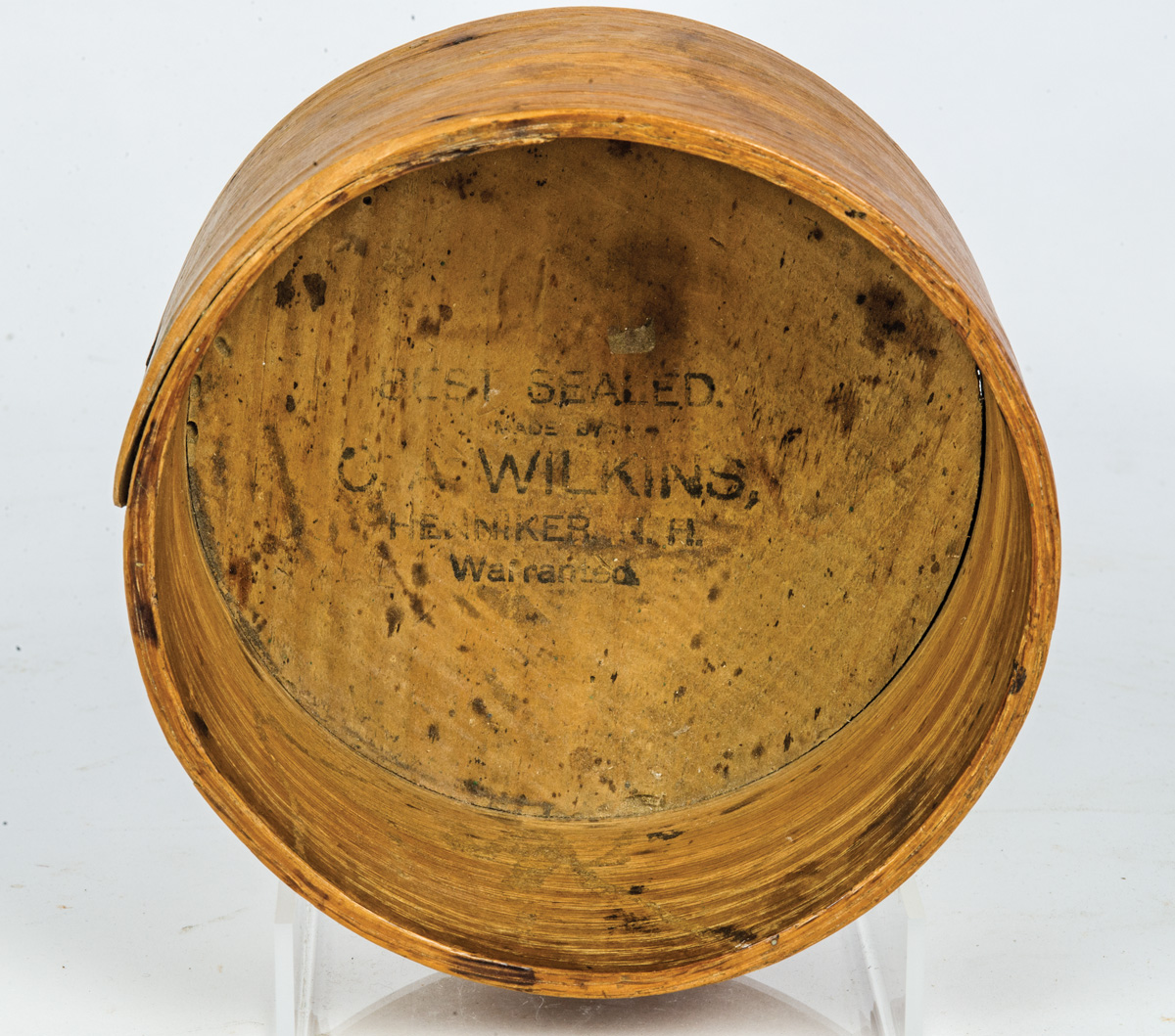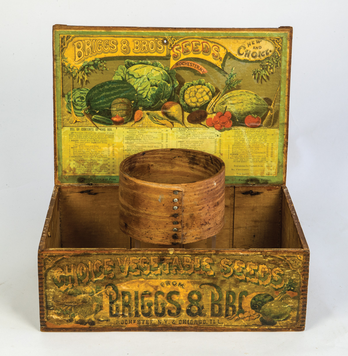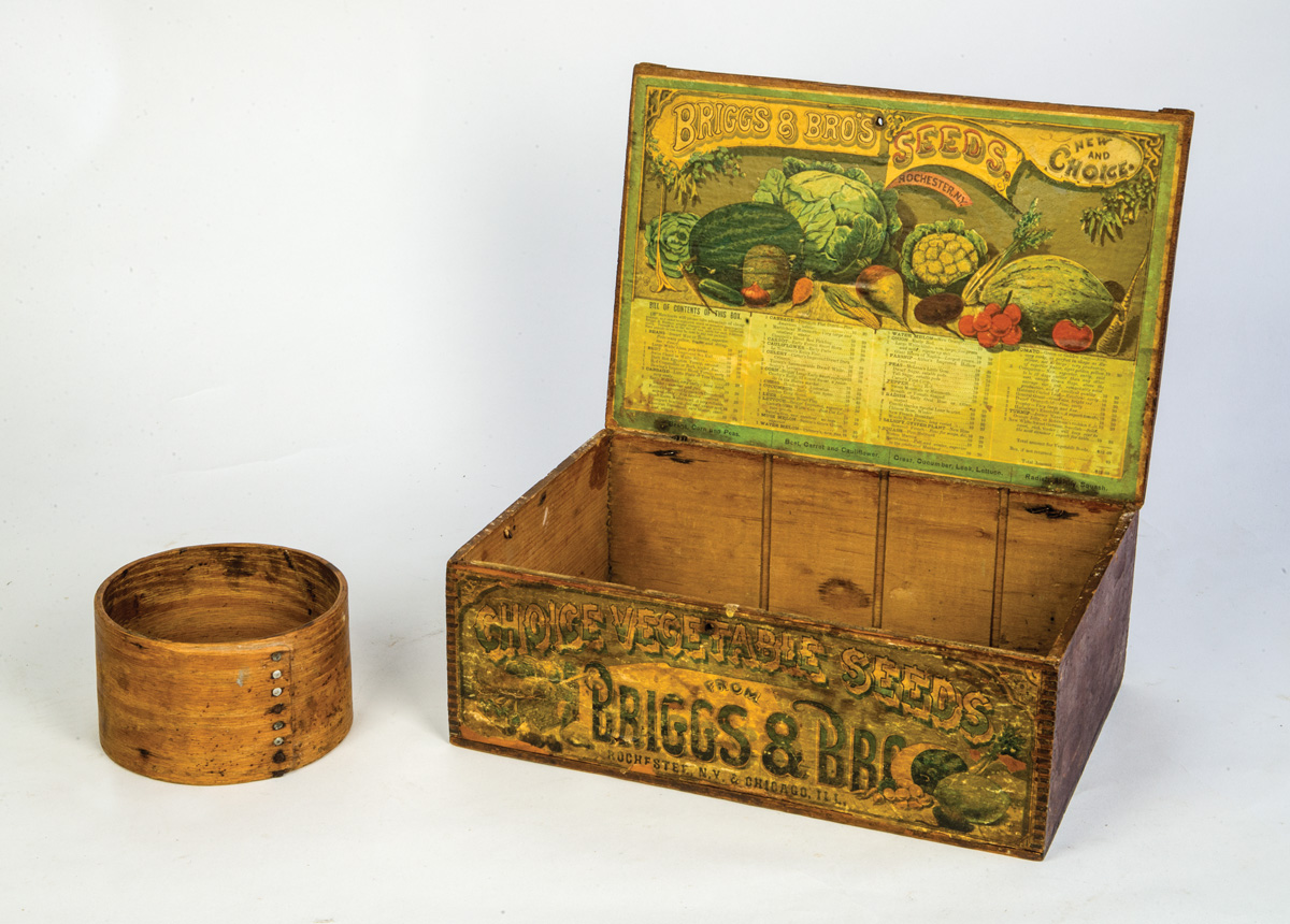 Early 20th c. pine seed box, labeled “Briggs & Bros, Choice Vegetable Seeds”, 5″ h, 14″ w; Dry measure, oak and pine, original finish, stamped “Best Sealed, C A Wilkins, Henniker, N.H. warrented.”, 3 1/2″ h, 6″ dia.