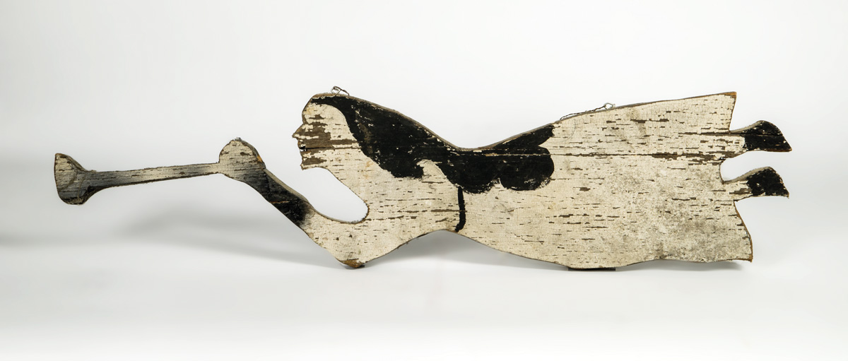 Carved wood wall hanging, Gabriel blowing his horn, white gown, black hair and horn, 8″ x 32 1/2″.