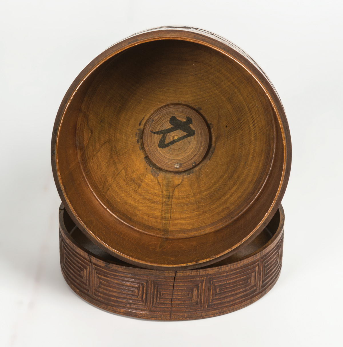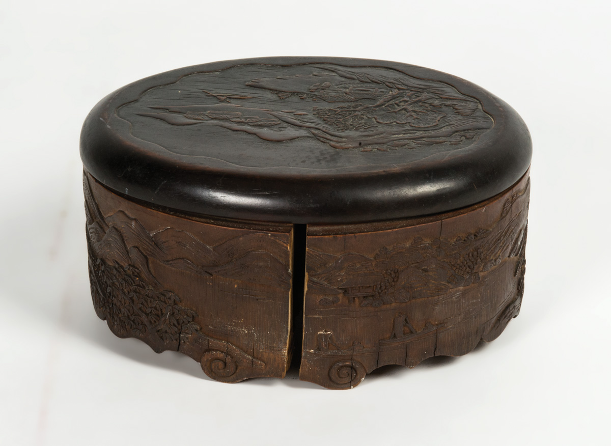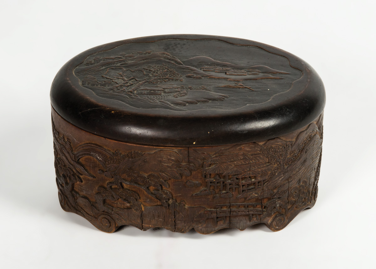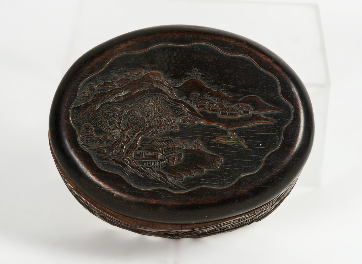 Hand carved round box with lid, 6″ h, 6 1/4″ w; Oval box with lid, seaside carving with coastal village on base, 3 1/2″ h, 7″ w.