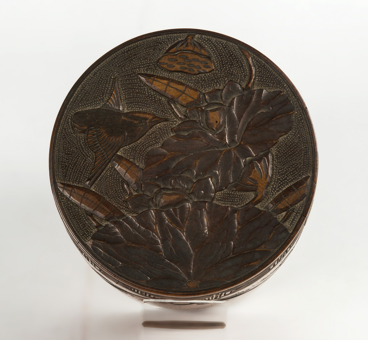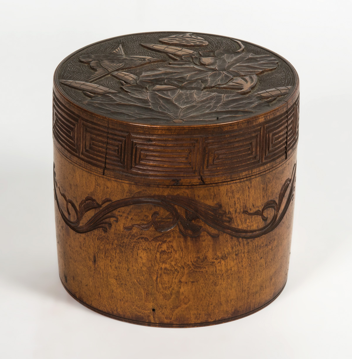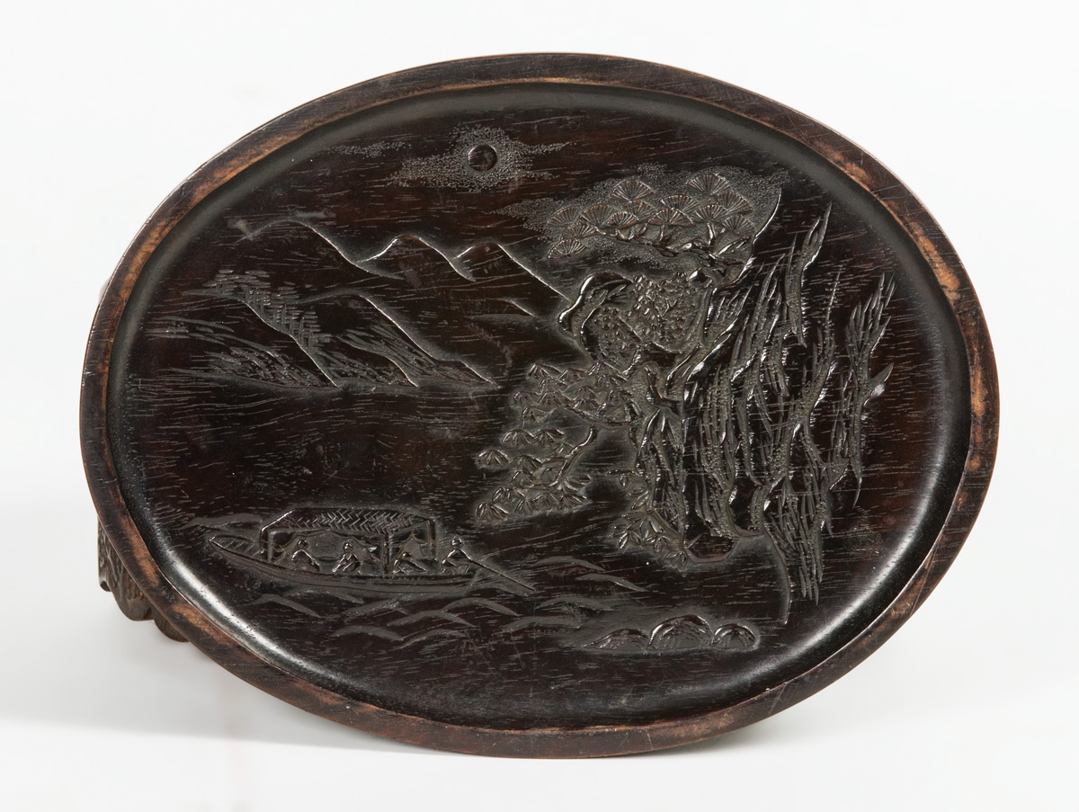 Hand carved round box with lid, 6″ h, 6 1/4″ w; Oval box with lid, seaside carving with coastal village on base, 3 1/2″ h, 7″ w.
