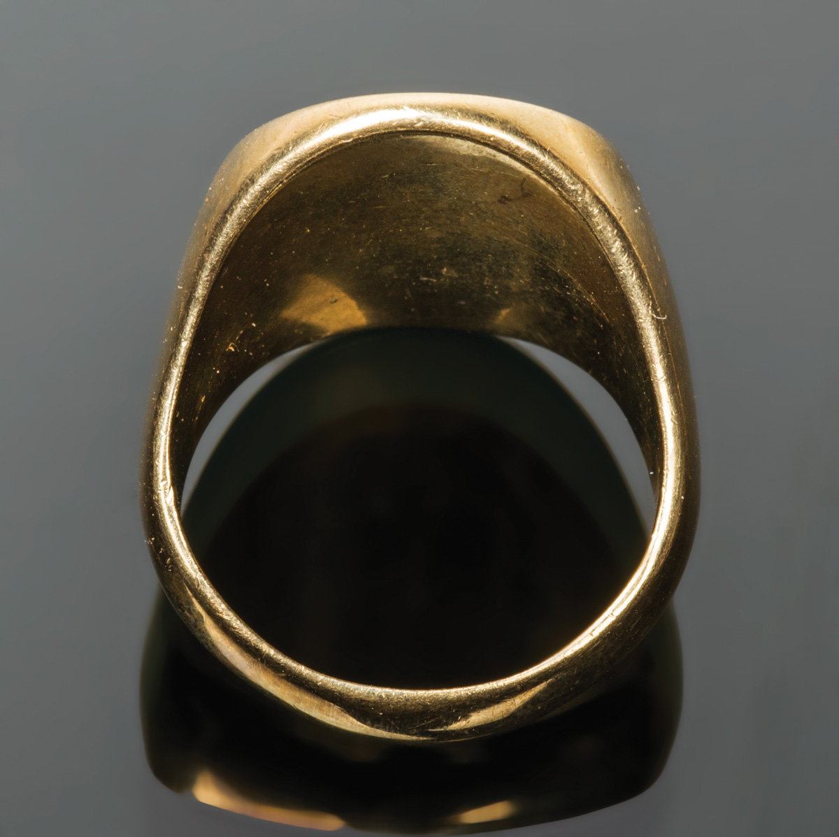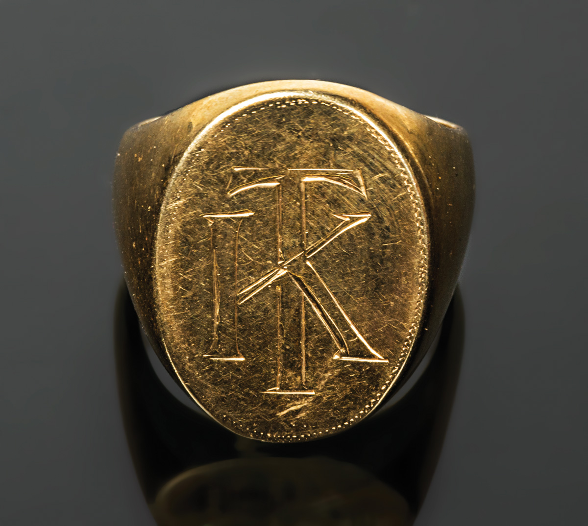 14K yellow gold ring, size 12, 28.89 gms, initialed “TK” on top, (could be polished down).