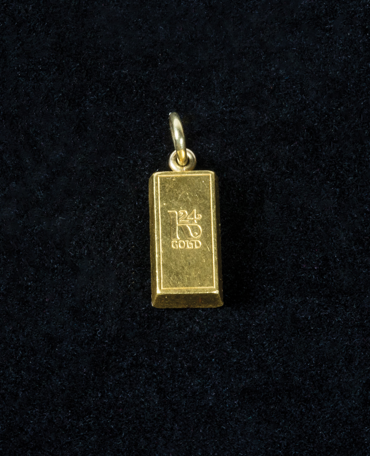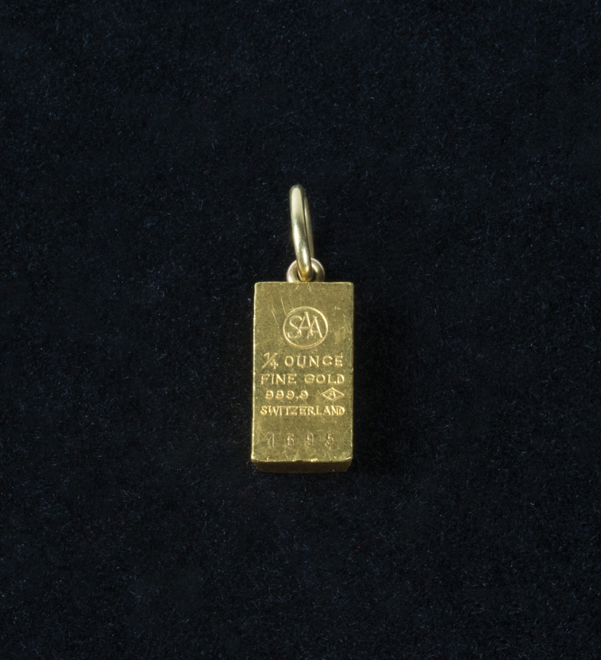 24K yellow gold ingot, miniature bar pendant, “1/4 oz, Fine gold 999.9, Switzerland, 1695”.