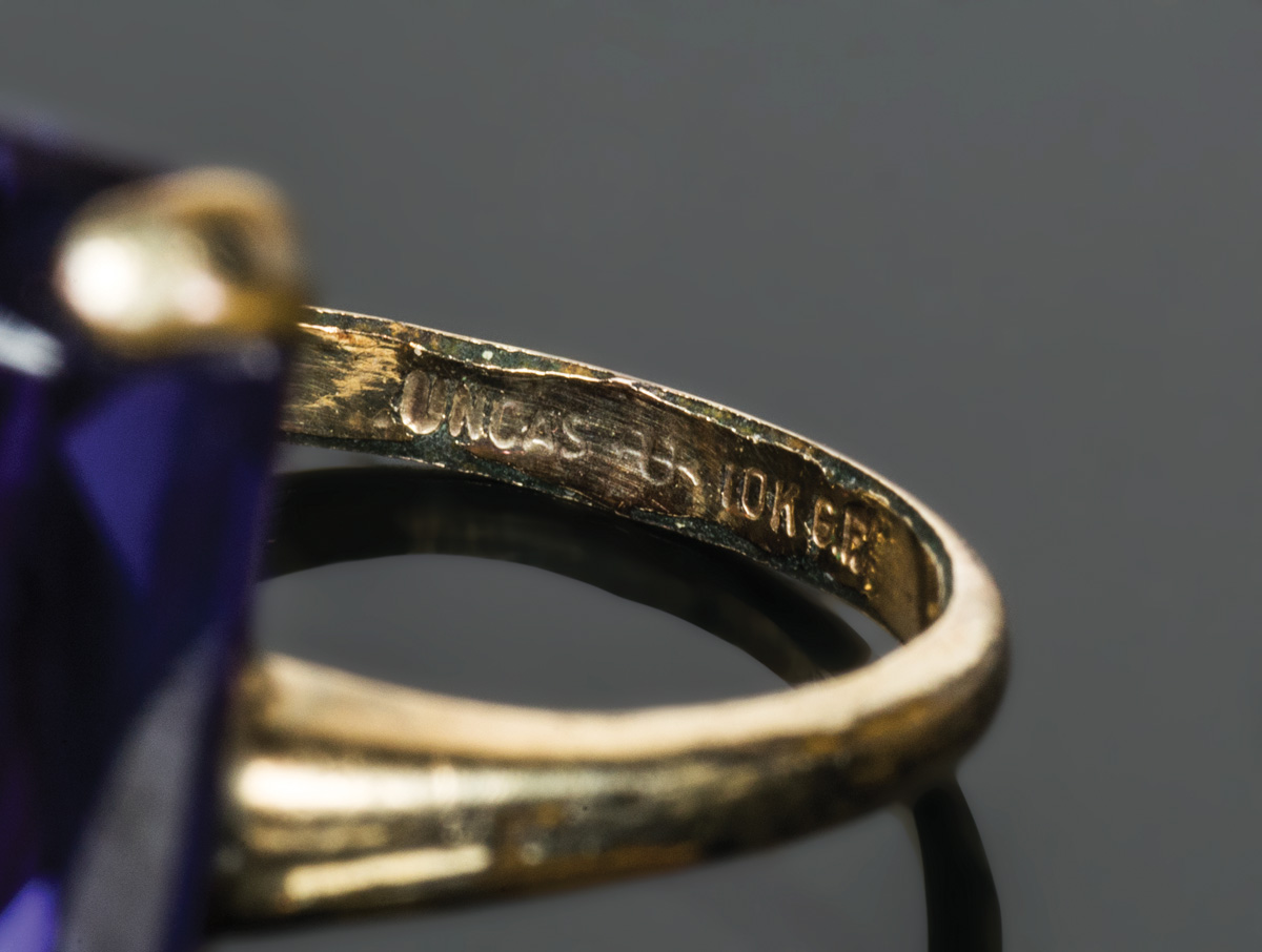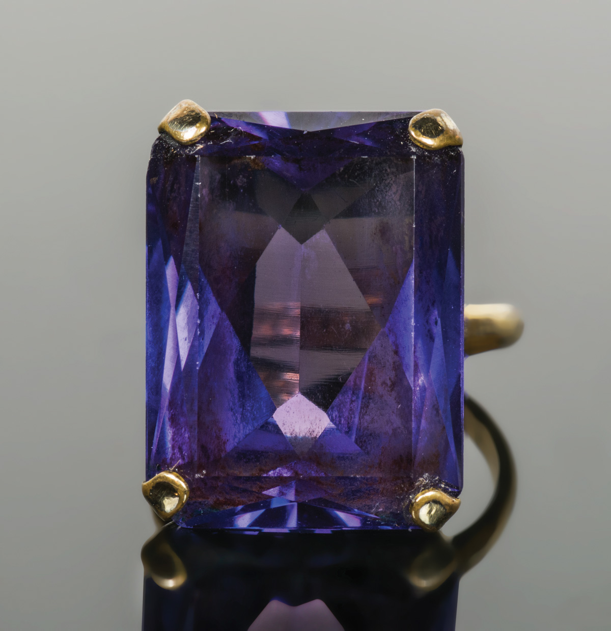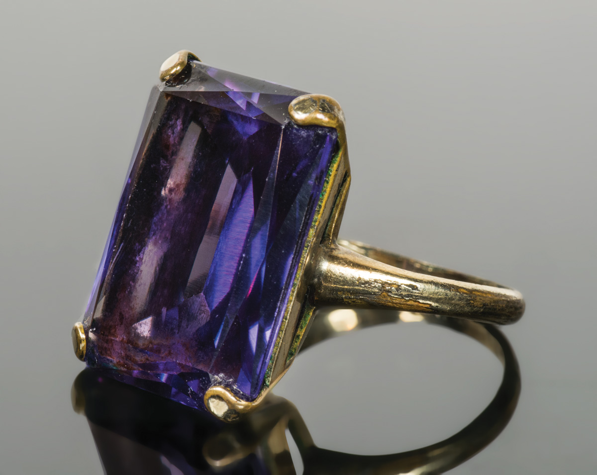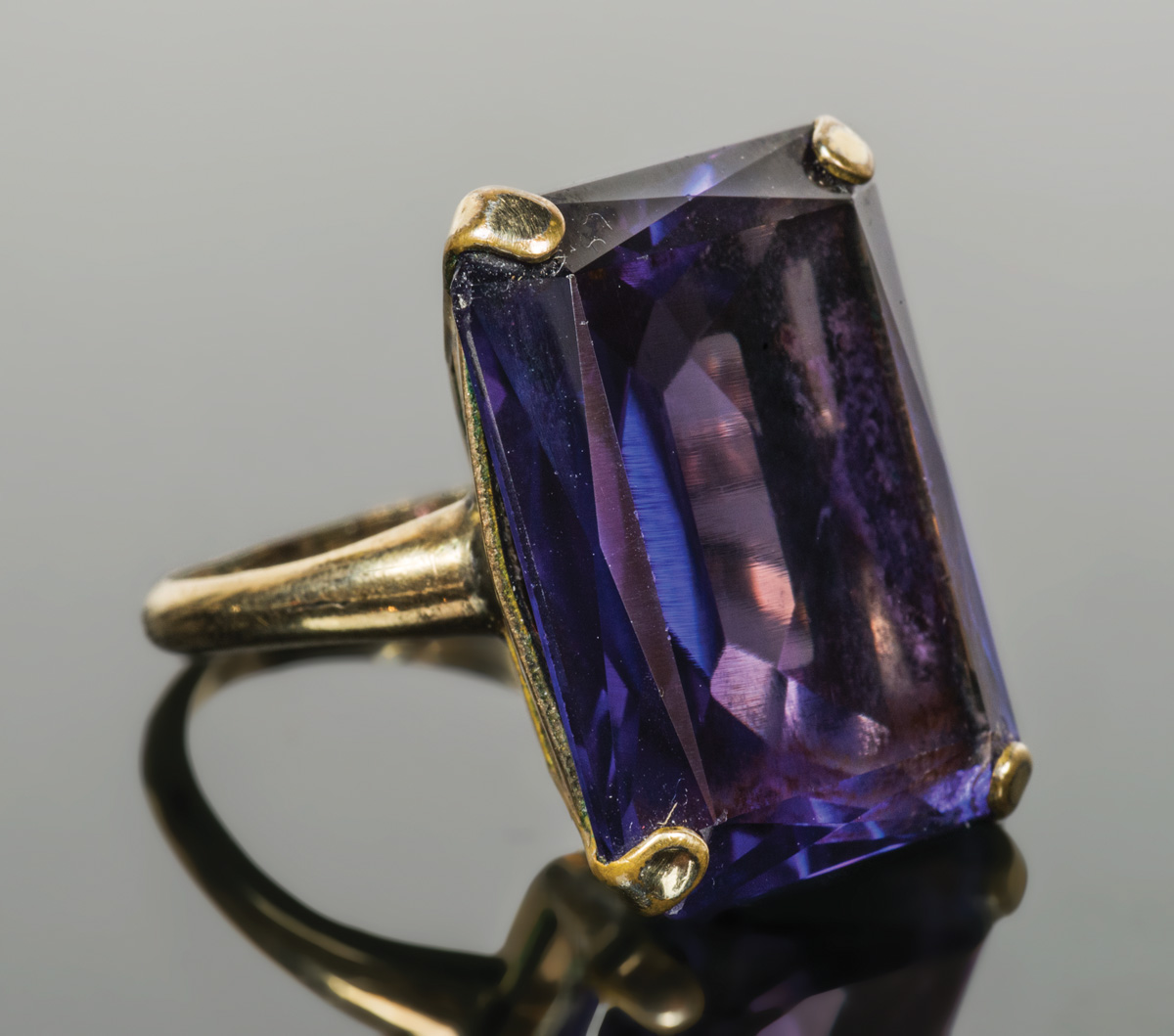 10K gold ring, mixed cut rectangular red and blue color change sapphire, 21mm x 16mm stone, size 5 3/4, 7.34 gms overall wt.