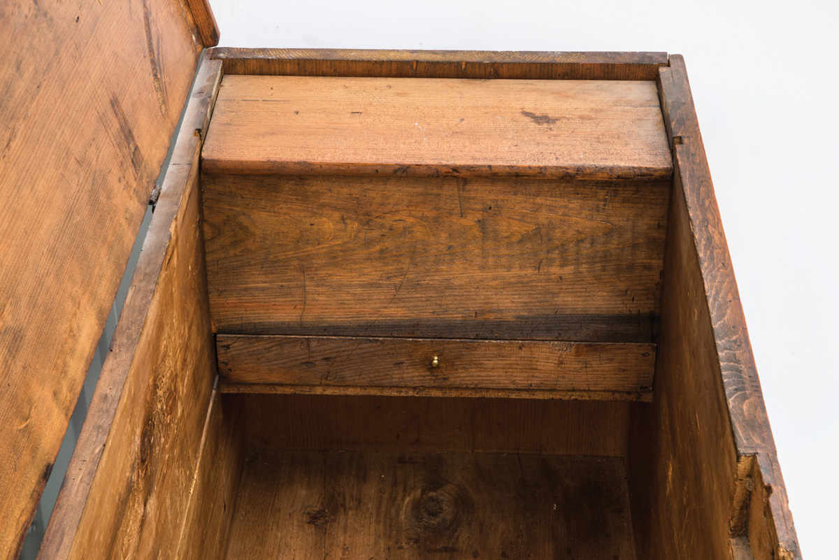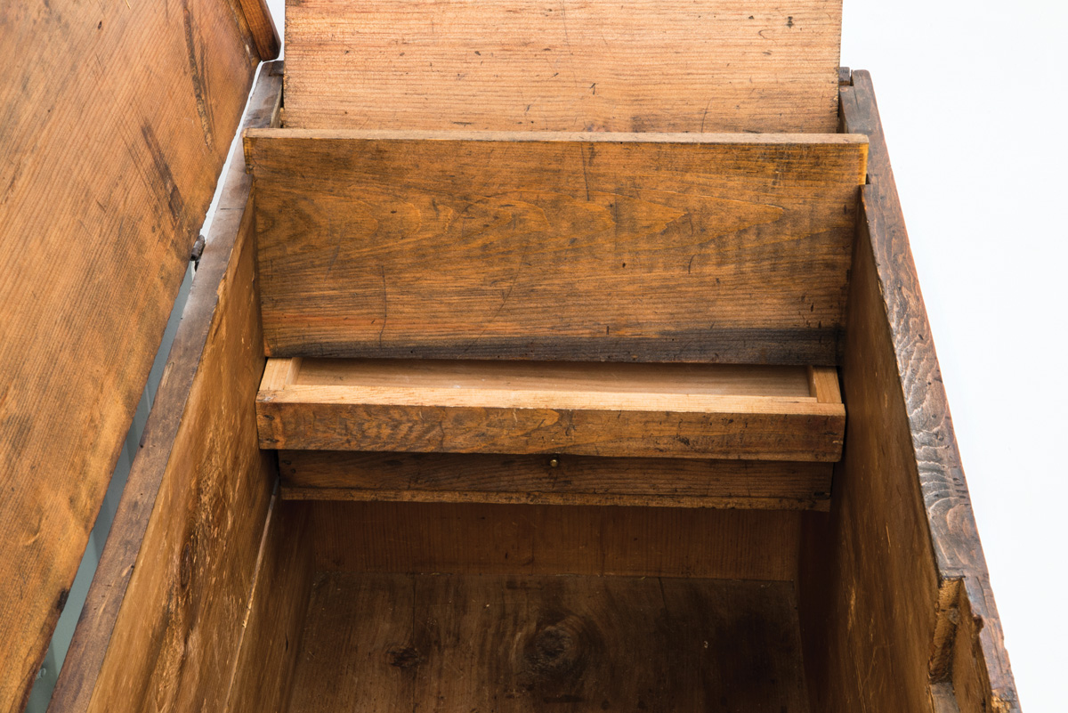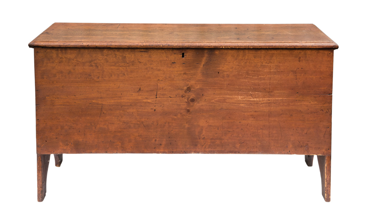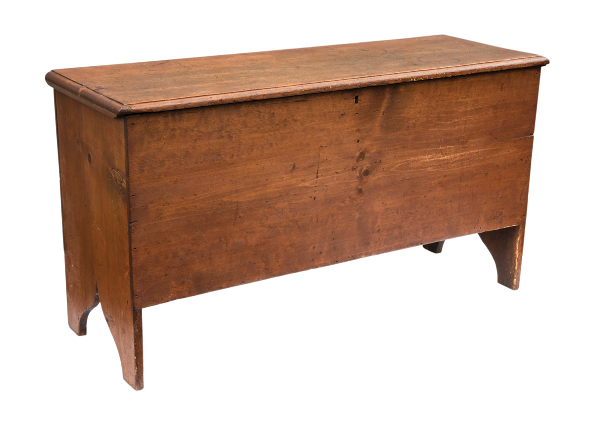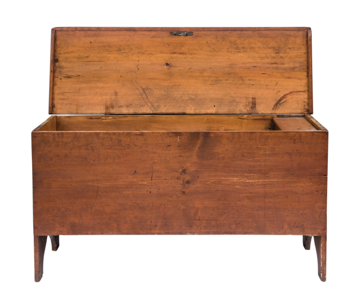 New England, pine, original red stained finish, molded lid, till with sliding door and secret compartment, initialed “I P” in red on back, drawer below, bootjack ends, 27″ h, 48″ w, 17″ d.