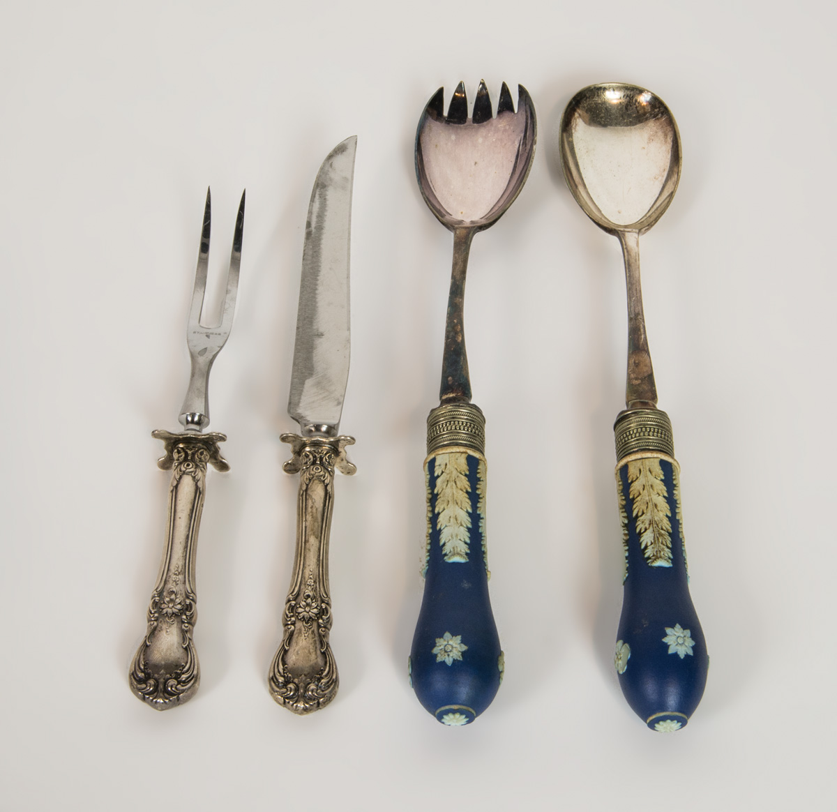 Serving fork and spoon, Wedgwood; and sterling handled knife and fork set.