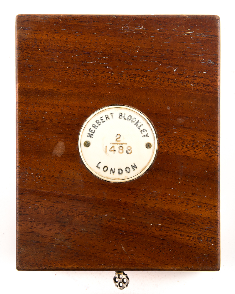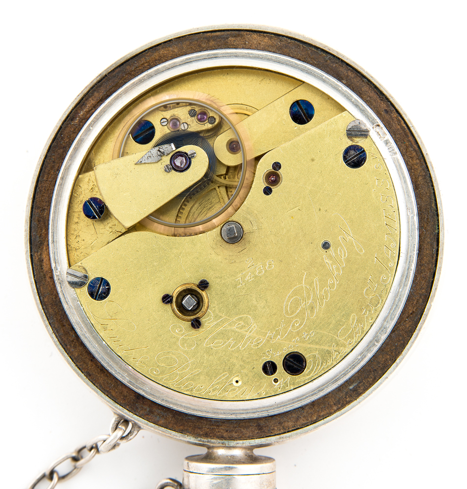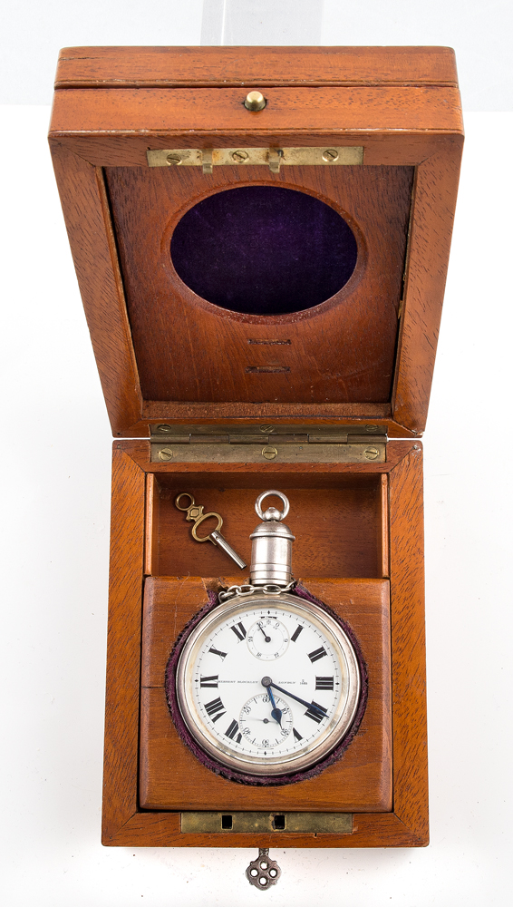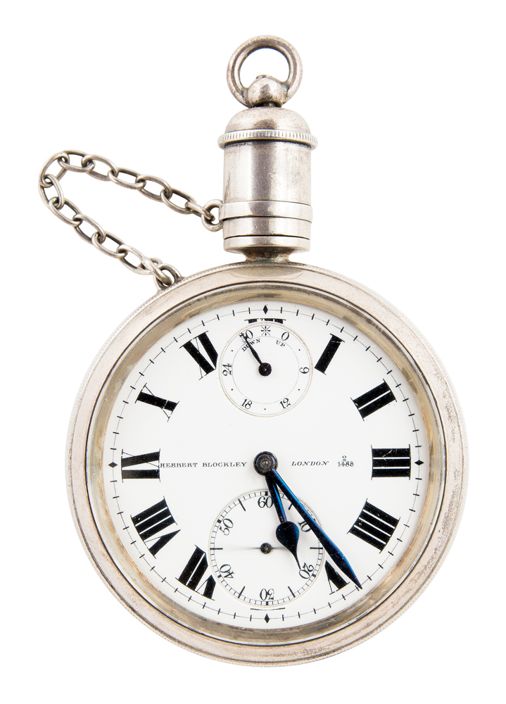 Herbert Blockley, c. 1900, double sunk porcelain up/down indicator, dial engraved “Royal Geographical Society Sir Ernest Shackleton”, silver screw, 17-jewel mount, back case hallmarked “London 1907”, winds, sets and ticks, very good condition, complete, original mahogany double hinged case with key, 55mm case.