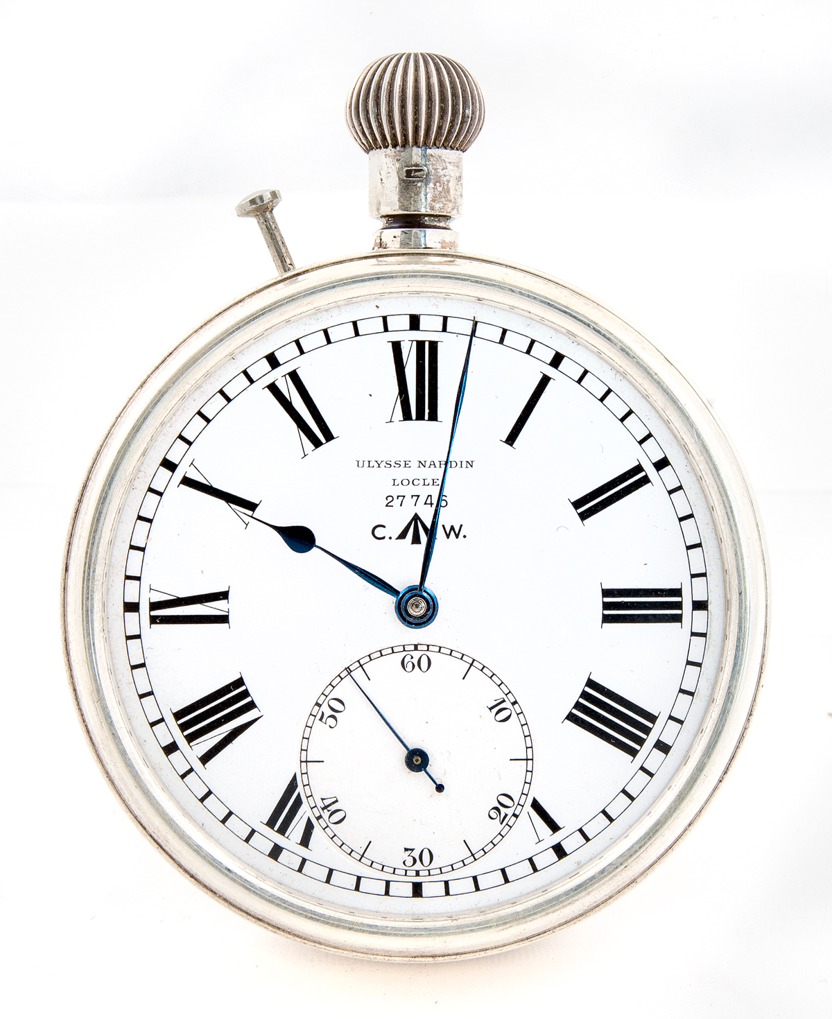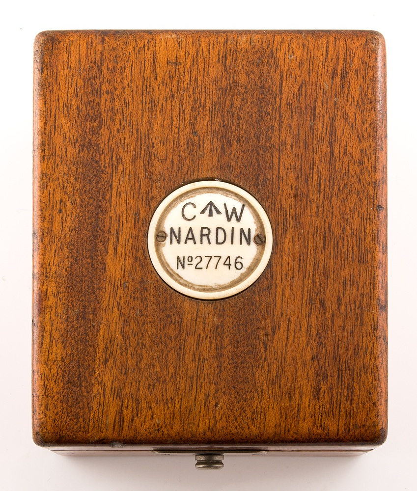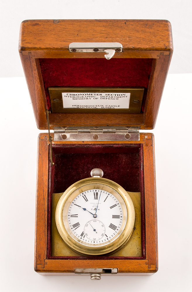 Ulysse Nardin, Le Locle, Switzerland, c. 1910, serial #27746, Royal Hydrographic Dept. with Admiralty Broad Arrow mark on face, movement and case, sterling case engraved “H.S. 2”, winds, approximate 20-size, 21-jewel movement, Swiss movement electro gilded pin set, single sunk dial, original blued steel hands, high quality, needs servicing, brass case in two-tier box and Nardin plaque, 66mm brass mounting case, 55mm watch case.