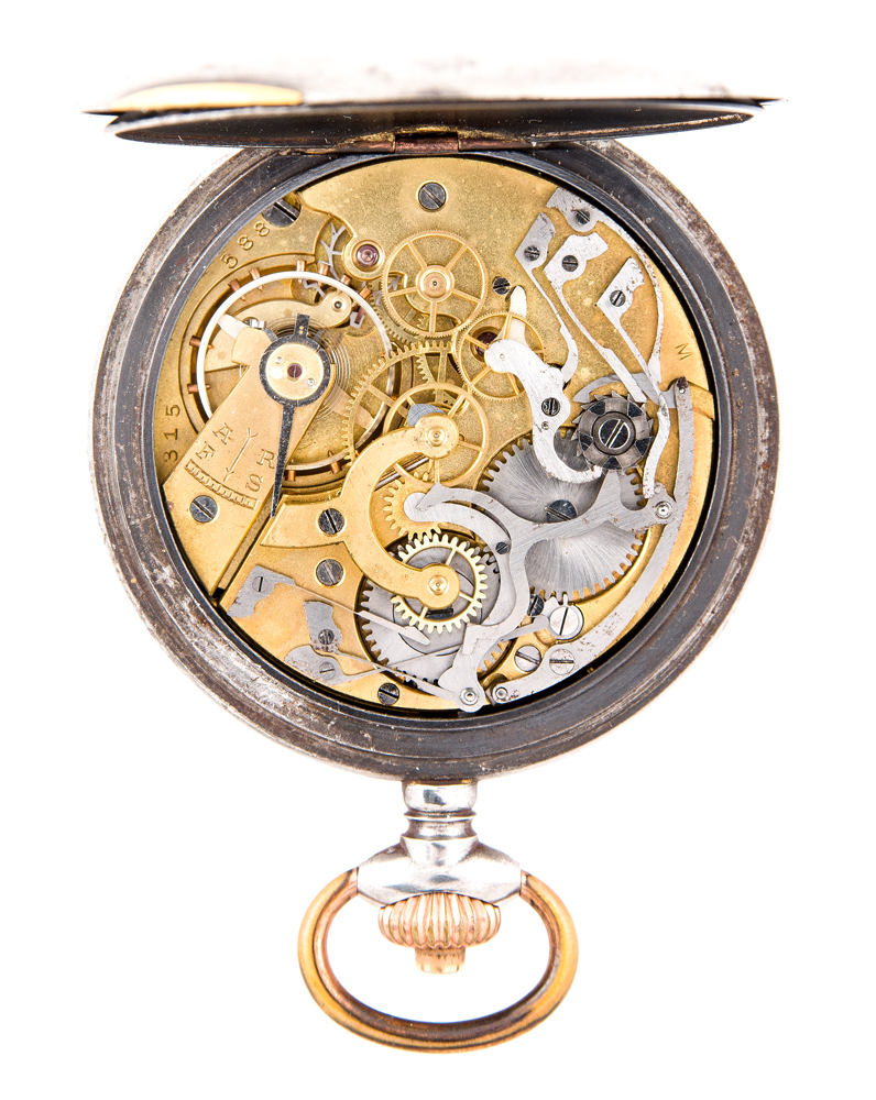 Versailles, France, enamel dial, gun metal blueing interior, case and dust cover, allion movement, engraved “Captain E.V. Rickenbacker, 94th Squadron”, (Eddie Rickenbacker won a congressional medal of honor), 50mm case.