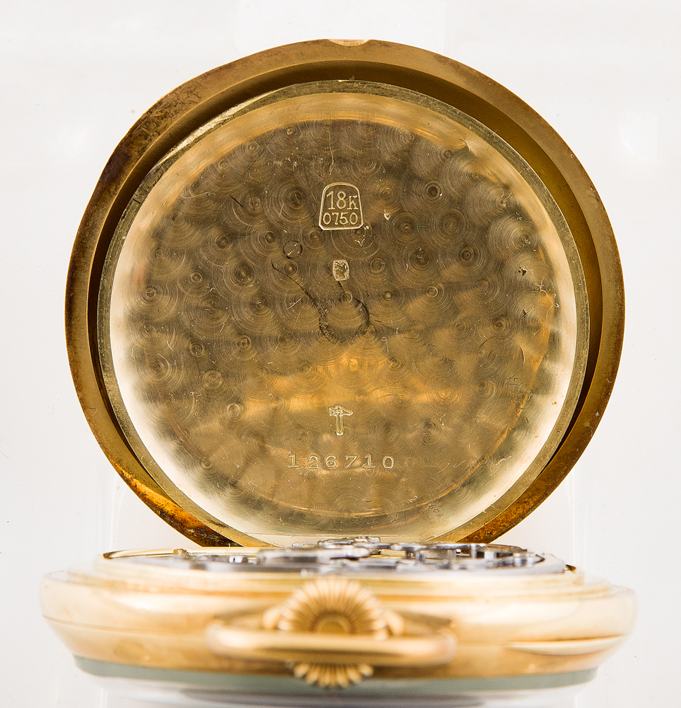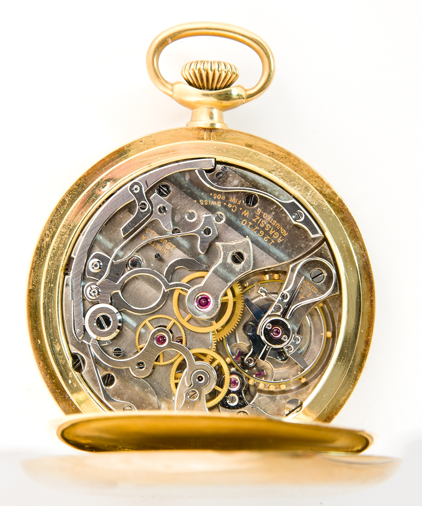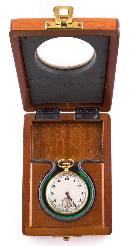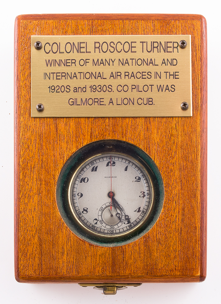 Agassiz Watch Co., S.A., Geneva, Switzerland, 18K gold case, chronograph movement, brass plaque engraved “Colonel Roscoe Turner”, presented by Pratt and Whitney Aircraft Company, cuvette case, 19-jewels, Agassiz movements, winds, sets and ticks, sweep seconds, centers, stop/start and rewind, some dents, 45mm case.