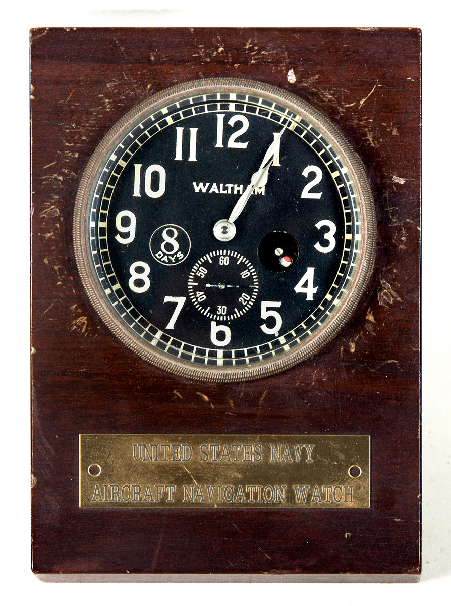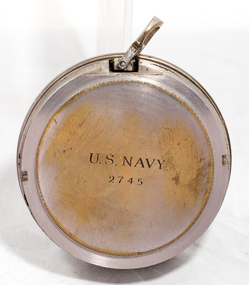 Black painted dial, damaskeening movement, labeled “Waltham Watch Company”, c. 1910, 8-day, 37S-size, 15-jewels, adjusted, captive winder and setting stem, up/down indicator, good dial, beveled crystal, coin edged front and case back, back engraved “U.S. Navy #2745, Serial #15142745”, winds, sets and ticks, in very good condition, 78mm case.