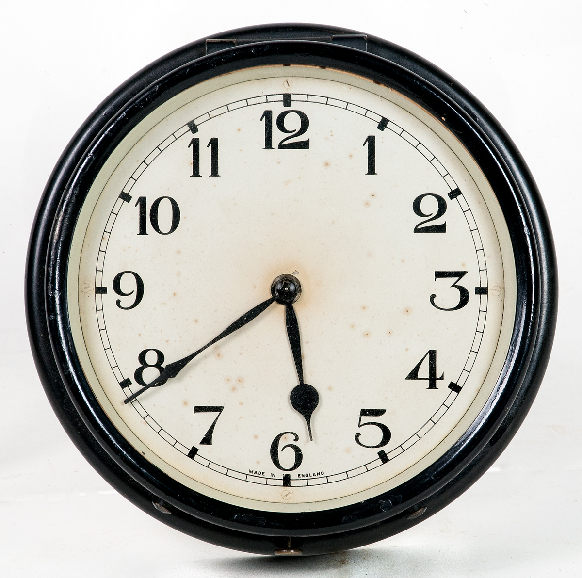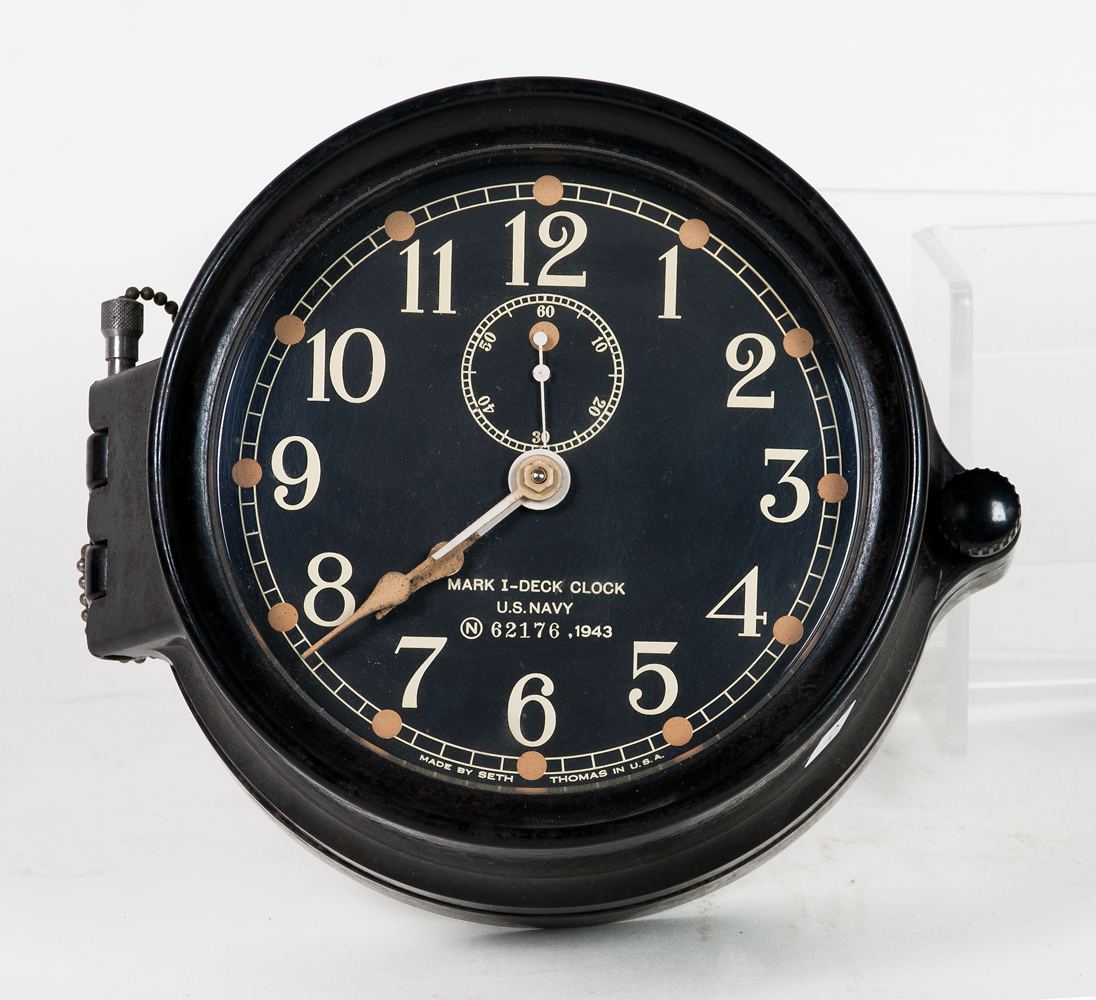Seth Thomas, Mark I-Deck Clock, U.S. Navy, 62176, 1943, 6 1/2″ bulkhead mount, 15-jewels, back wind and set, hacking seconds, spit partial luminous hand and dial markings, convex crystal, and phenolical case; Smiths Air Ministry wall clock, “made in England”, 7″ dia.