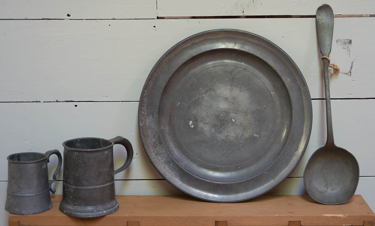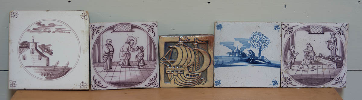Collection of five ceramic tiles, 18th c. Delft, etc. man in hat fishing, 6″ x 6″, 5″ x 5″ (3), 4″ x 4″; Small collection of early American pewter, including two tankards, 4 1/2″ and 3 1/2″ h; a charger, 12″ dia; and a long handled spoon, 13 3/4″ l.