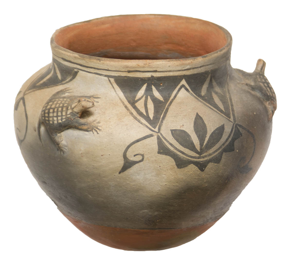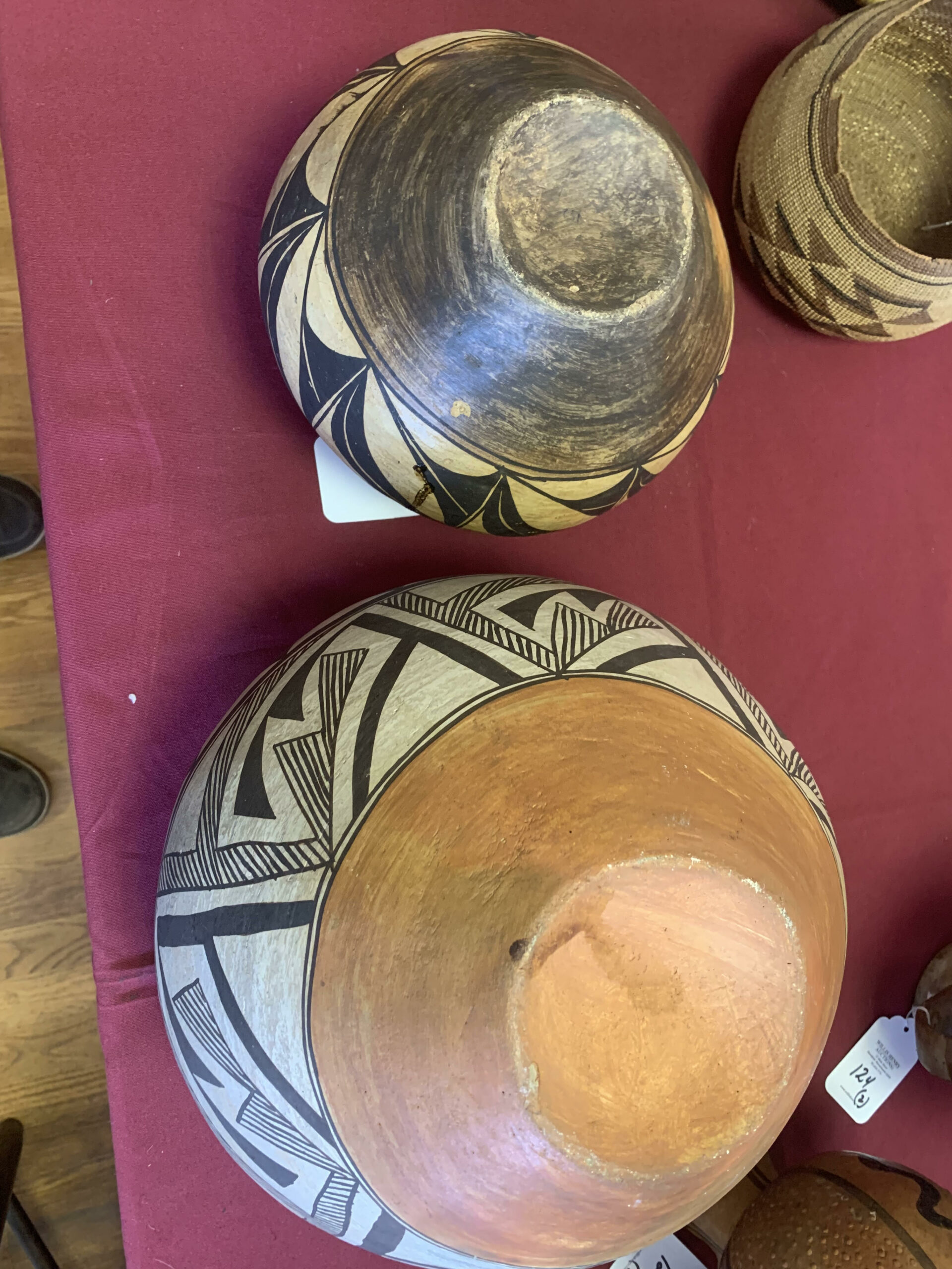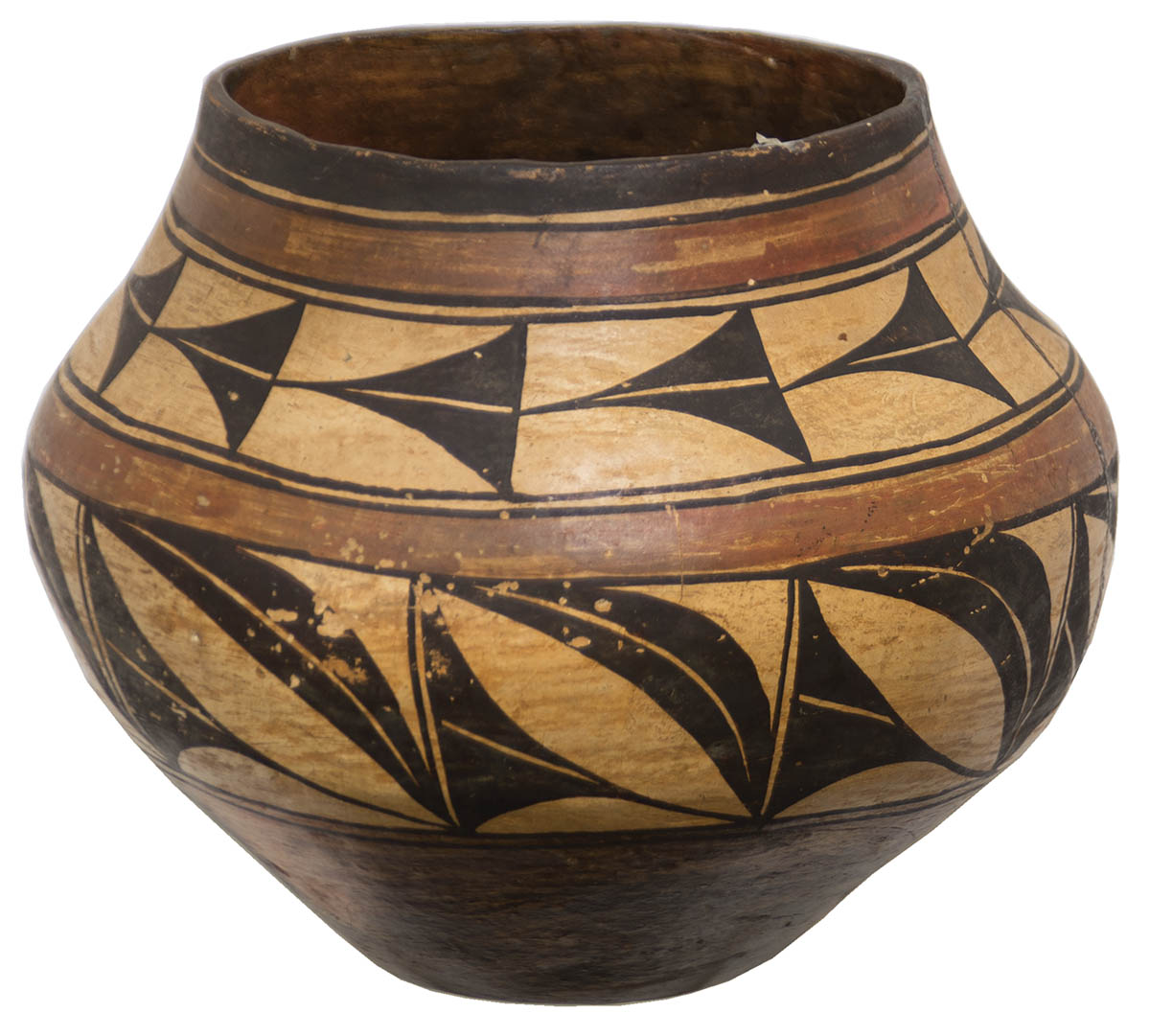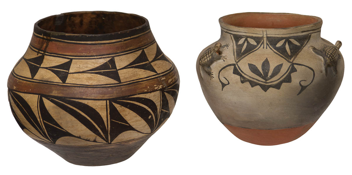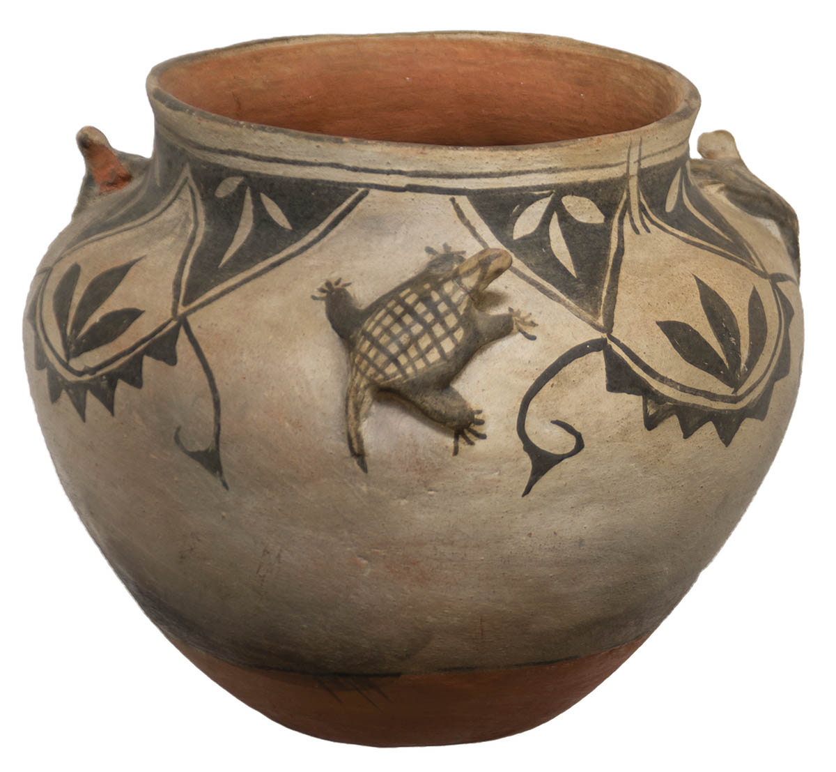 Early Acoma Pueblo olla, polychrome, inverted base, some wear at widest part and drips from rim, 7″ h, 8″ w; and a smaller Pueblo olla, with black and white decoration, and three applied turtles, 6″ h, 7 1/2″ w.