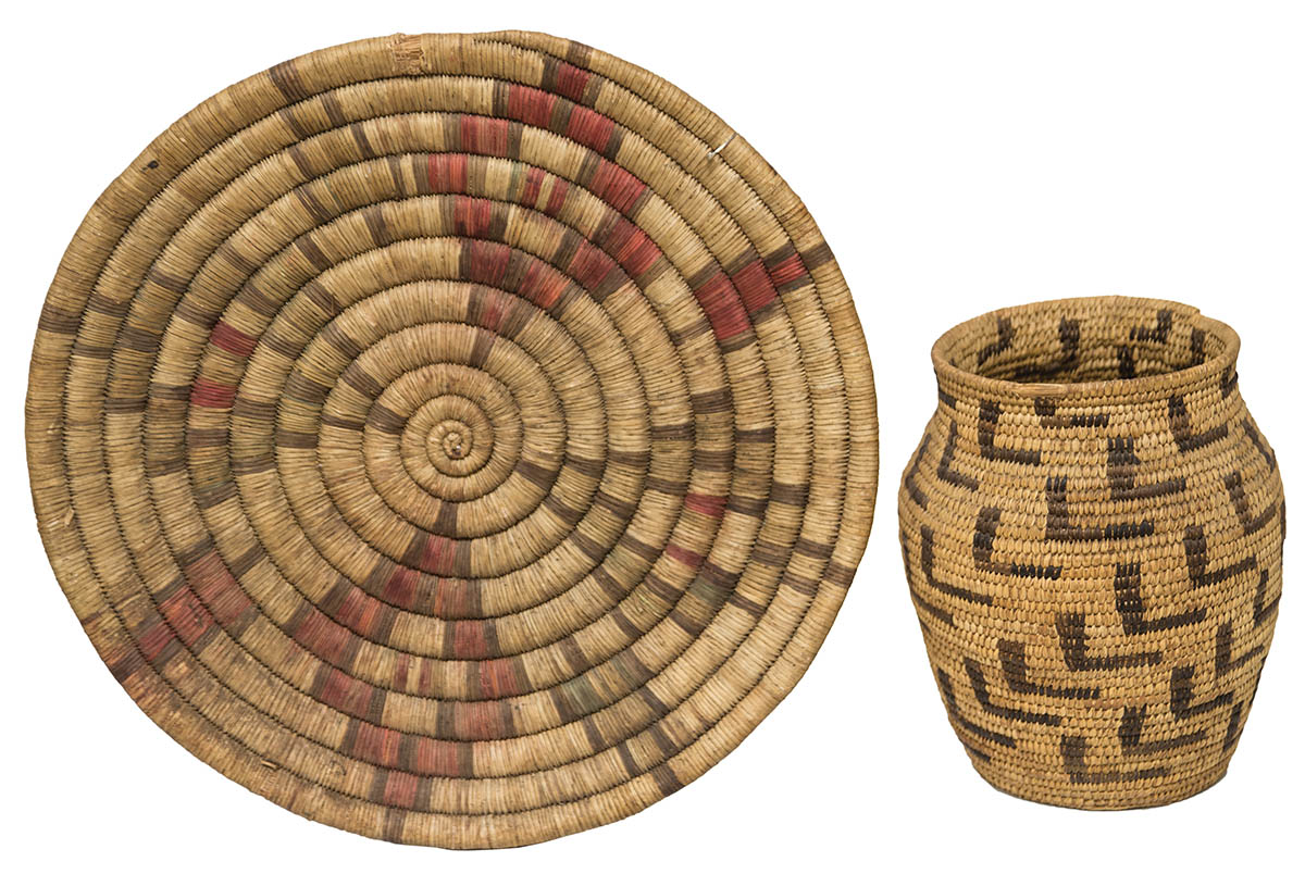Navajo polychromed wedding tray, 15 1/2″ dia; and a woven basketry jar with geometric decoration, 9″ h.