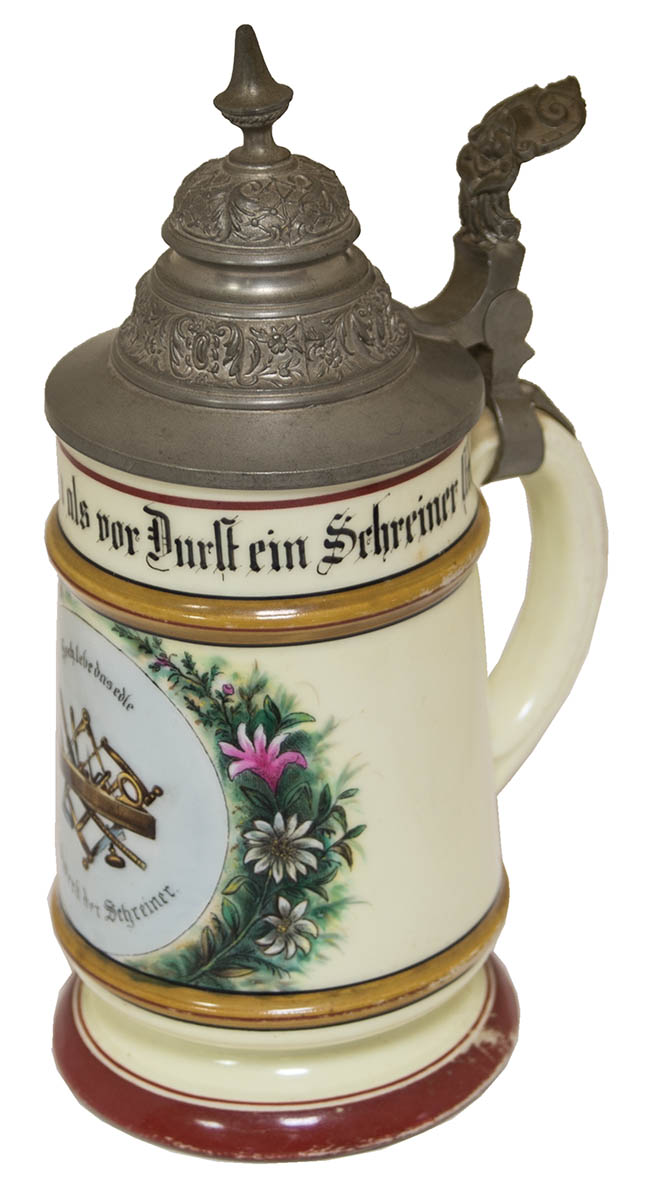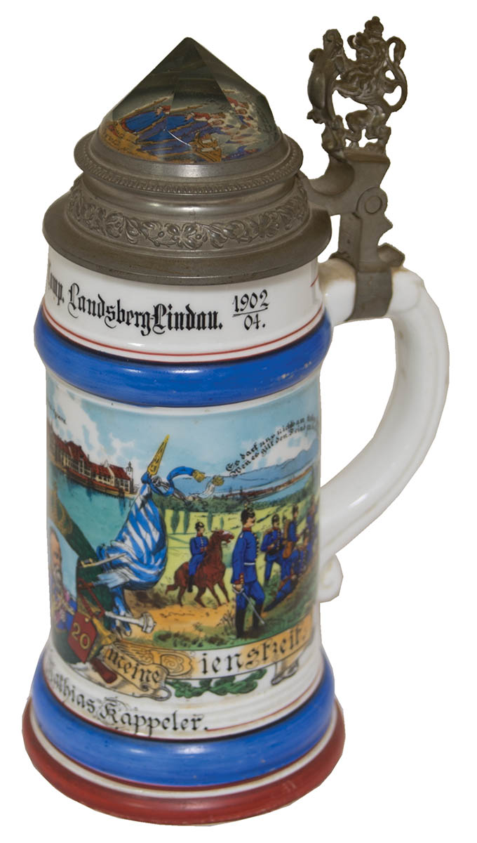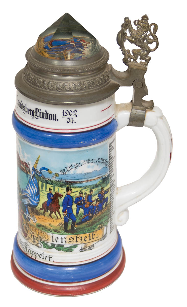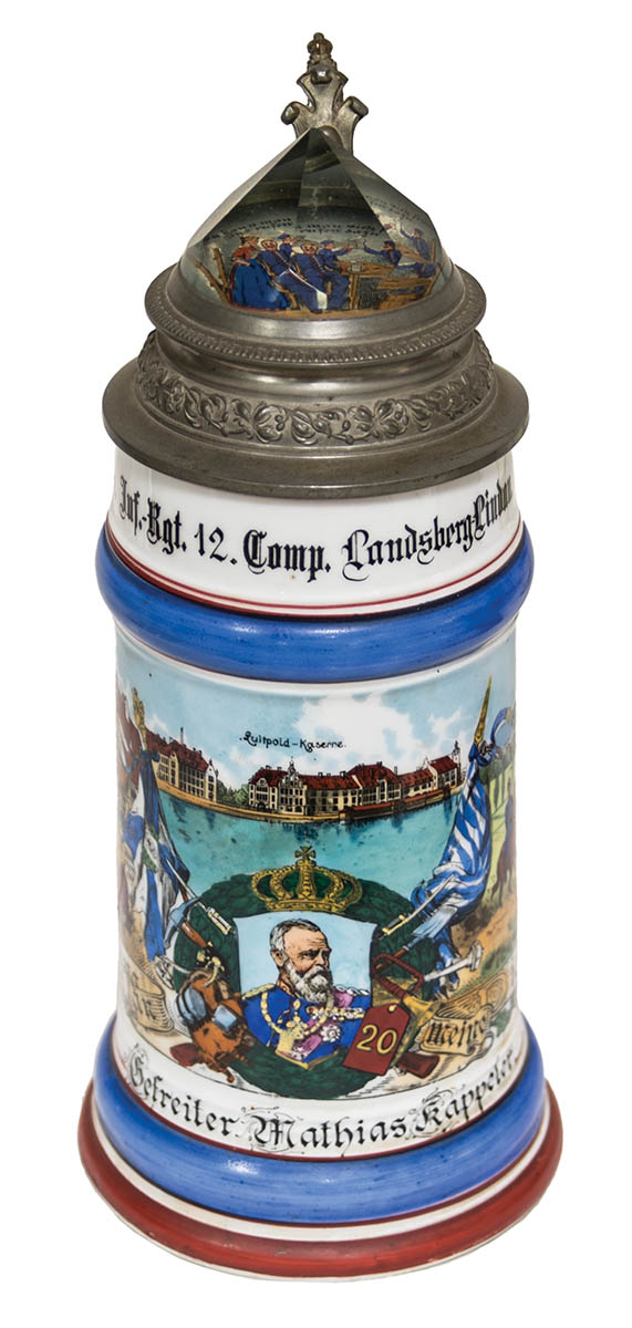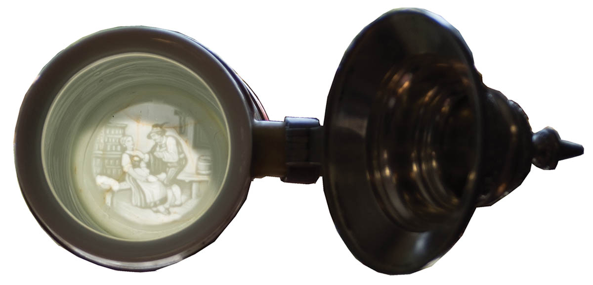 Decorated pewter tops, one dated “1902”, depicting Inf. regiment, 9 1/2″ h, bottom of portrait inside of Leopold in uniform; and a 12 1/2 liter stein, tradesman depicting a cartouche with carpenter’s tools, 9″ h, bottom with a risque scene of a man and a woman.