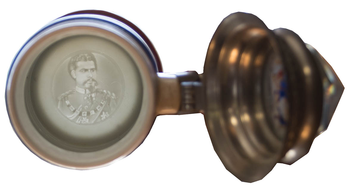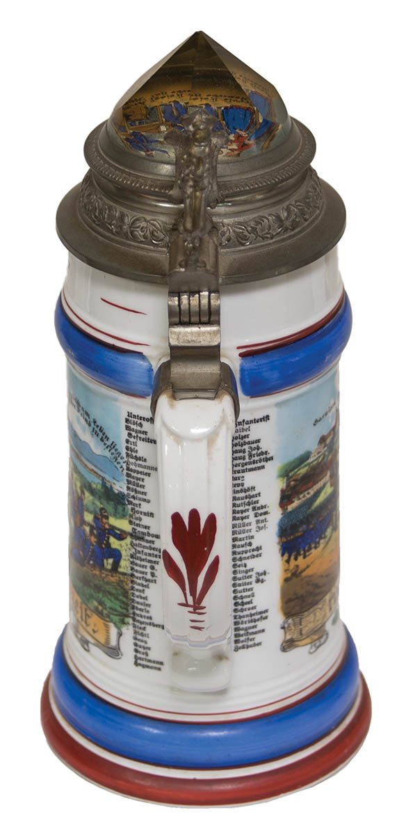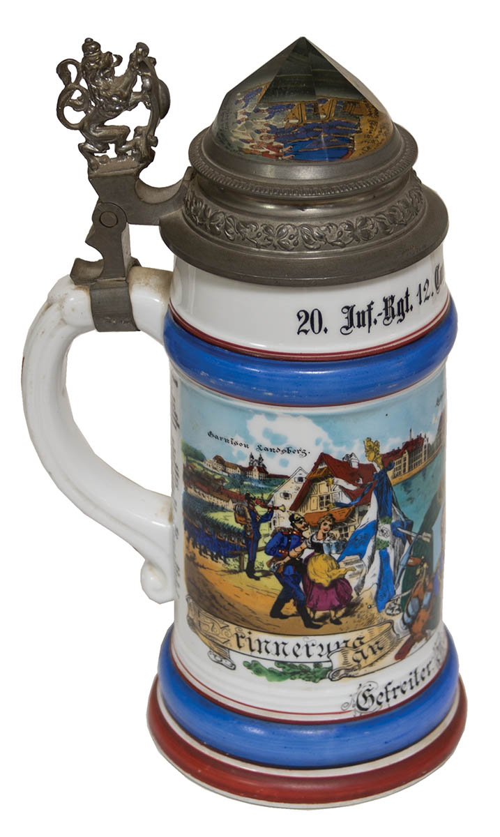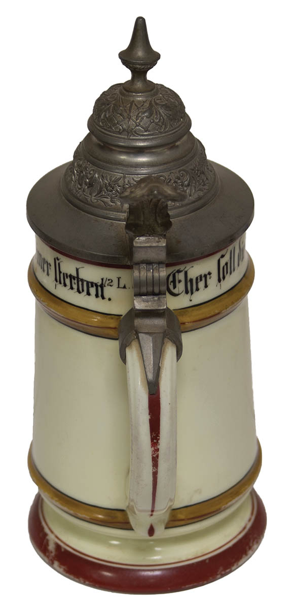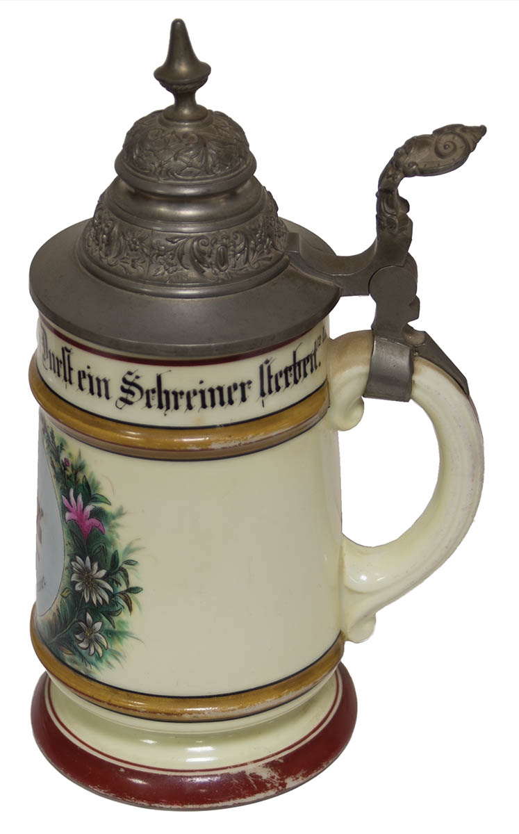 Decorated pewter tops, one dated “1902”, depicting Inf. regiment, 9 1/2″ h, bottom of portrait inside of Leopold in uniform; and a 12 1/2 liter stein, tradesman depicting a cartouche with carpenter’s tools, 9″ h, bottom with a risque scene of a man and a woman.