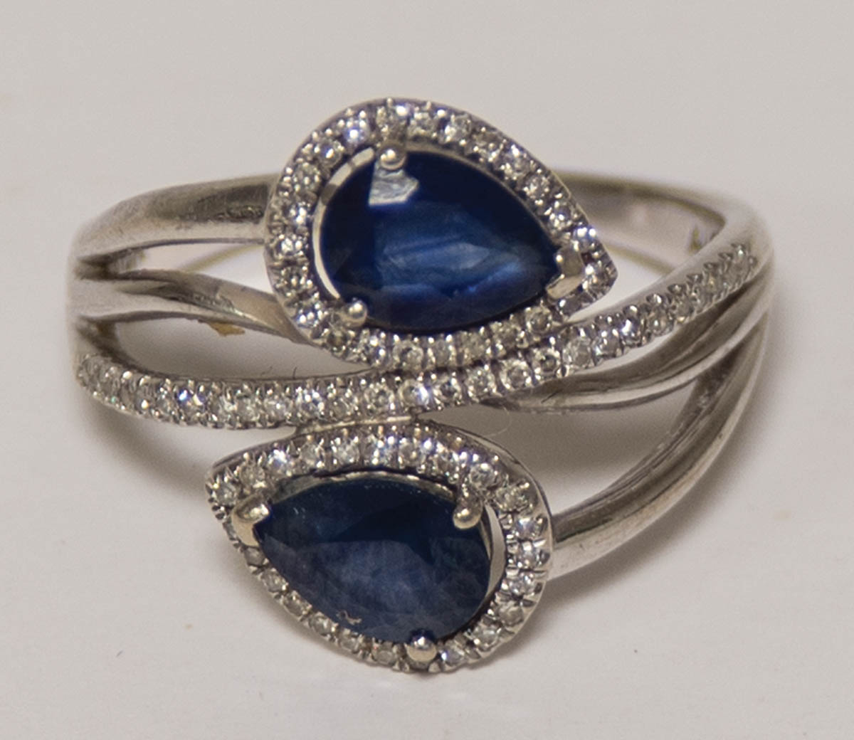 Two pear cut blue topaz, surrounded with diamond chips, size 7.