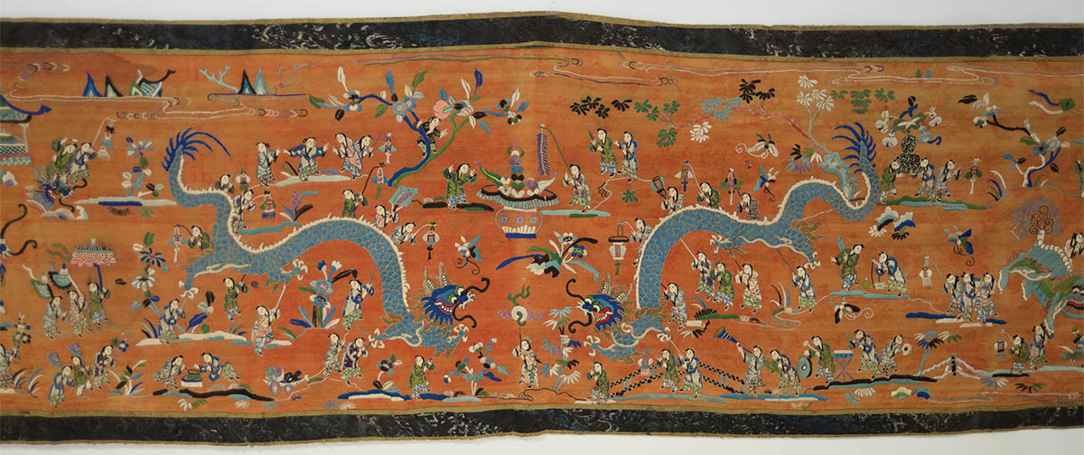 Altar cloth with metallic threads, silk on silk, a festival scene depicting a pair of confronting four-clawed blue dragons and many Buddhist symbols, flowers, trees and vines, lanterns, kites, musicians, attendants, appropriate wear for age, 14″ h, 5′ 6″ l.