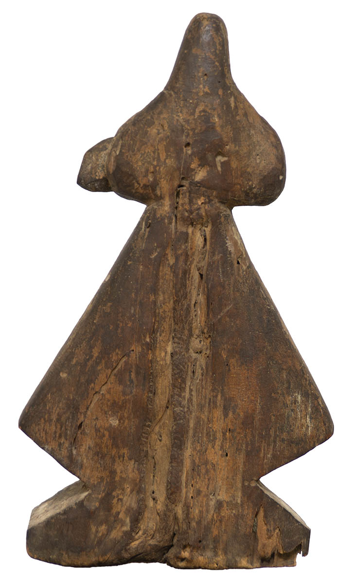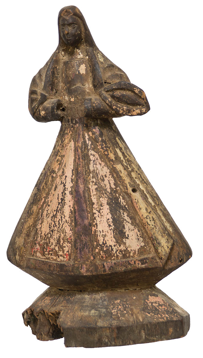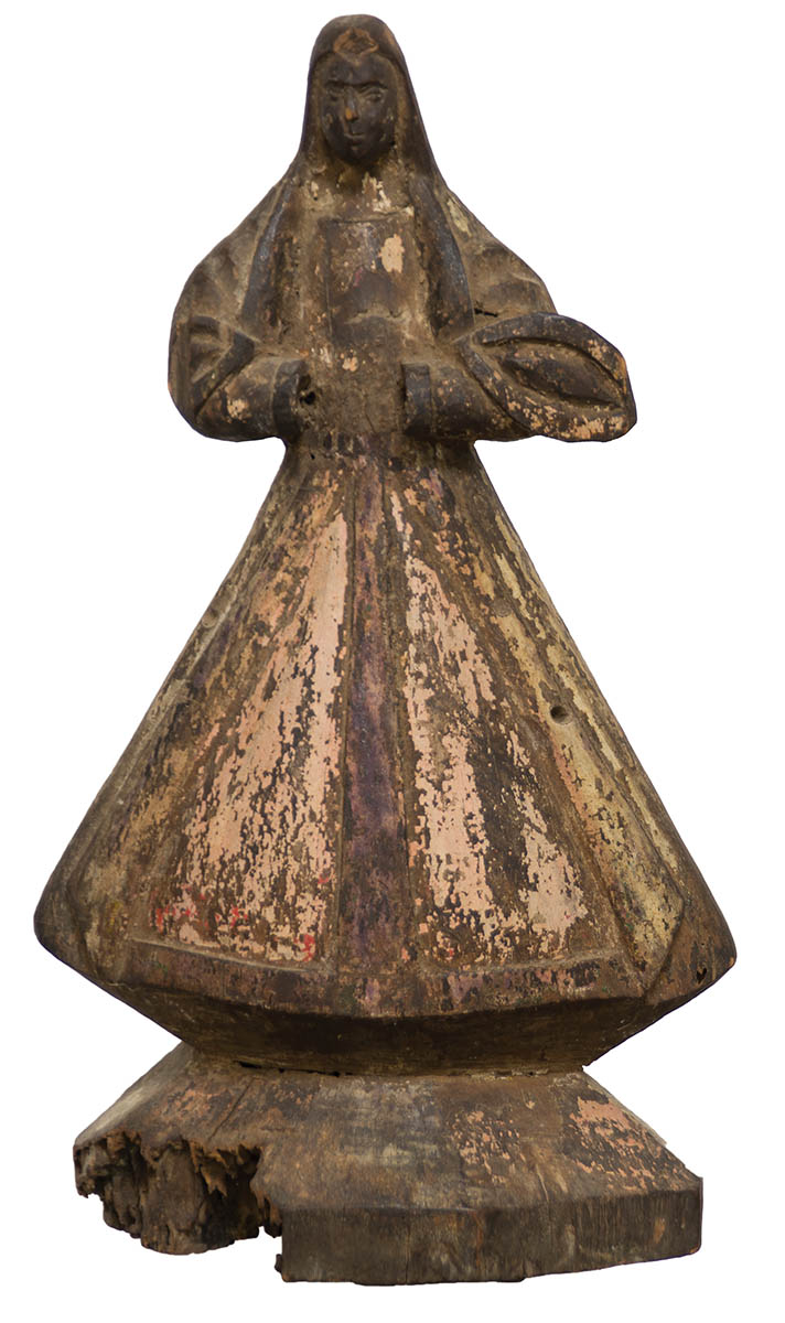 Very early carved Santos figure, remnants of original paint decoration, base shows wear, 14″ h.