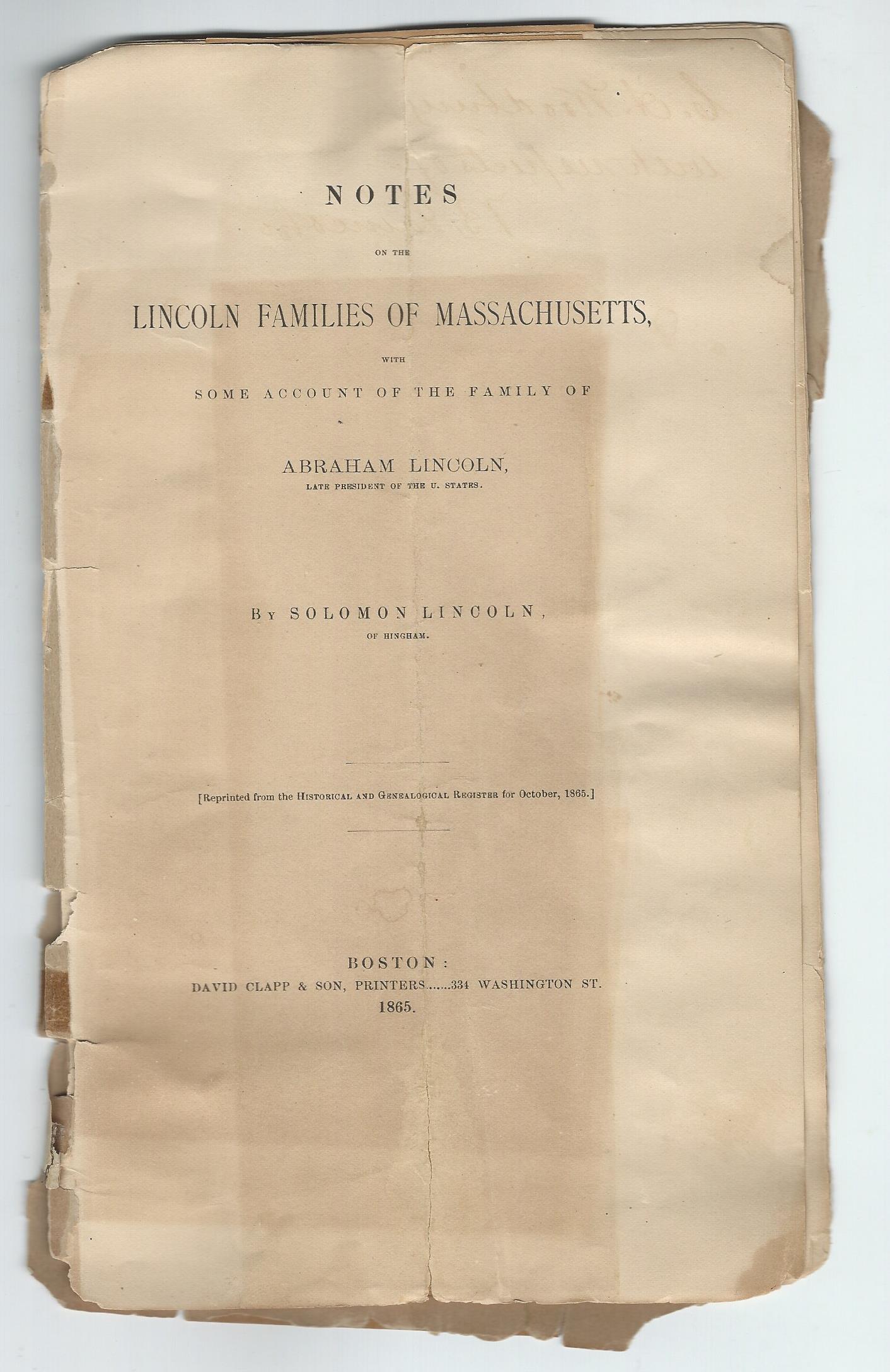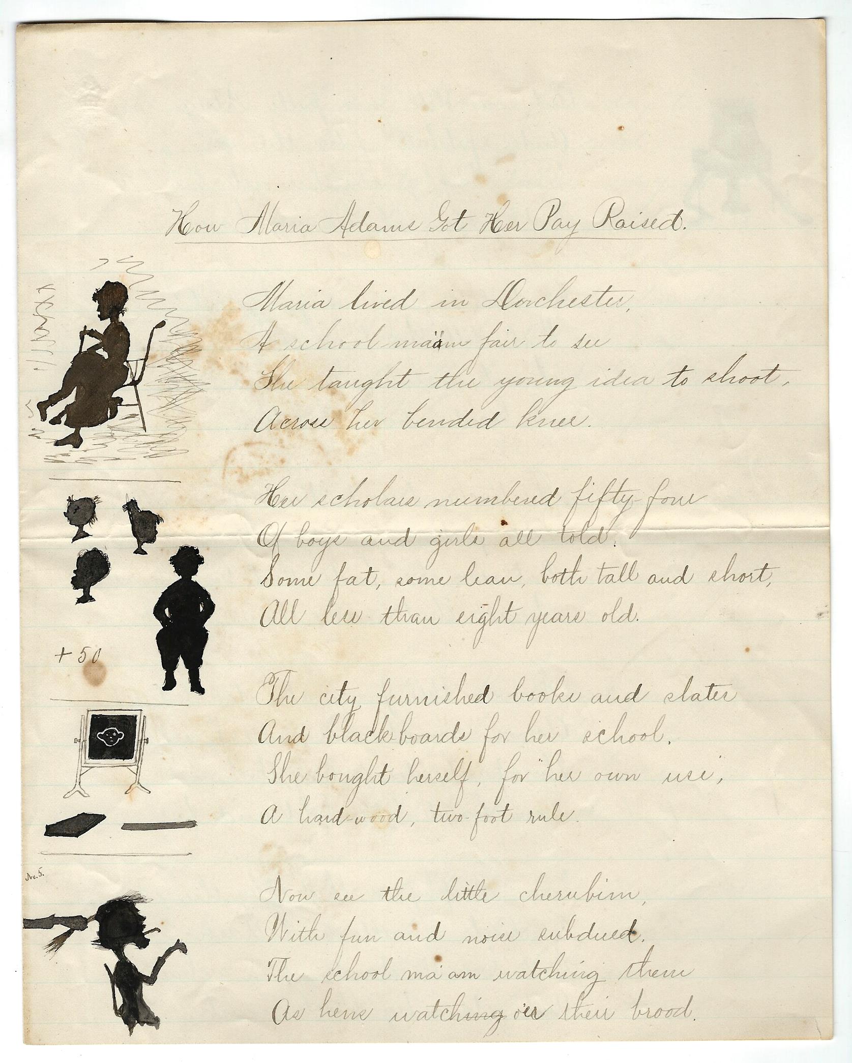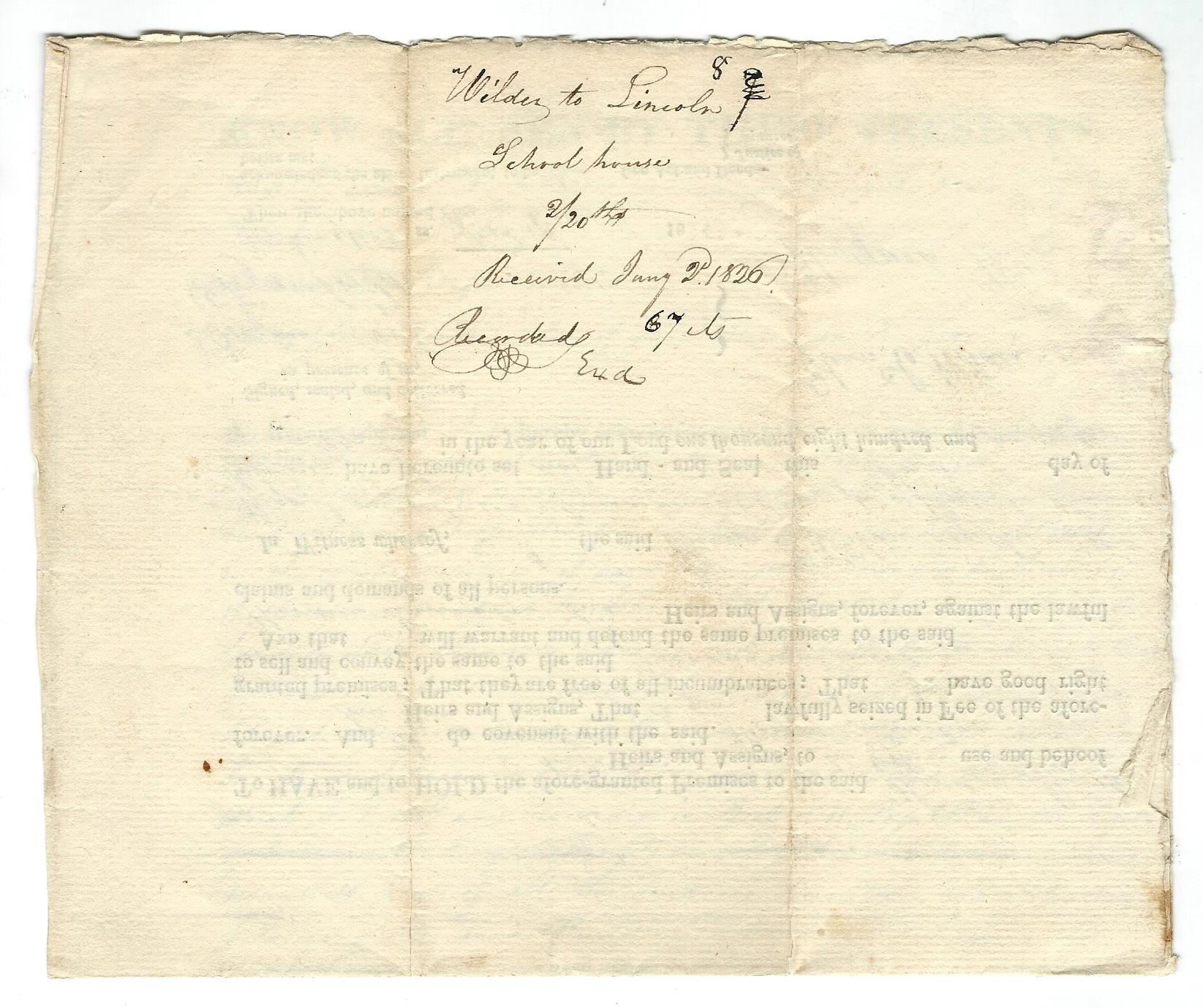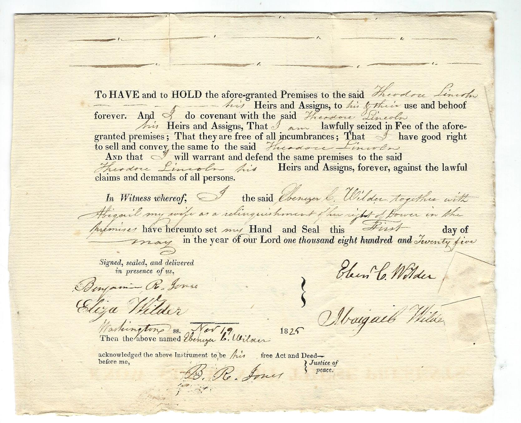 Rare history of the Lincoln Families, 1865, by Solomon Lincoln, paper cover, taped and folded, 10 pages, 10″ h x 6″ w; Deed for a School House in Dennysville, Maine, signed by Ebenezer Wilder, paid by Theodore Lincoln; Pen and ink, illustrated humorous poem on lined paper, “How Maria Adams got her pay Raised.”, dated Oct 7, 1883, (Maria lived in Dorchester).